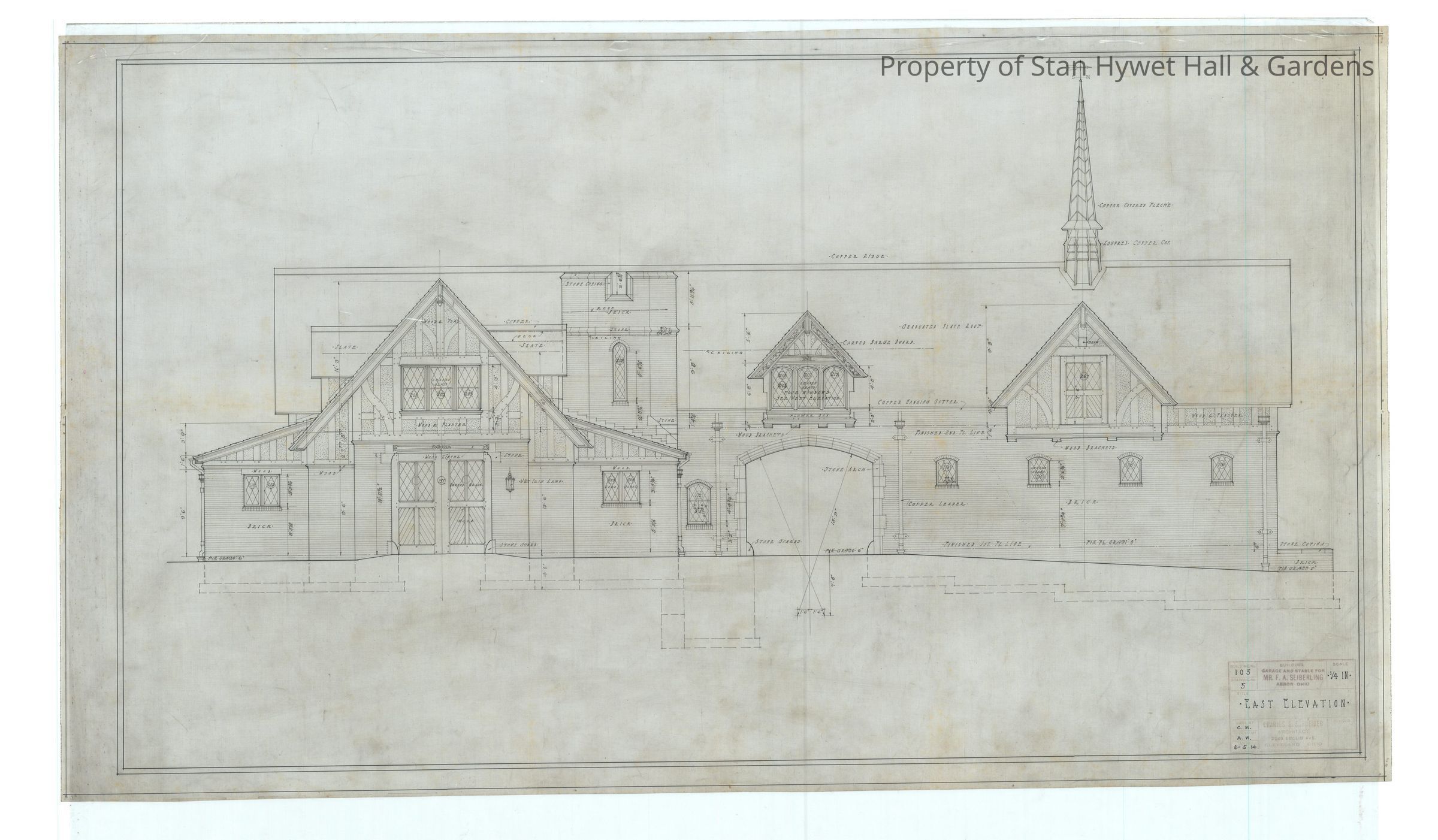 Historic blueprint: East elevation of the Carriage House on the Stan Hywet estate. Titled "East Elevation".