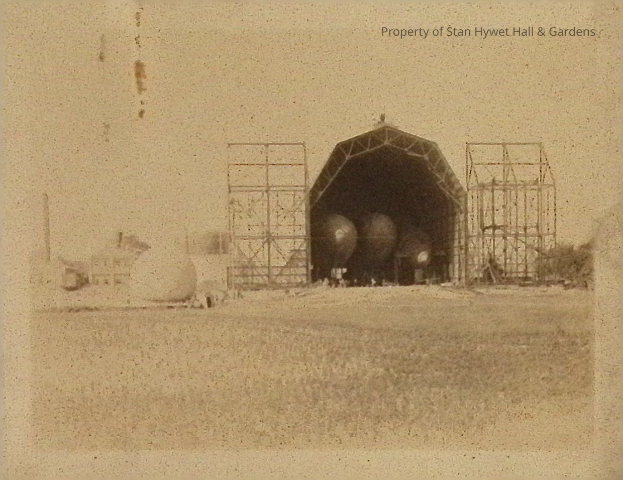 Print developed from gelatin dry plate glass negative. Wingfoot Lake dirigible air dock. View is facing main doors (open) and of portion of interior. Three dirigibles are visible inside air dock. Doors appear to be only frames with no metal or wood coverings. To left of air dock are buildings and circular structure. Grass and small foliage in foreground.Photograph Details