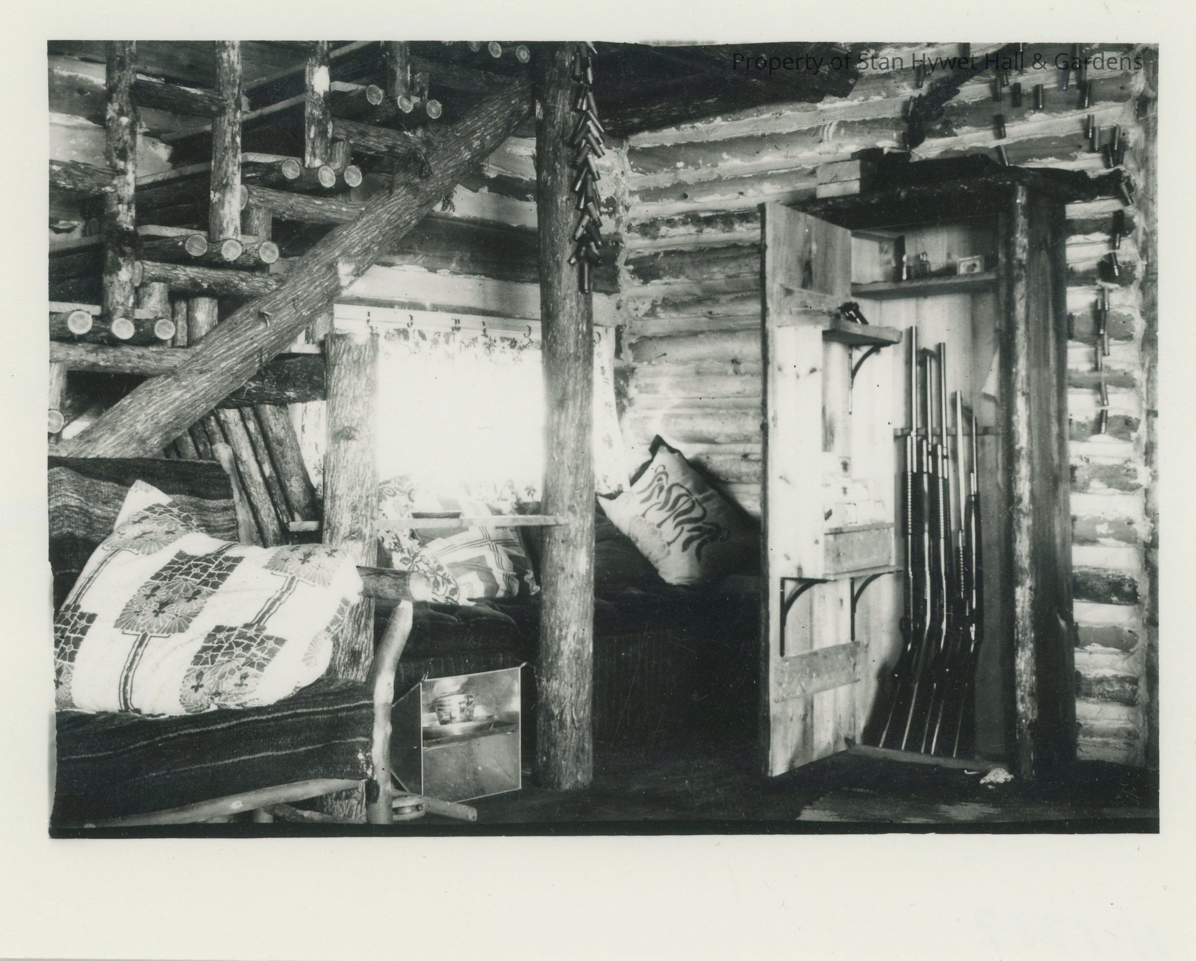 Black and White reproduction photograph of living room in the Shore Cabin at Cedar Lodge, with rustic stairs to second floor at left, built-in settee under window and an open cabinet at right with rifles inside.Photograph Details