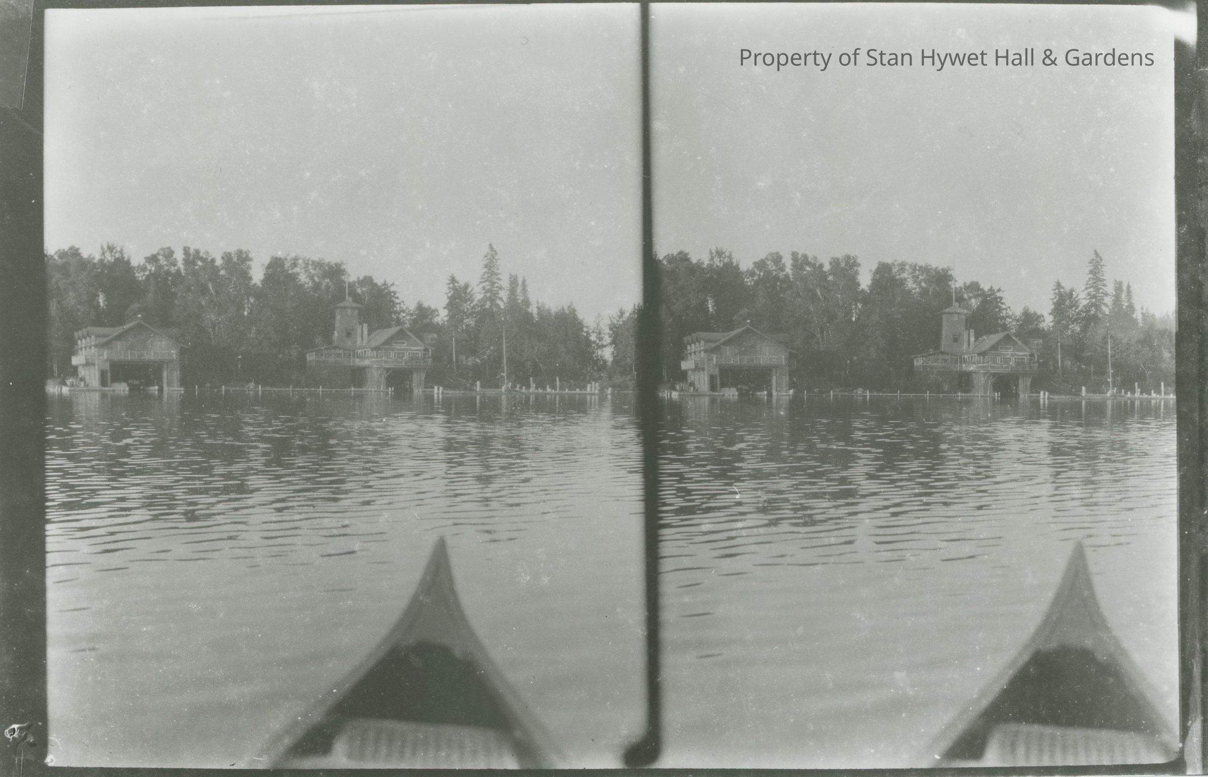 Black and white stereograph of the boathouses at Cedar Lodge with the Main Cabin in the background and the main dock in front as seen from the water. One launch docked, many fir trees around whole area. Water is very still and calm.Photograph Details