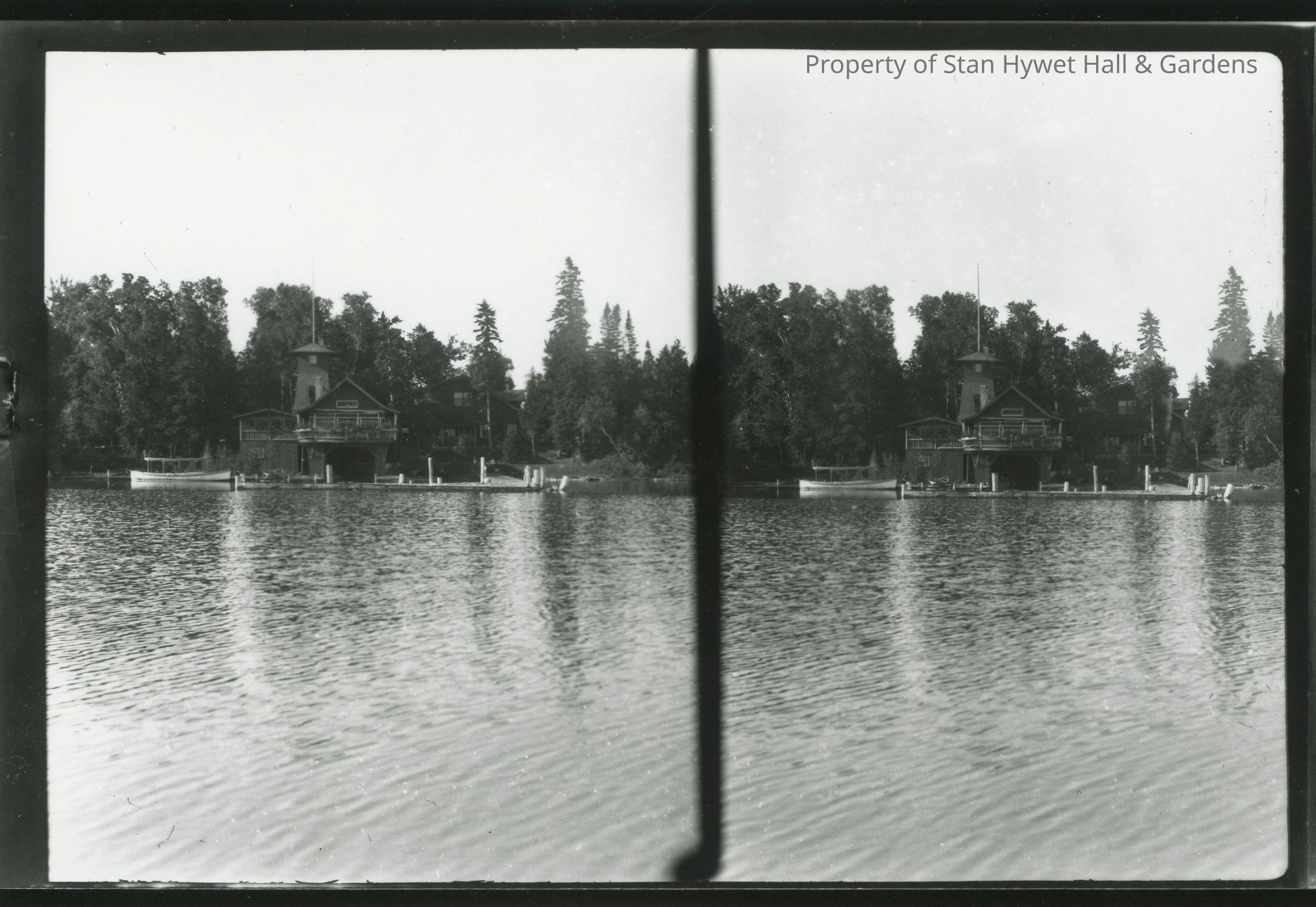 Black and white stereograph of the dock, one of the boathouses and the Main Cabin at Cedar Lodge as seen from the water. One launch is docked. Many trees in the background. Water is very still and calm.Photograph Details