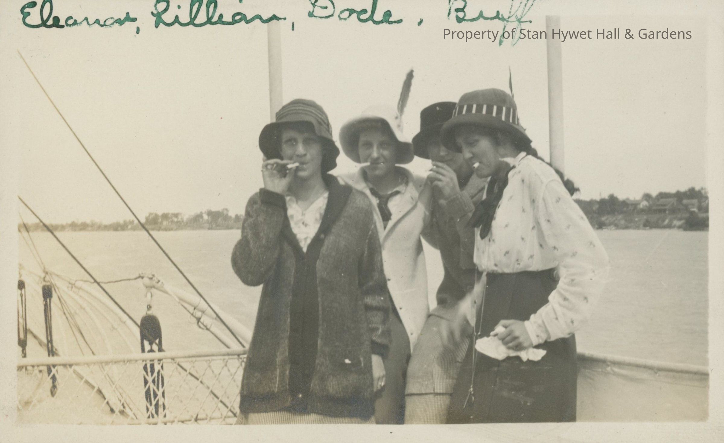 Black and white photographic print with white border. One of a series of 66 photos. Four girls aboard a large boat at railing, all with cigarettes and all in hats. Girl on left has right hand up to cigarette. Girl at right has cigarette in mouth, her right hand is blurred. She holds handkerchief in left hand. Shoreline in background. Hand written in green ink at top of photograph, "Eleanor, Lillian, Dode, Buff."Photograph Details