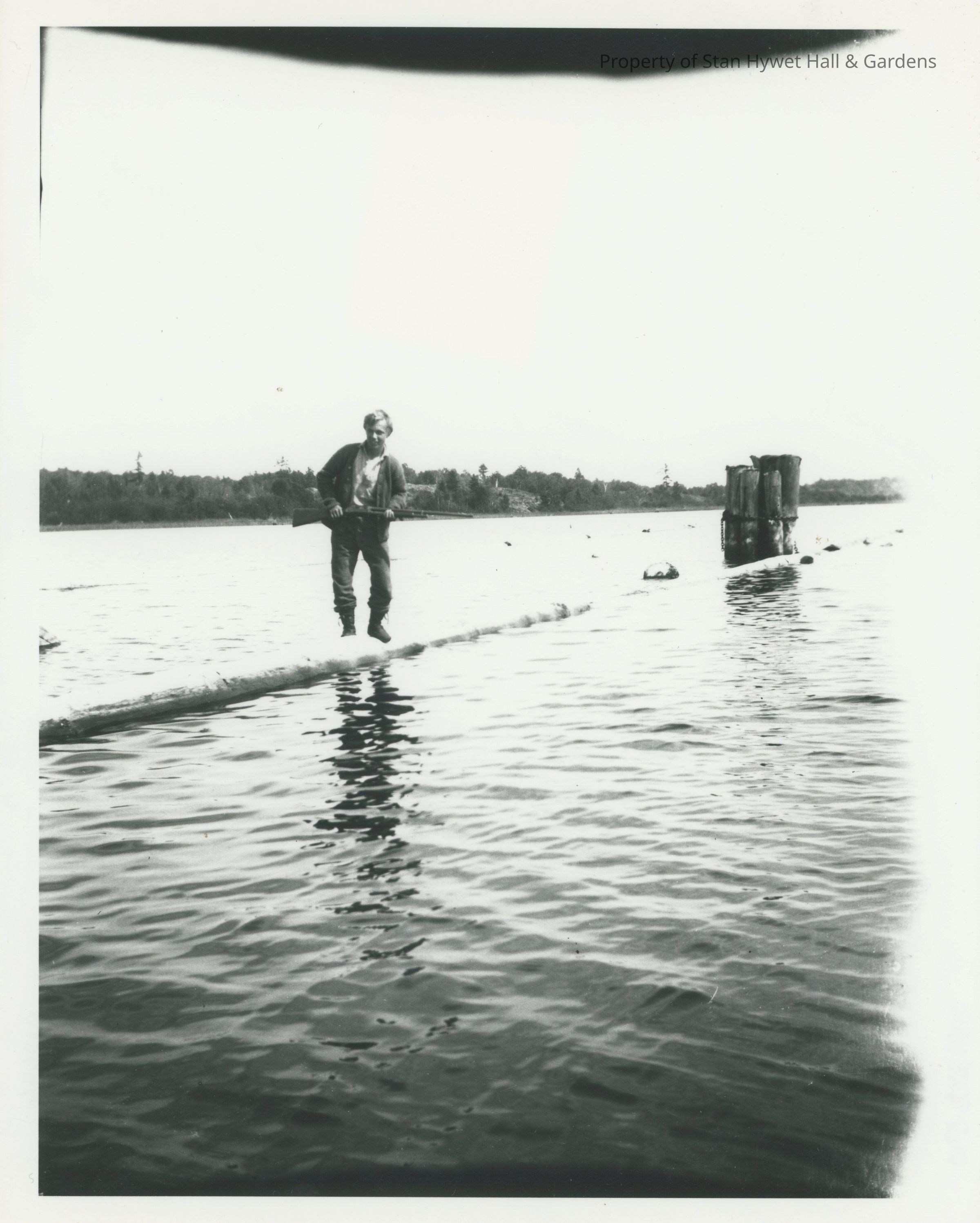 Fred Seiberling balancing on a log with a rifleEntry/Object ID