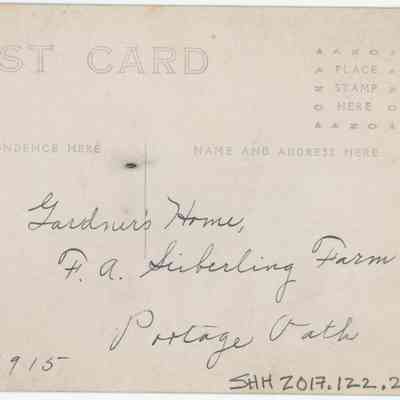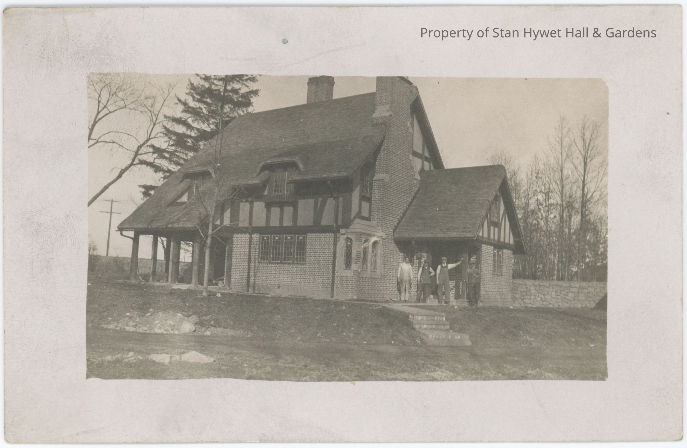 Black and white photo postcard of Stan Hywet Gate Lodge under construction with a very wide white border (1/2"). A view of the Gate Lodge with four workers standing in front of side entrance as viewed from the driveway, with some construction debris in the foreground. Hand written on the back "Gardener's Home,/ F.A. Seiberling Farm/ Portage Path/ May 8, 1915"Photograph Details