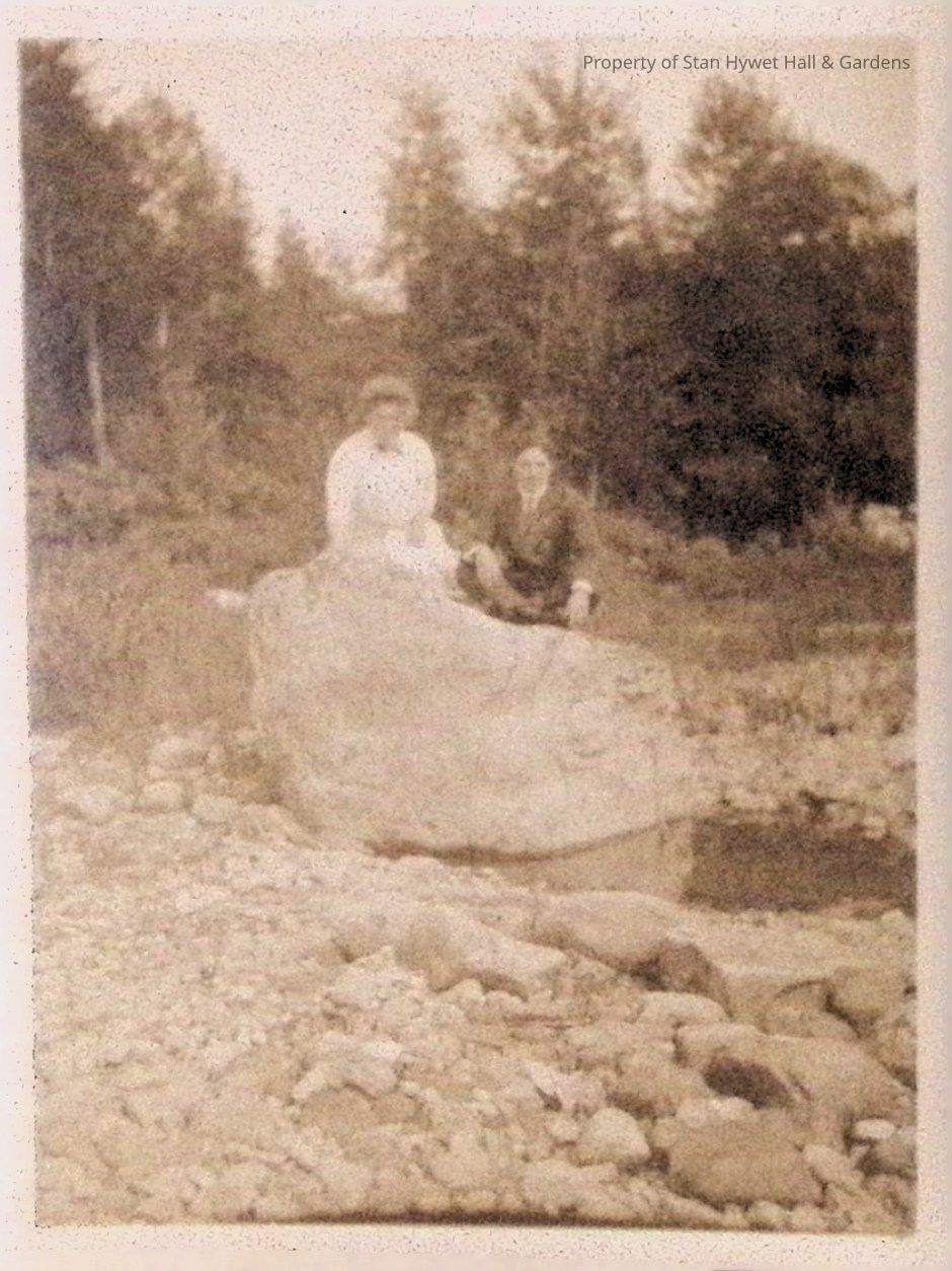 Black and white photographic print of Gertrude Seiberling and Cecil Fanning sitting on large bolder at the edge of Lake Huron with woods and brush in the background. Mrs. Seiberling at left wearing a light colored dress with a small dark tie at the neck. Mr. Fanning is sitting cross legged with his right arm resting on his right knee. Taken same time as SHH 11.1710.Photograph Details
