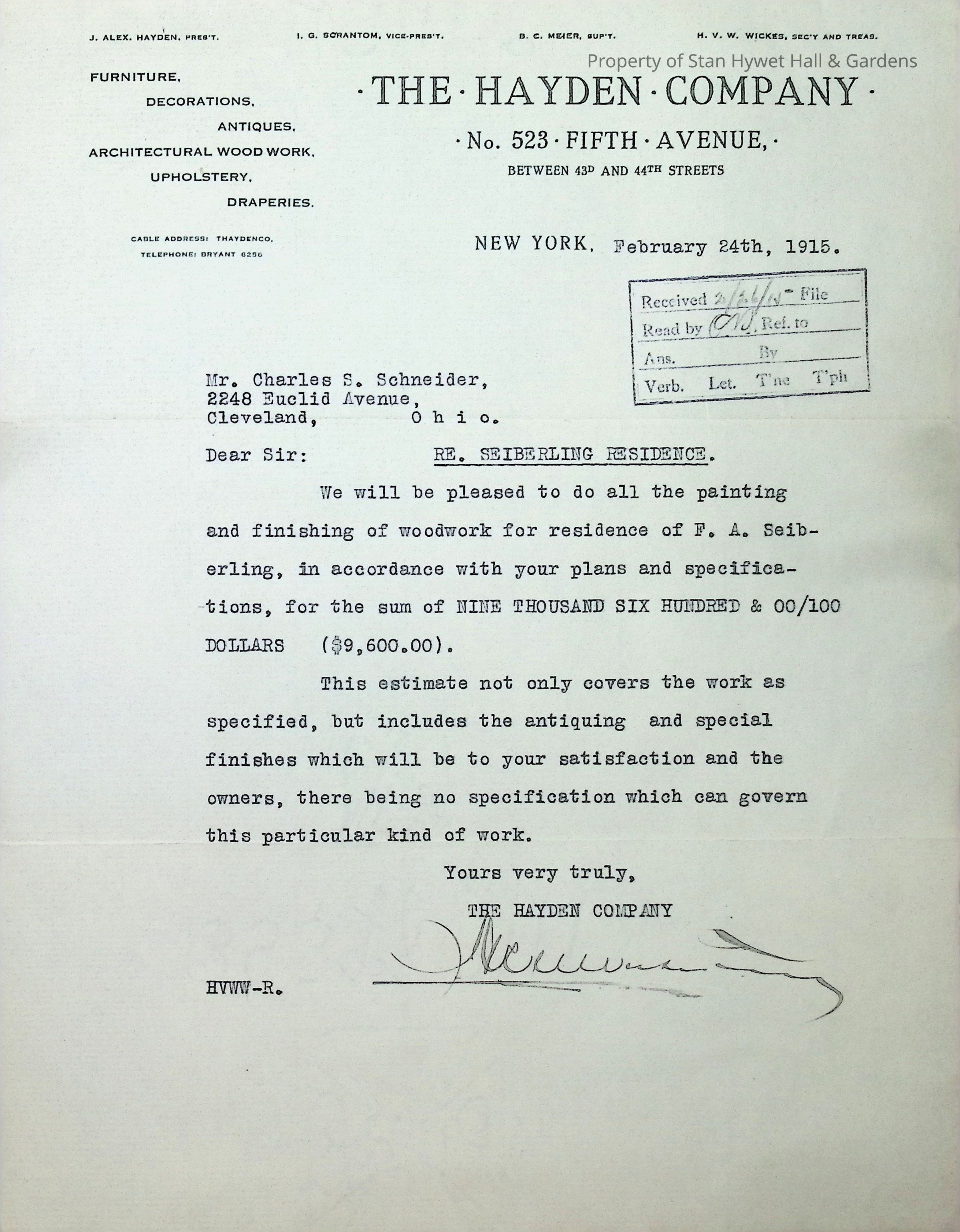 Typewritten letter from The Hayden Company accepting an offer from Charles S. Schneider to complete the painting and woodwork finishing for the residence of F.A. Seiberling for $9,600.00. Written on The Hayden Company letterhead and signed in pencil. Signature is illegible. Typed initials in lower left corner are HVWW. Top of letterhead indicates H. V. W. Wickes is the secretary and treasurer.Subject