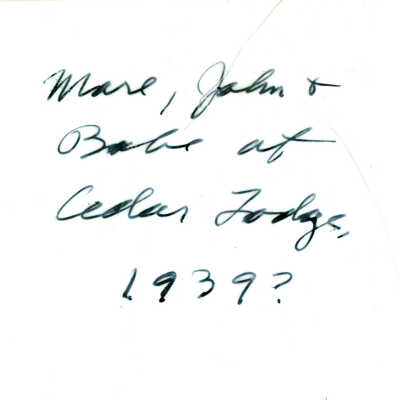 B&W photo (glossy with white border) of John F. Seiberling, Jr with his two sisters, Mary and Dorothy. They are standing together outside with Cedar lodge visible in the background. The girls are wearing shorts and polo shirts. In small print at the top border "NOV 79". Handwritten on the back in blue ink "Mare, John & Babe at Cedar Lodge, 1939?"Photograph Details
