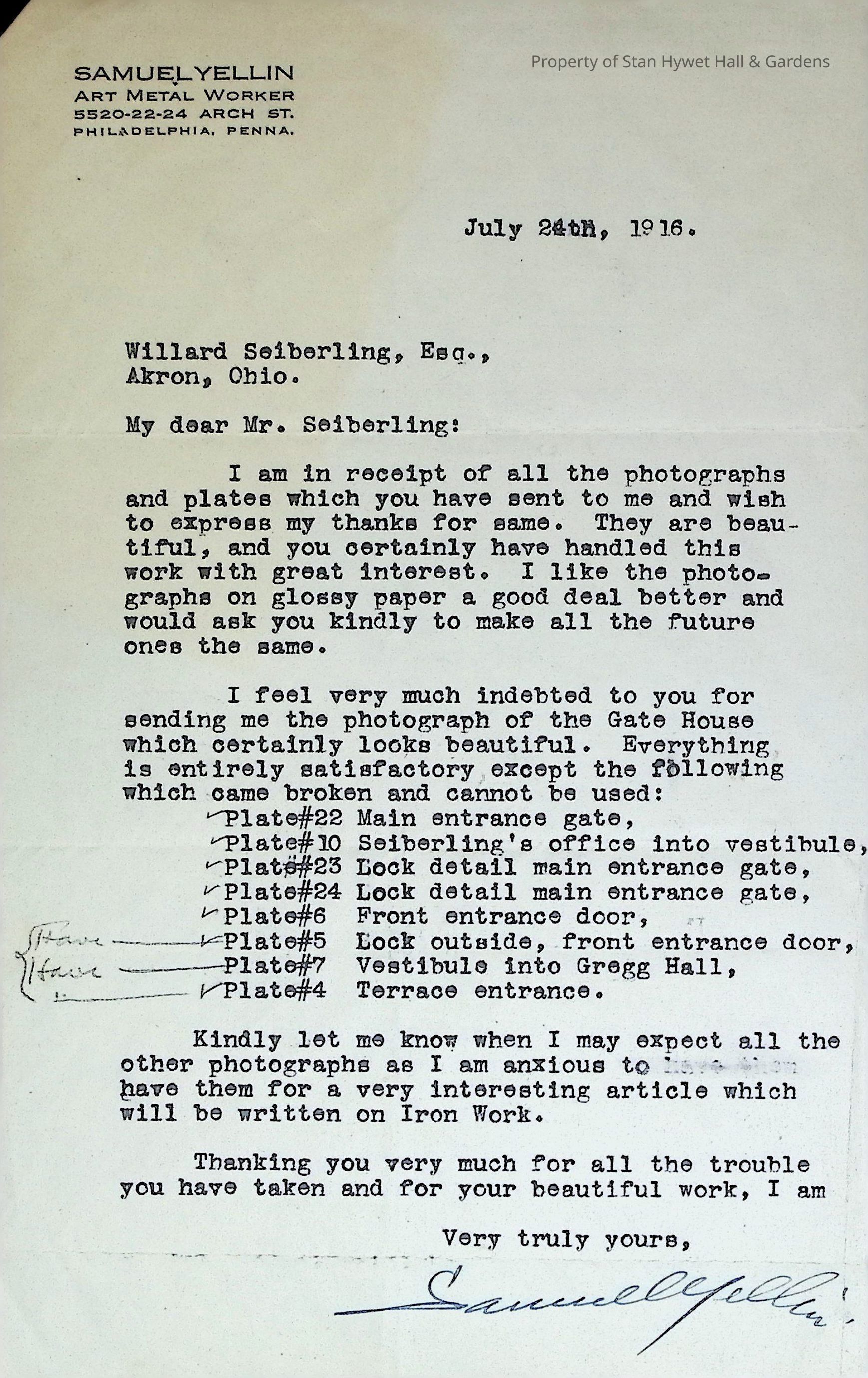 Typewritten letter from Samuel Yellin to Willard Seiberling acknowledging receipt of photographs and plates noting that several were received broken and requesting replacements. Written on Samuel Yellin letterhead and signed in pen.Subject