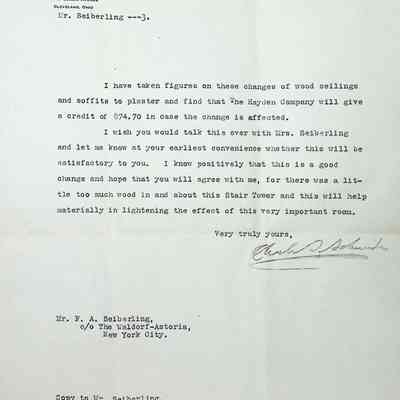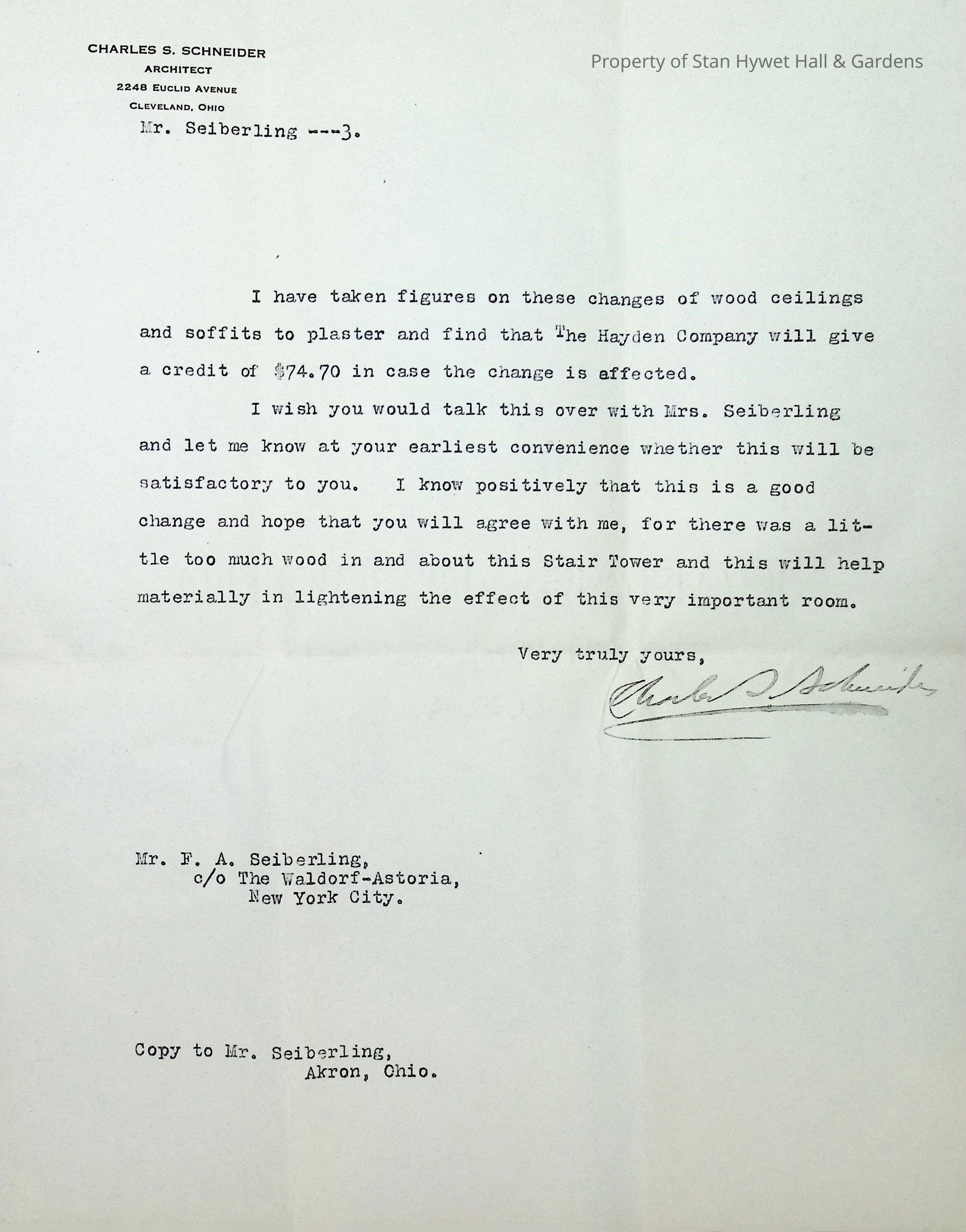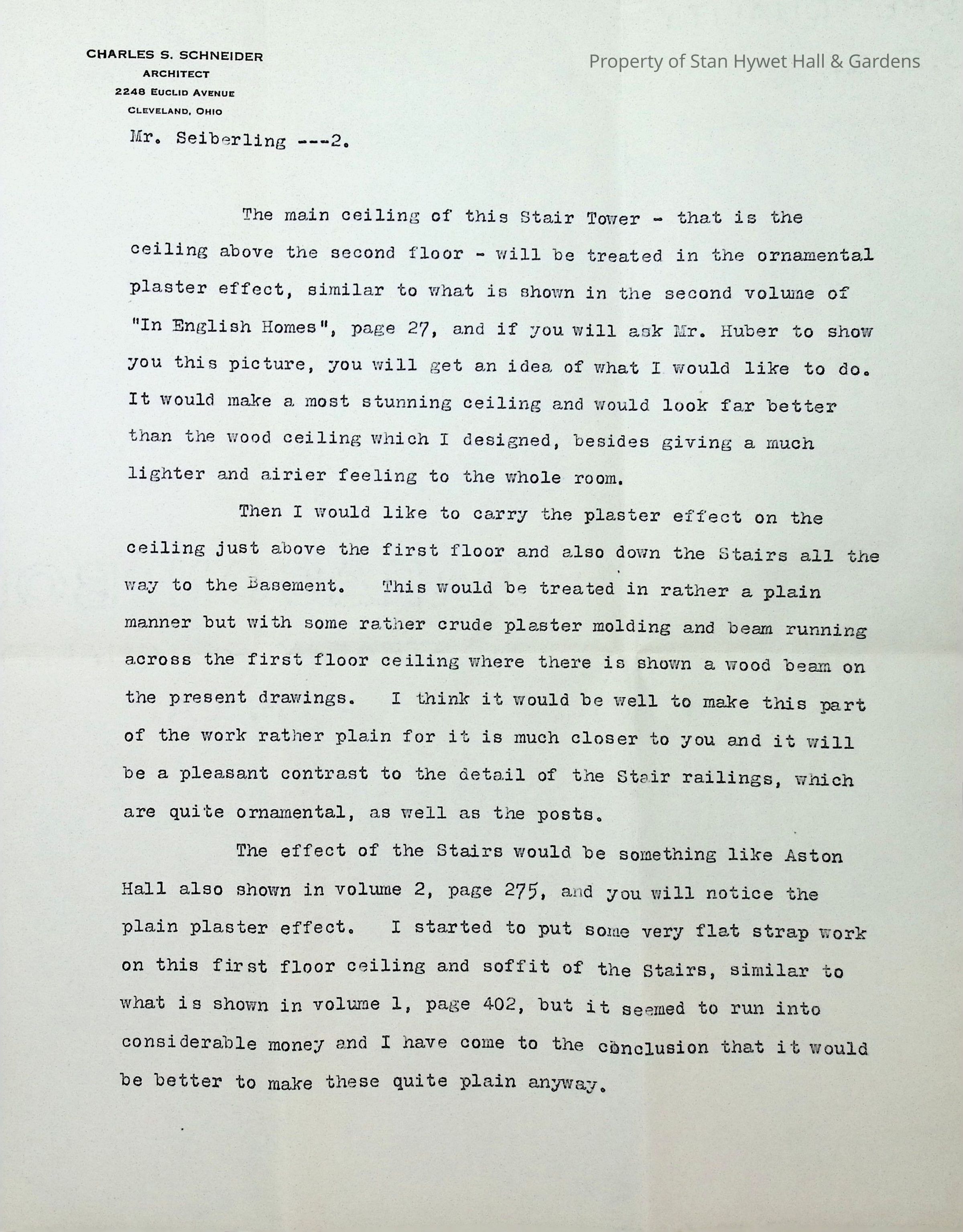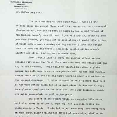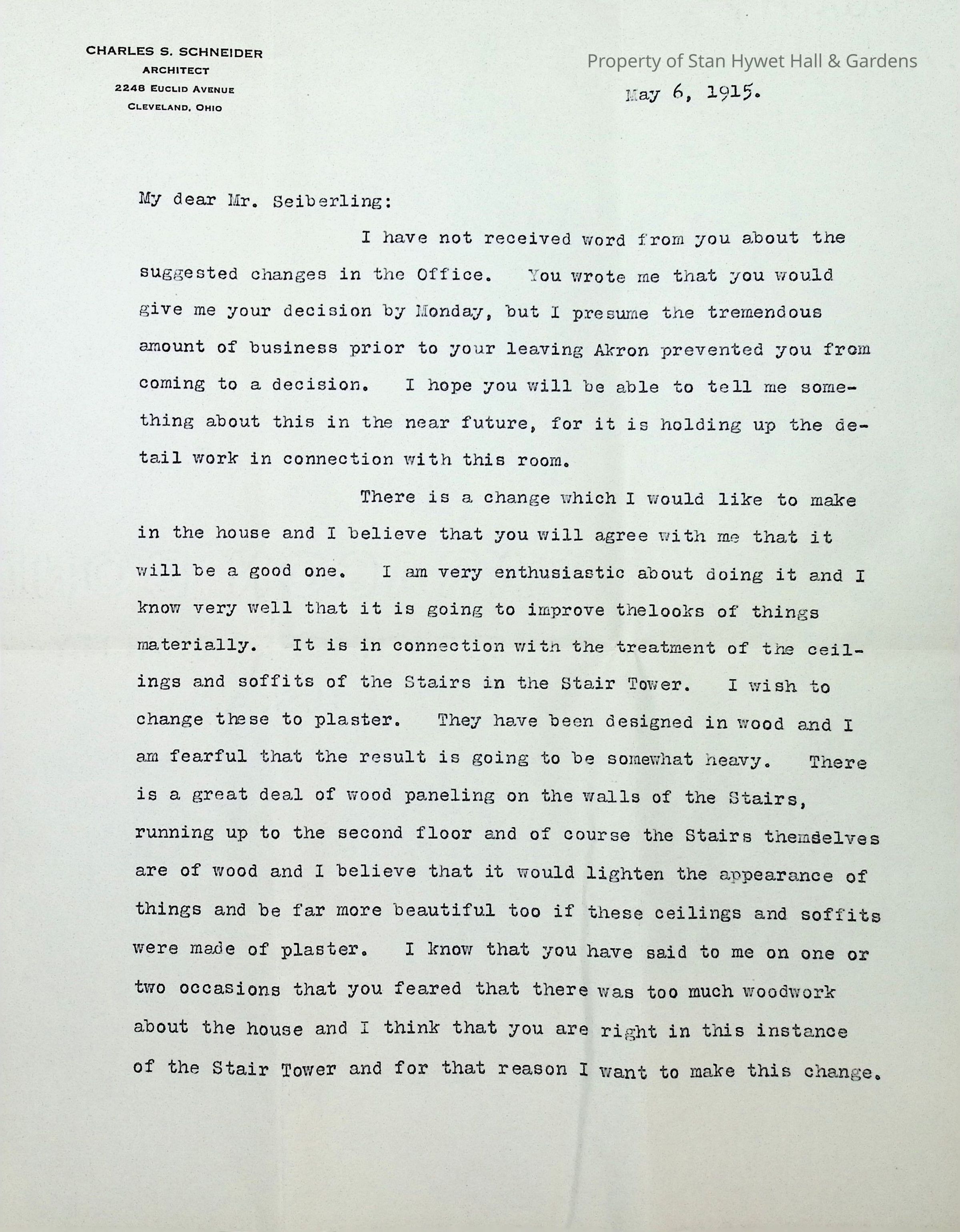 Typewritten letter on Charles S. Schneider letterhead, written to Mr. Seiberling and dated May 6, 1915 regarding design changes involving the construction of Stan Hywet Hall. He specifically mentions changing the ceiling of the Stair Tower to plaster from wood, thinking that the wood would be too heavy with all the paneling on the walls as well.Subject