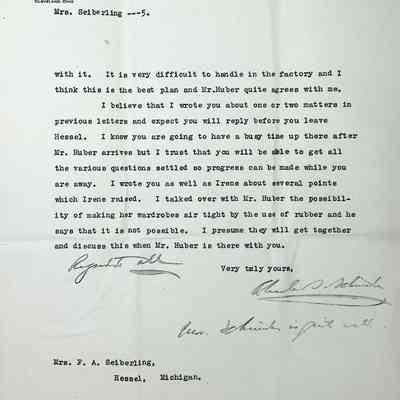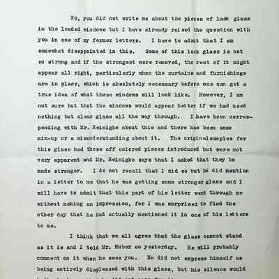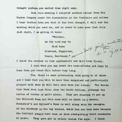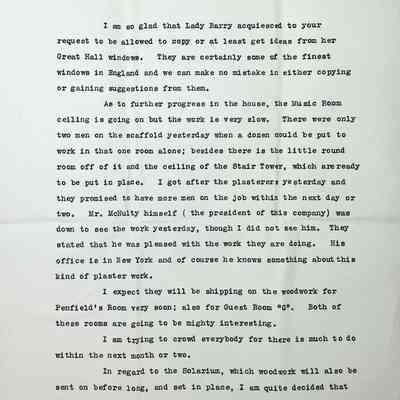 Typewritten 5 page letter on Charles S. Schneider letterhead from Charles Schneider to Gertrude Seiberling regarding andirons, fire screen and lanterns with no specifics on which room they were intended for. There is also confirmation from the Hayden company on the inscription in the entry hall, "Welcome as they need may be Find here Gladness, Happiness, Peace, Sanctuary." with a handwritten note from Schneider "Don't quite understand this. Is it right?" with an arrow pointed at Sanctuary. He is still awaiting a decision on the coat-of-arms. He states the Reception Room and North Gallery look fine "although the latter is quite plain." He also states they are starting on the Billiard Room and Frederick's and Willard's room is well along. He mentions his disappointment in the lack glass used in the windows, which he has mentioned in a previous letter and that if the "strongest" ones were removed, the rest might appear all right. He implies that he had spoken with Huber about it and his silence indicated he did not care for it either. He mentions he is glad Lady Barry allowed the Great Hall windows to be copied. The Music Room ceiling is going on but work is very slow. He is expecting the woodwork for Penfield's room and guest room "G" to be sent soon. The Solarium woodwork will also be sent before long. He mentions that he is awaiting response on several matters and hopes Gertrude can reply before she leaves Hessel, knowing she will be busy with Huber visiting. A last note is mentioned about a discussion with Huber about Irene's request to make her wardrobes air tight with rubber but Huber says that is not possible. Signed in pen "Regards to all, Charles S. Schneider with an illegible message below.Subject