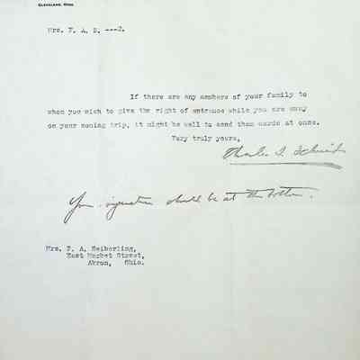 Typewritten 2 page letter on Charles S. Schneider letterhead from Charles Schneider to Gertrude Seiberling regarding a security system for the property during construction consisting of color coded cards to be given out based on the access being given. He indicates that he explained the same to Mr. Seiberling. It is signed in black pen with a handwritten line below "Your signature should be at the bottom."Subject