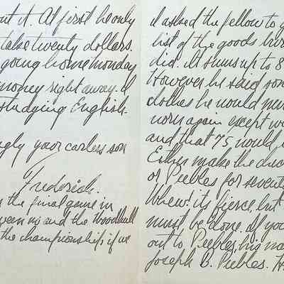I asked the fellow to give me a list of the goods burned and he did. It sums up to 89 dollars. However, he said some of the clothes he would never have worn again except when camping and that 75 would be all right. Either make the check out to me or Peebles for seventy five dollars. Whew! it’s fierce, but I suppose it must be done. If you make it out to Peebles, his name is Joseph B. Peebles. He is mighty decent about it. At first he only wanted to take twenty dollars. Peebles is going home Monday so send the money right away. I ought to be studying English.