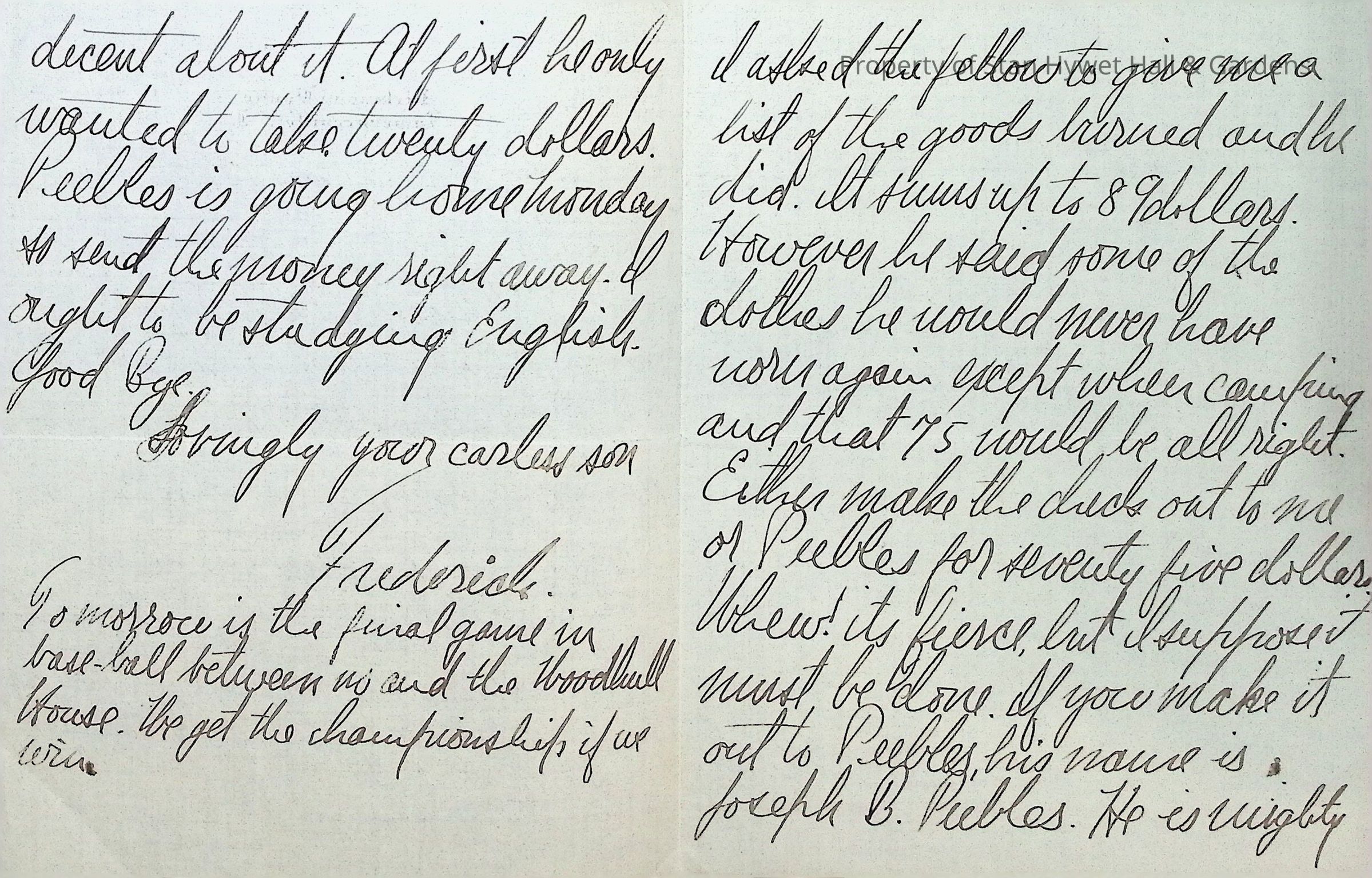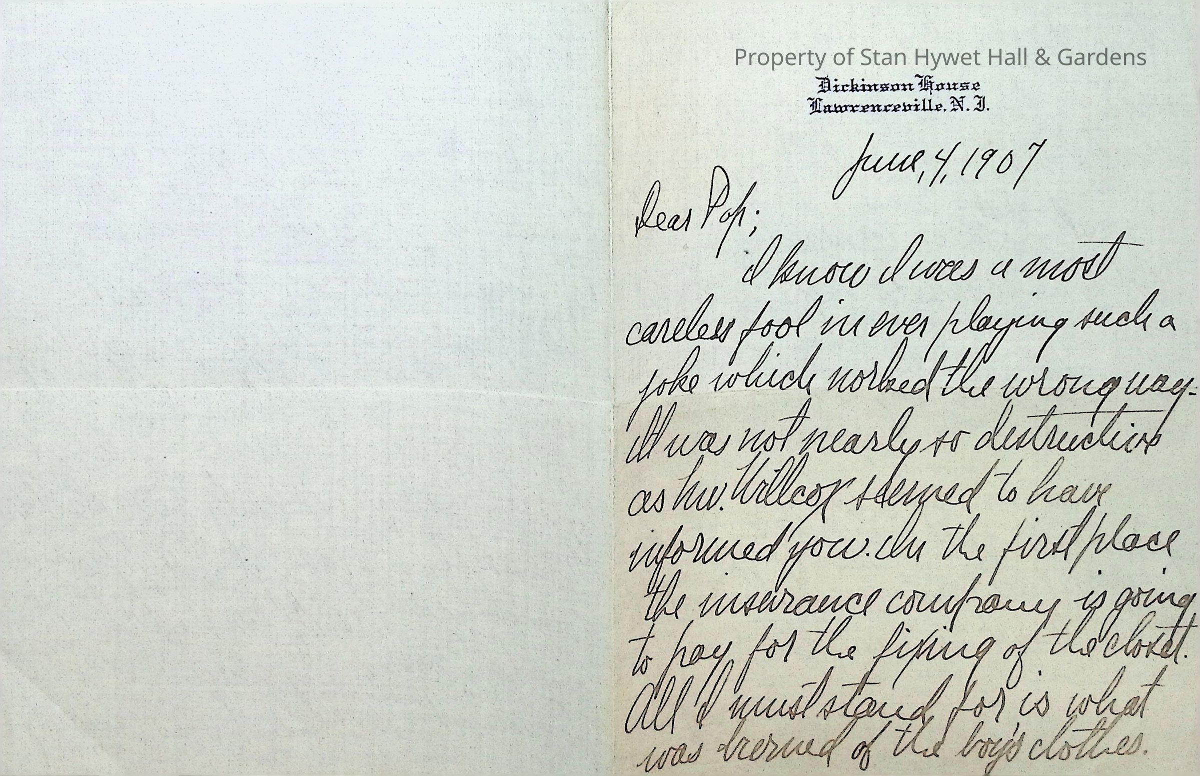 Handwritten letter from Fred Seiberling to F.A. Seiberling on Dickinson House stationary at Lawrenceville, NJ., 2 pages Addressed "Dear Pop." The letter explains an incident which happened as a result of a practical joke gone wrong which resulted in the damage of a closet and a student's clothes being burned for the sum of $89 although he would accept $75 because there are some he never planned to wear again. Fred ends the letter with a line about an upcoming football game between "us and Woodhall House" for the championship.Subject Person/Organization