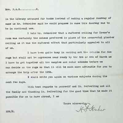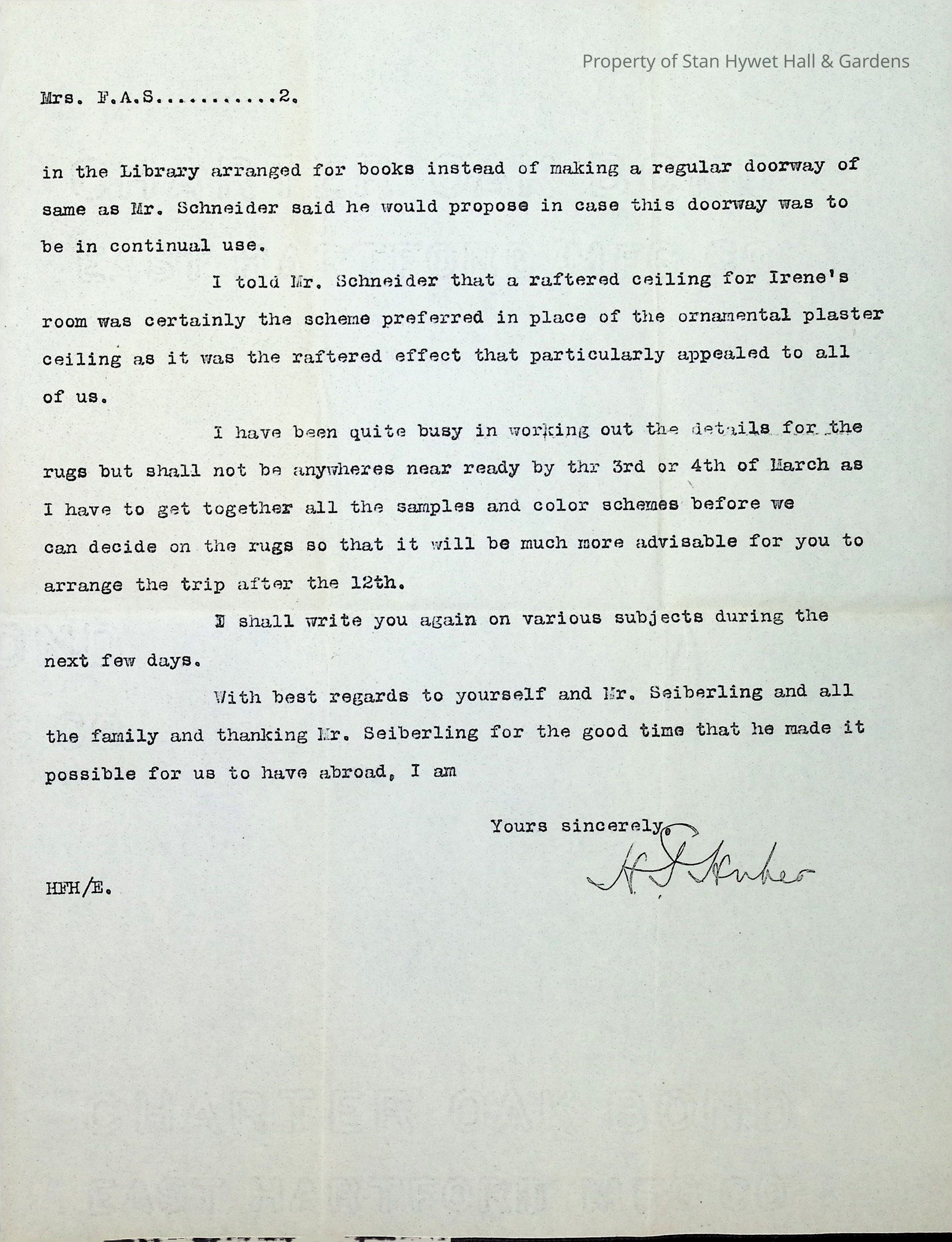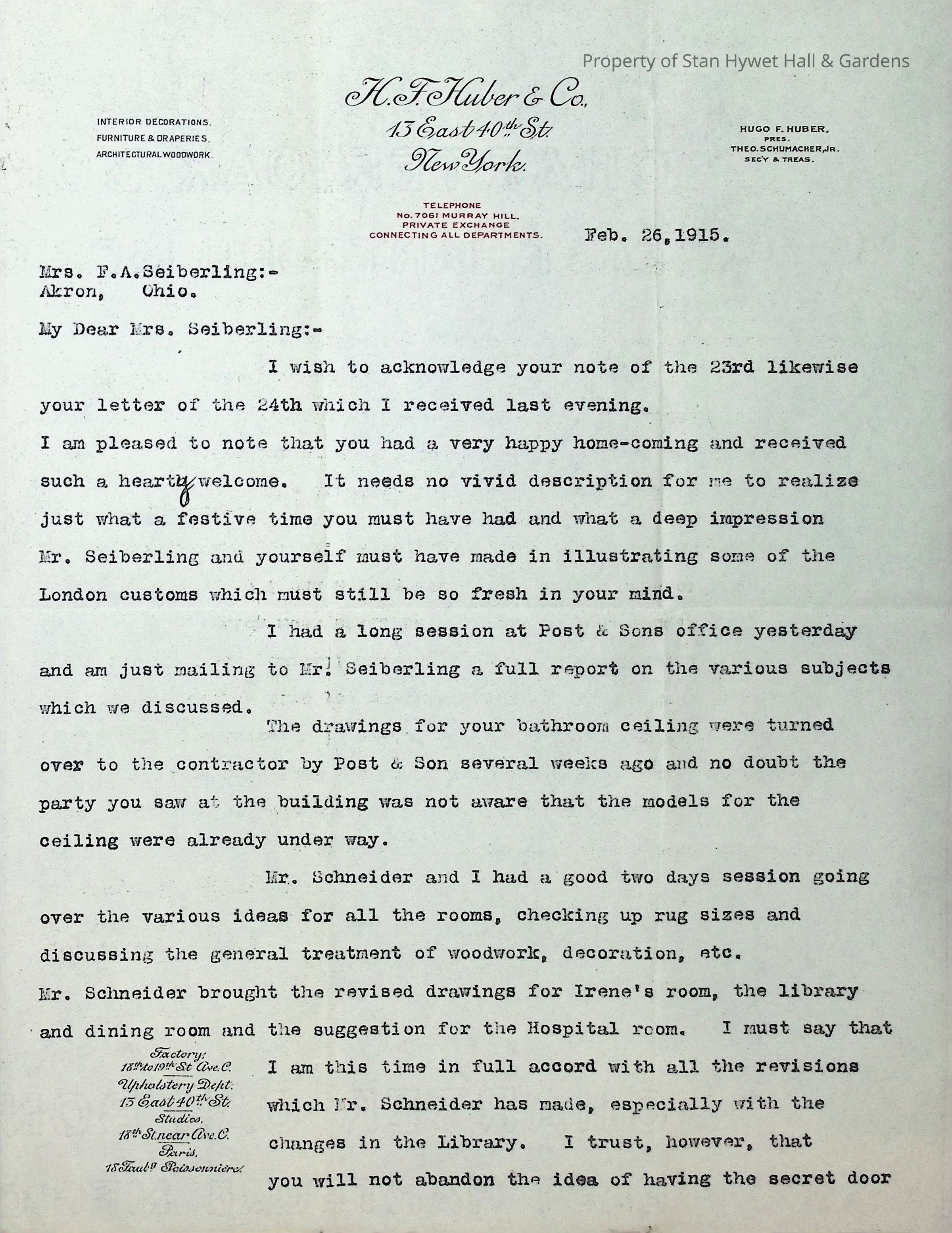 Typewritten letter on H.F. Huber & Co. letterhead, written to Mrs. F.A. Seiberling in Akron OH and dated Feb. 26, 1915 regarding several design changes and updates regarding the construction of Stan Hywet Hall, specifically mentions the secret door in the Library, the ceiling in Irene's room, and the ceiling of Gertrude's bathroom. He also mentions not being ready to discuss rugs yet.Subject