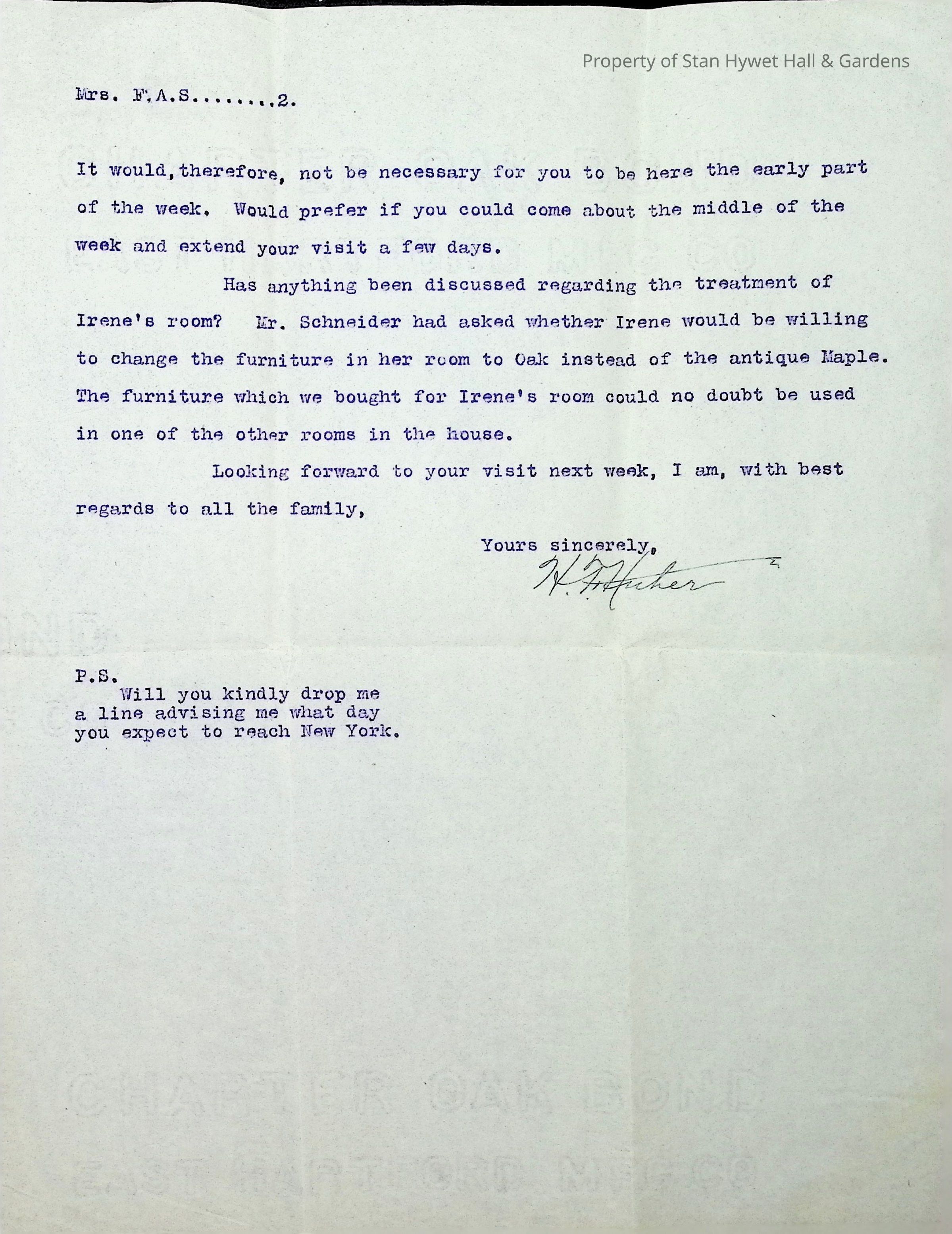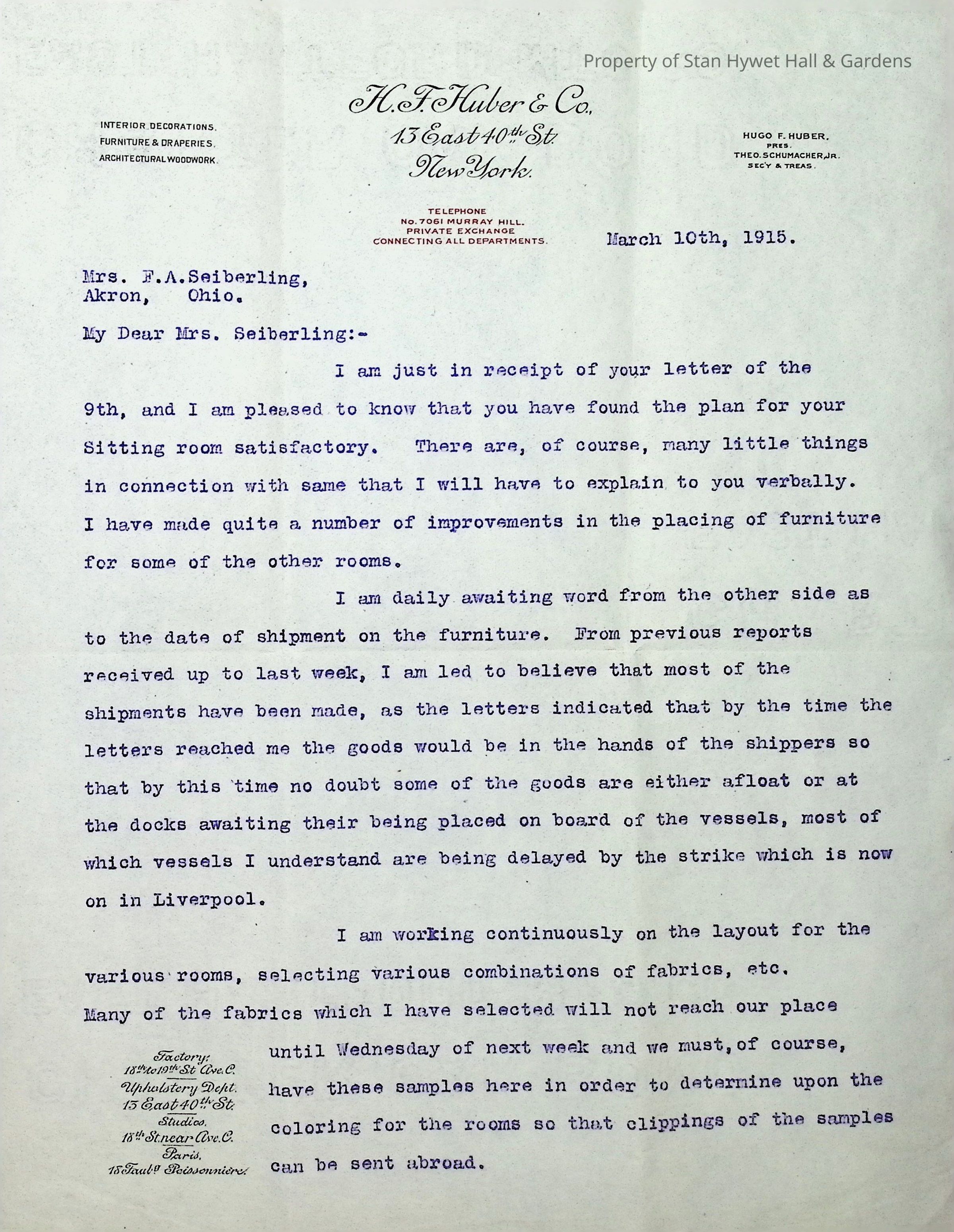 Typewritten letter on H.F. Huber & Co. letterhead, written to Mrs. F.A. Seiberling in Akron Ohio and dated March 10th, 1915 regarding design details for the construction of Stan Hywet Hall, specifically the approval of the changes to the sitting room furniture layout which appears to be the Morning Room. He discusses furniture shipments and mentions that the strike in Liverpool may impact deliveries. He also mentions gathering samples for several rooms and asks about the change of furniture in Irene's room.Subject
