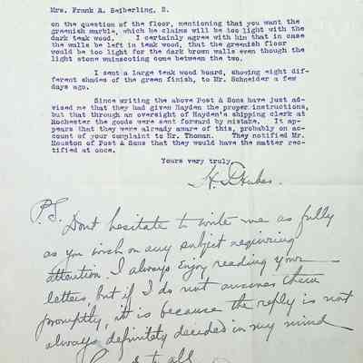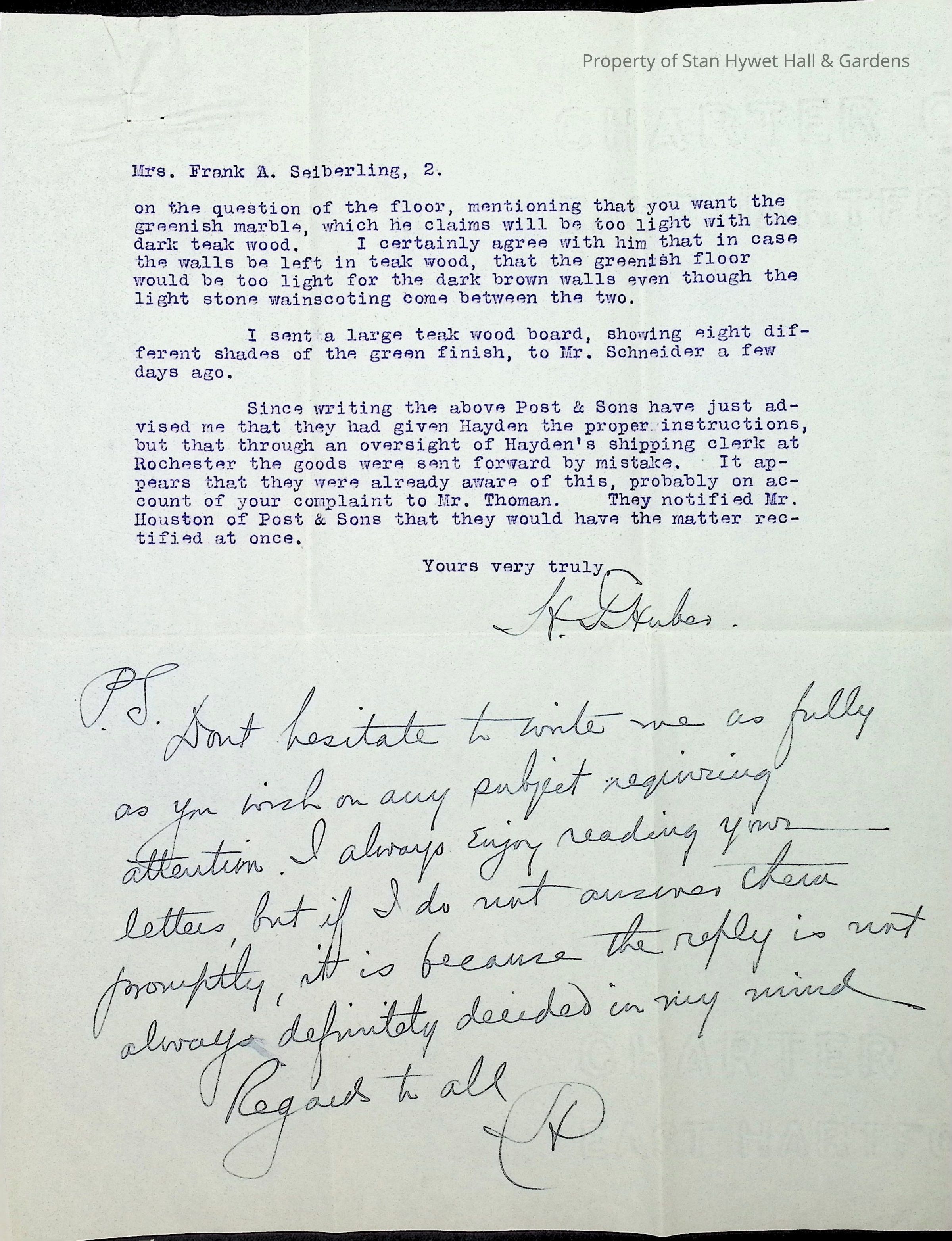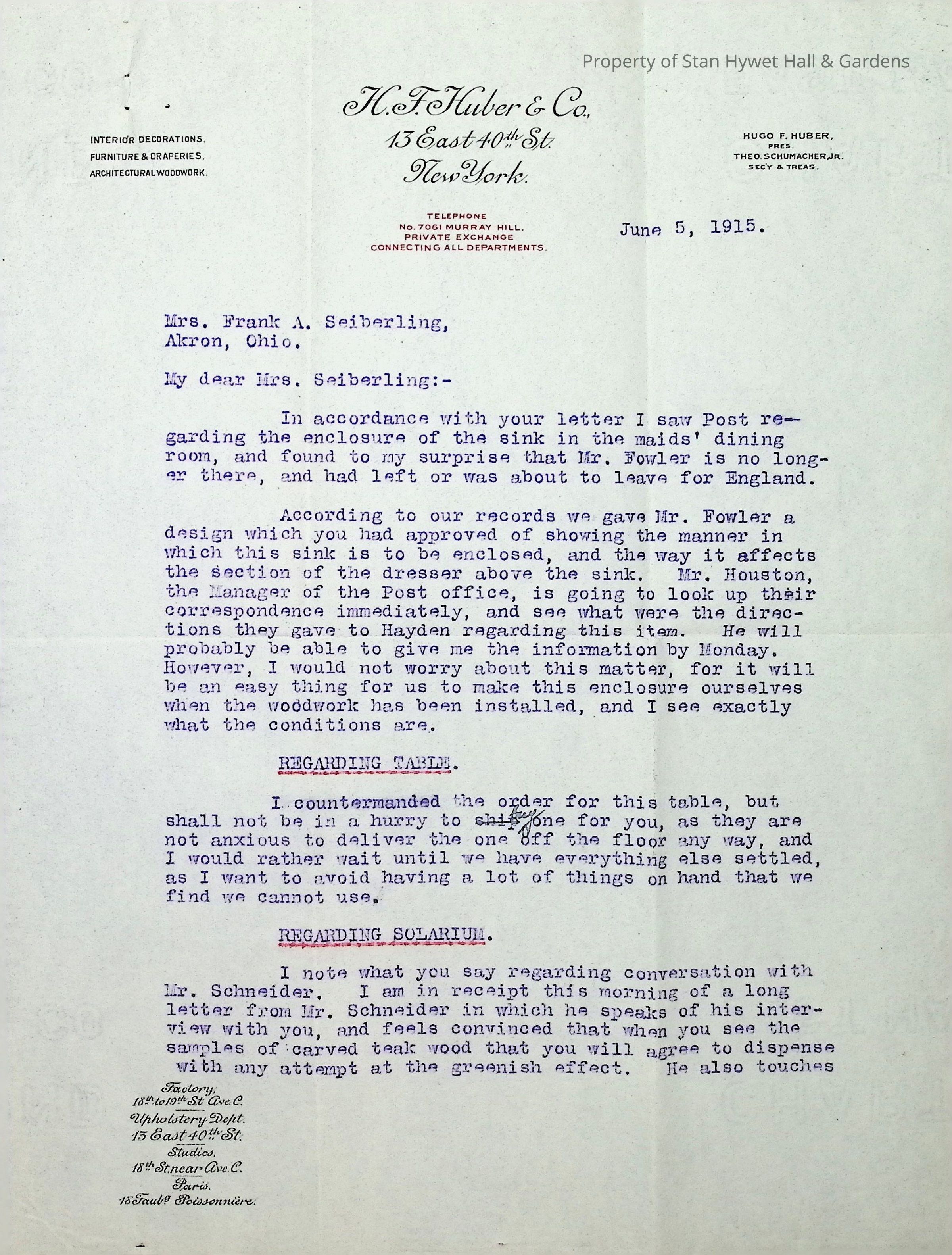 Typewritten letter on H.F. Huber & Co. letterhead, written to Mrs. F.A. Seiberling in Akron Ohio and dated June 5, 1915 regarding design details for the construction of Stan Hywet Hall, specifically the enclosure around the sink in the "maids' dining room" and discusses unexpected staffing changes at Post & Sons. He assures that the enclosure will be completed to her satisfaction even if Huber has to handle it himself. He also state he has "countermanded" an order for a table. It is unknow what table this is in reference to. He also mentions choices of teak wood and marble floor colors for the Solarium. The letter ends with a handwritten P.S. reassuring to write him regarding any concerns she may have.Subject