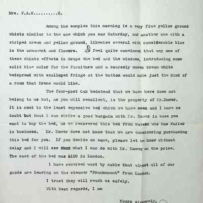 Typewritten letter on H.F. Huber & Co. letterhead, written to Mrs. F.A. Seiberling in Akron Ohio and dated March 22nd, 1915 regarding color choices for rugs and fabrics, mentioning that the rug choices allow for future color changes of other pieces in the room. He also mentions selected fabrics have not yet been ordered in case they find something they like better. He goes on to discuss specific designs he feels would suit Irene's bedroom. He also mentions the four poster bed belonging to a Mr. Mawer whom he thinks he can make a deal to purchase it if they want it.Subject