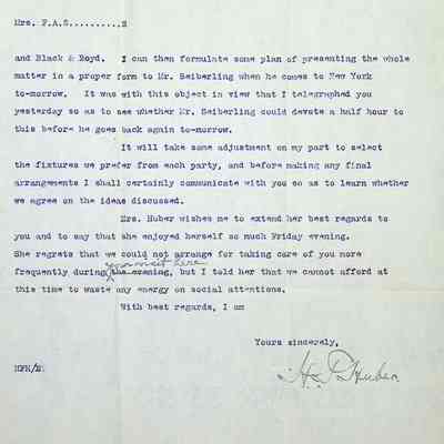Typewritten 2 page letter on H.F. Huber & Co. letterhead, from H.F. Huber to Mrs. F.A. Seiberling regarding marble & tile and lighting vendors and estimates, specifically mentioning Jackson, Hayden and Bradley and possibly Collings of Cleveland for the marble and Caldwell, Sterling Bronze, and Black & Boyd for the lighting. He ends with a personal message to Gertrude from Mrs. Huber.Subject