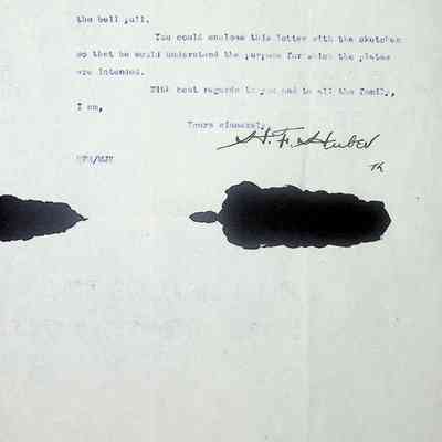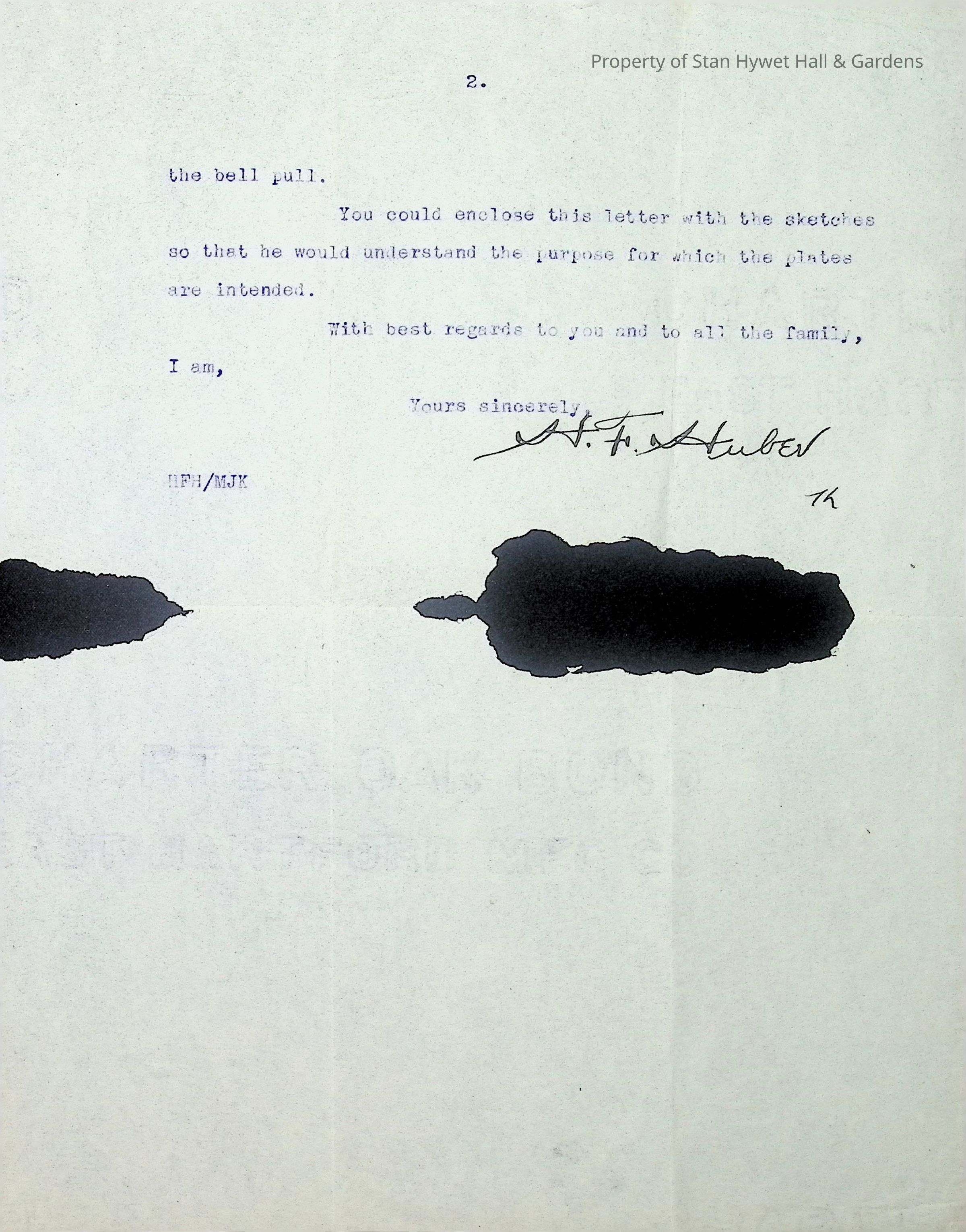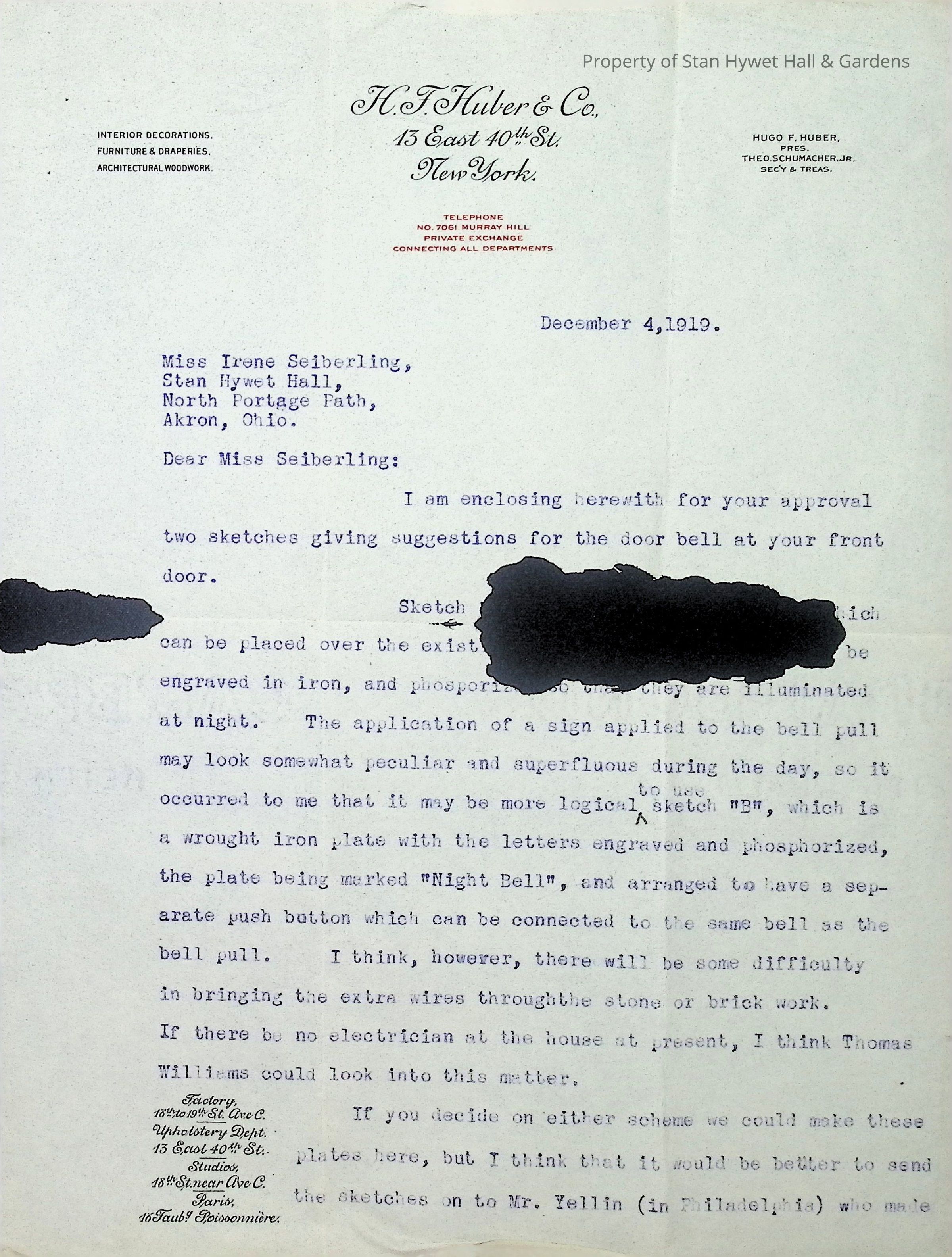 Typewritten letter on H.F. Huber & Co. letterhead, written to Miss Irene Seiberling in Akron Ohio and dated December 4, 1919 regarding a bell pull at the front door. There are large ink spots on the letter obscuring some words. It appears he is recommending some sort of engraved iron with phosphorization [ill.] to illuminate it at night. He mentions how it may be difficult to tie this into the existing wiring for the door bell at this point. He recommends sending the approved sketches to Mr. Yellin to make the plates.Subject