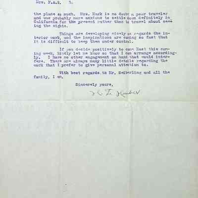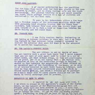Typewritten 3 page letter on H.F. Huber & Co. letterhead from Hugo Huber to Gertrude Seiberling. The letter addresses many subjects with the message separated by subject headers including: Reception Room damask, Music Room woodwork, Re. Terrace work, Re. The Latham's Country Homes, Regarding my trip to Akron, Regarding Mr. Mark, and ending with discussion regarding a trip by either Mr. or Mrs. Seiberling to New York.Subject