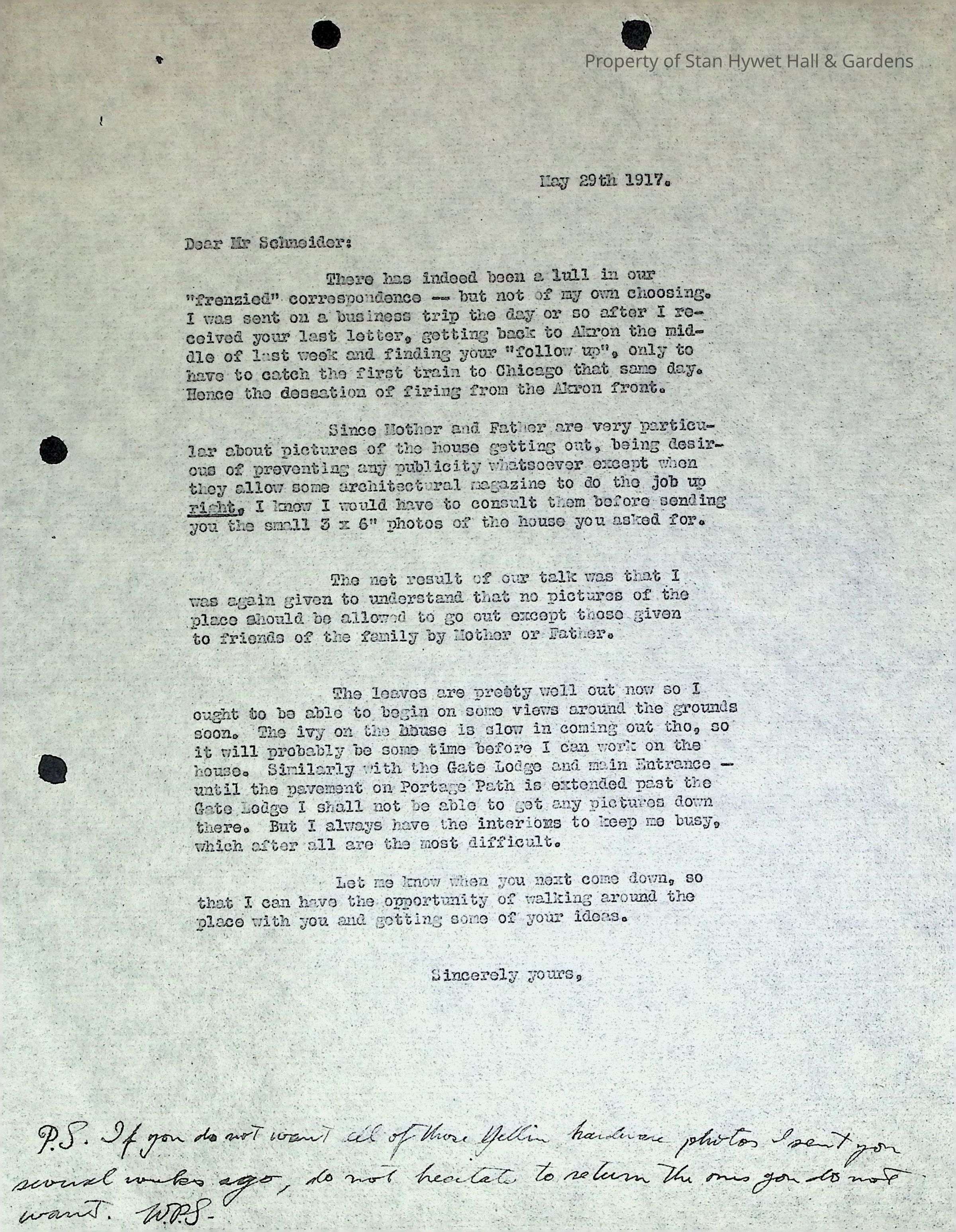Typewritten letter from Willard Seiberling to Charles Schneider in response to his letter of May18, 1917 [2024.85] requesting photographs of the house to be used for advertising. After responding to the ribbing in Schneider's previous letter, Willard states that Mother and Father "are very particular about pictures of the house getting out, being desirous of preventing any publicity whatsoever except when they allow some architectural magazine to do the job up right" and that he will have to consult them before sending any photos to Schneider for that purpose. A handwritten post script states that Schneider should return any of the previously sent Yellin photographs that he doesn't want. Letter is on plain paper and is not signed but post script is initialed W.P.S.Subject