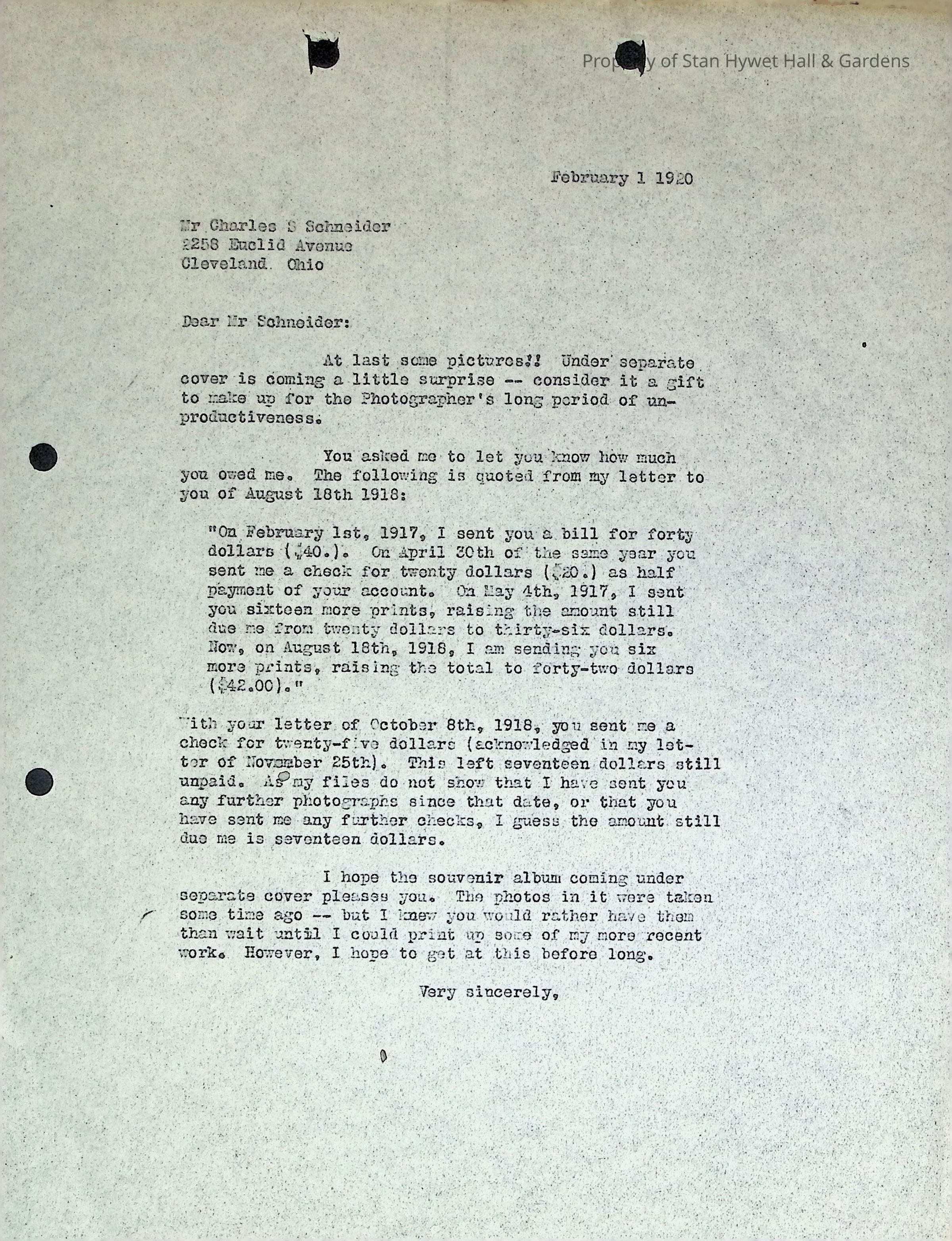 Typewritten letter from Willard Seiberling to Charles Schneider stating that photographs are finally coming "under separate cover". Willard also gives an accounting of charges and payments made for previously provided photographs leaving a balance owed of $17. It appears he did not charge Schneider for the photos referred to in this letter. Letter is on plain paper and is not signed.Subject