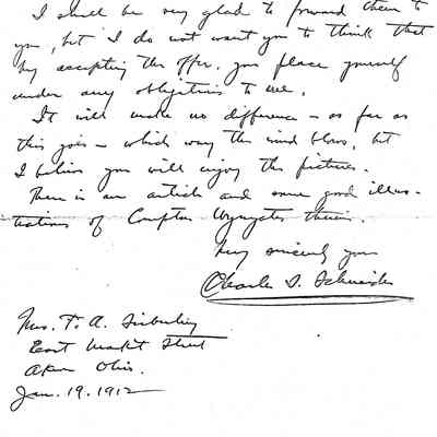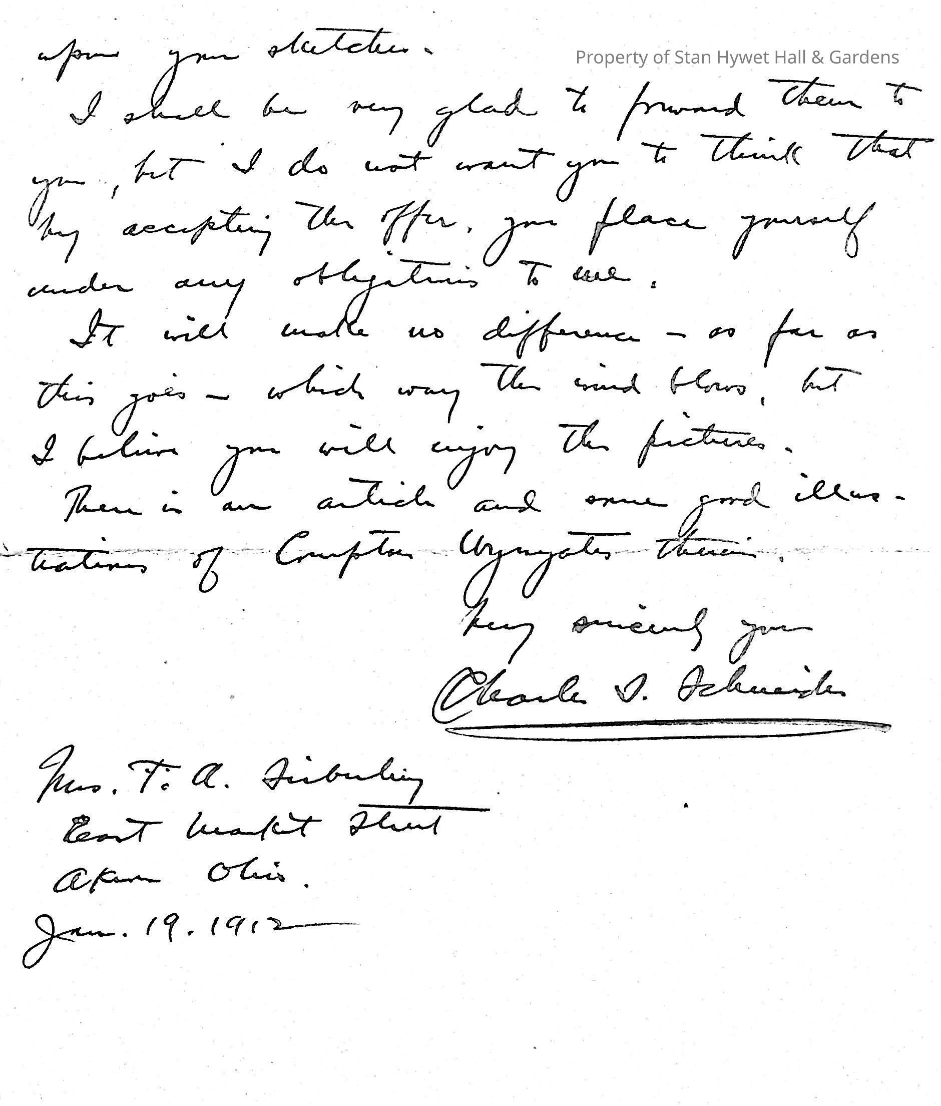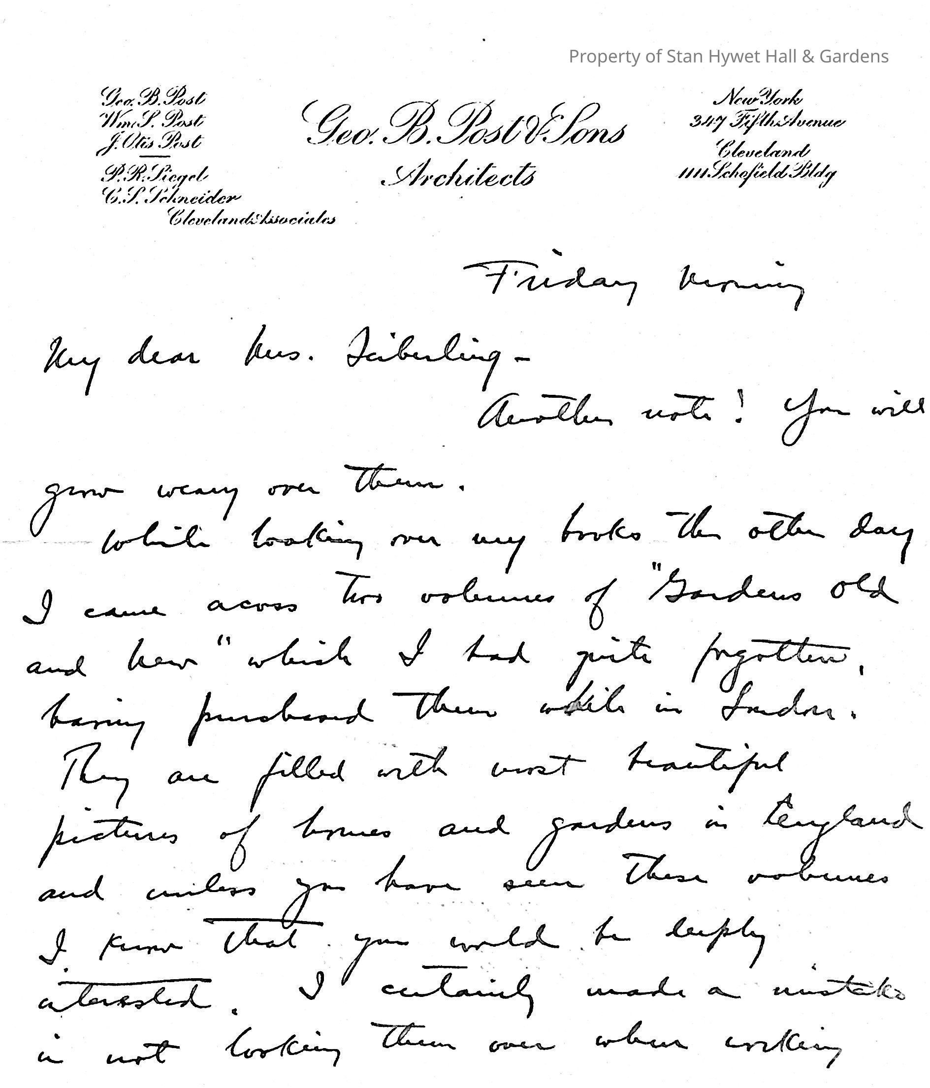 Handwritten letter on Geo. B. Post & Sons letterhead, written to Mrs. F.A. Seiberling and dated Jan 19, 1912 regarding a reference book titled "Gardens Old and New" which he felt had great pictures of homes and gardens in England which could be used to help design the grounds. He mentions there is an article with photos of Compton Wynyates included.Subject