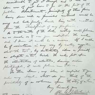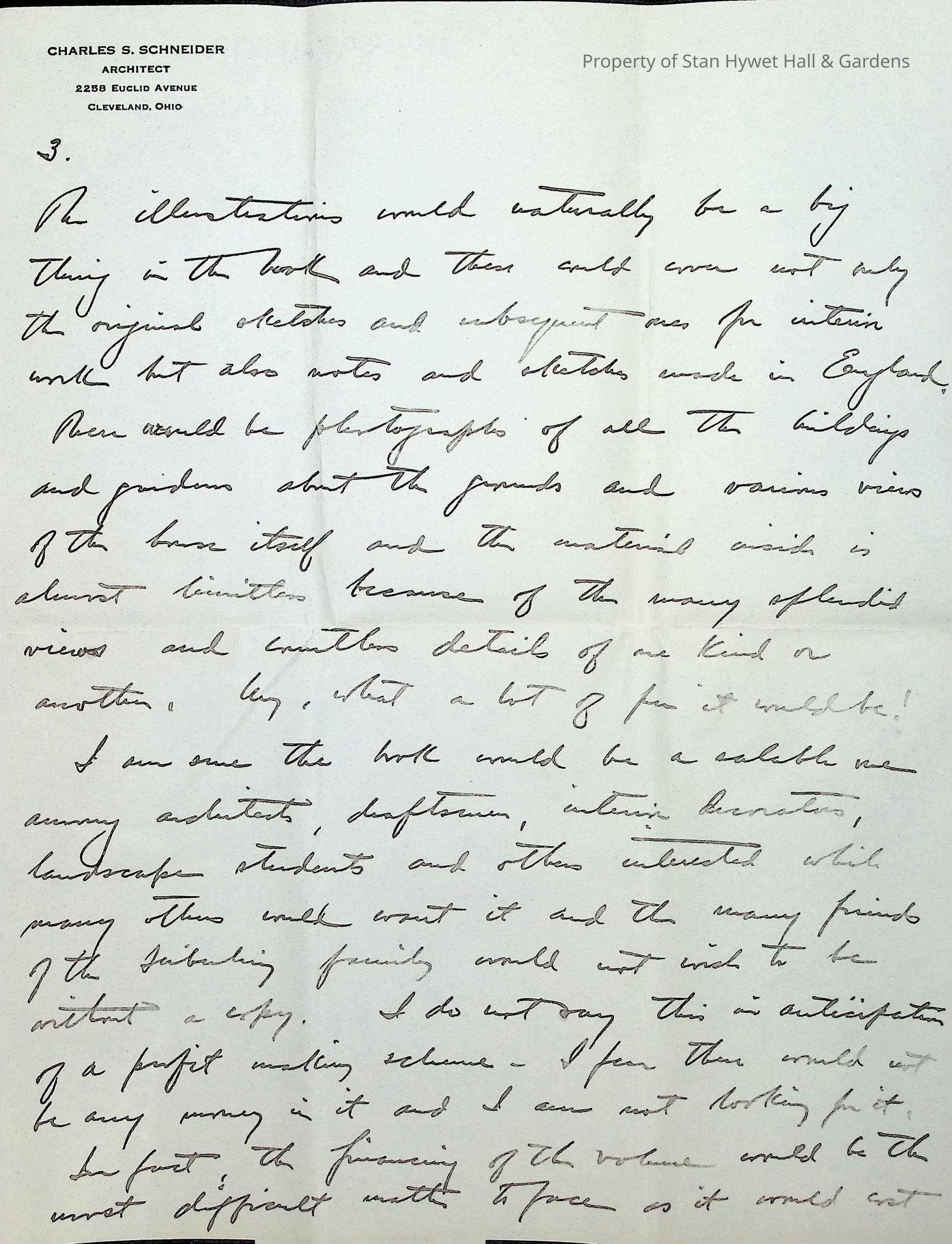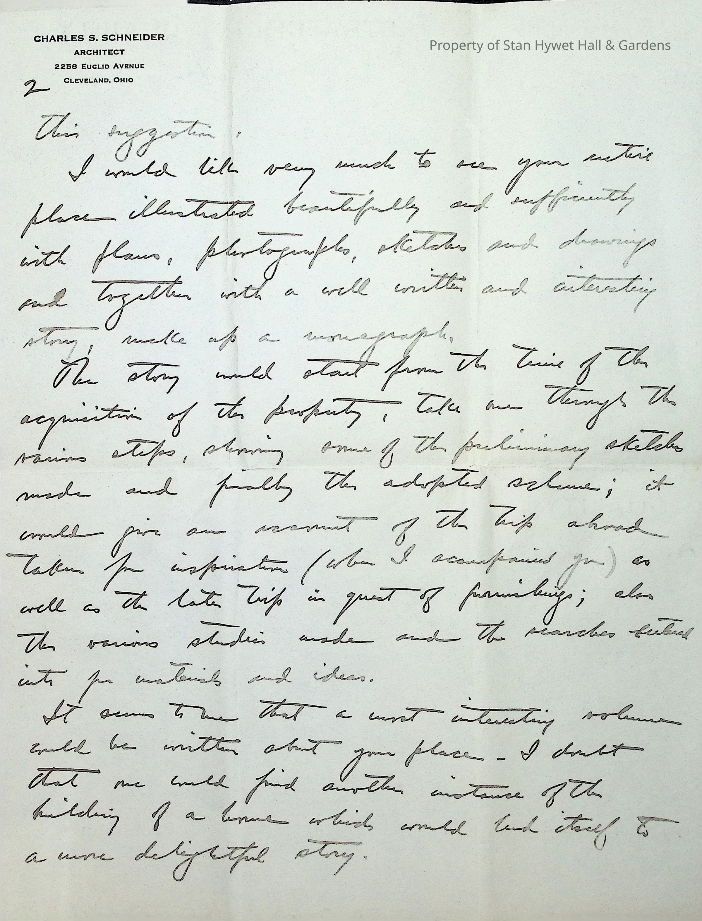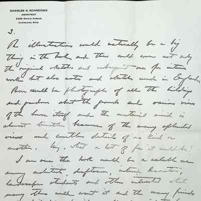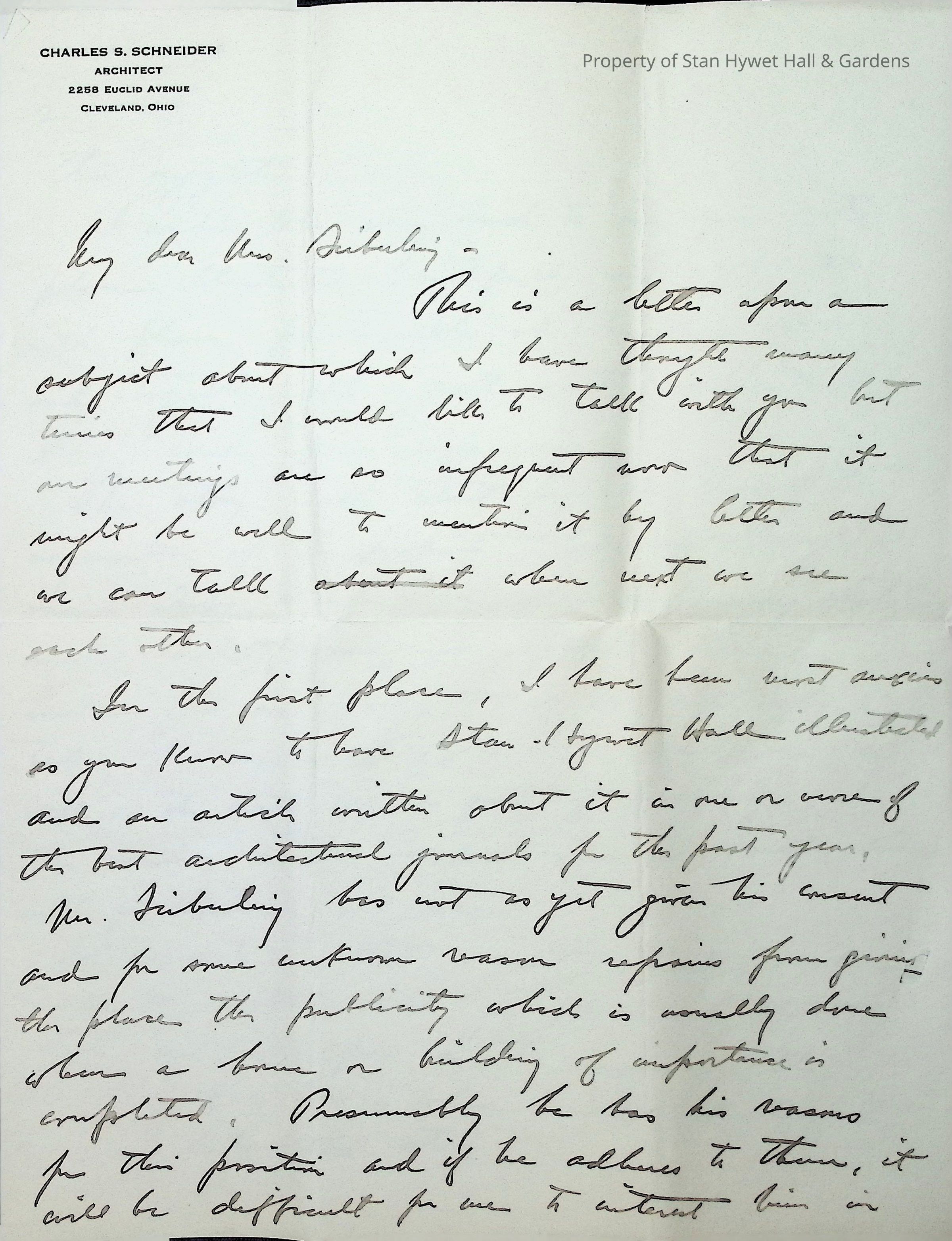 Handwritten letter on Charles S. Schneider letterhead, written to Mrs. Seiberling and dated October 23, 1917 regarding a request to speak with Frank about allowing him to write "a story of a home" including text, preliminary drawings, and photographs of the process of building the home, potentially for an architectural magazine or even a self-published book. He implies that he may have previously approached Frank who has yet to give his consent.Subject