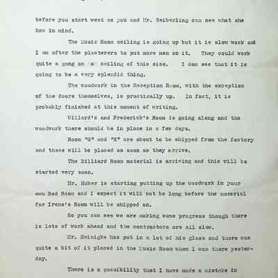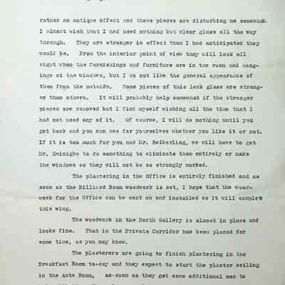 Updates include the Music Room ceiling is in progress but going slowly, the woodwork in the Reception Room is almost done, the woodwork in Willard's and Frederick's room should be going up in a few days, the Billiard Room material is arriving and will be started very soon, Huber is putting up the woodwork in the Master Bedroom and Irene's materials will be shipped soon. Mr. Heinigke is putting in the glass and Mr. Schneider does not like the lack glass that he had suggested to be included in the windows throughout the house. He feels the color is too strong and would rather them be all clear but he will wait for their decision before changing it.