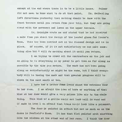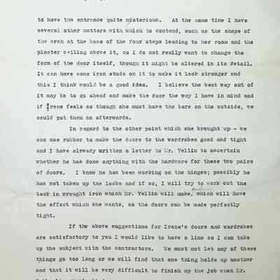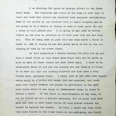 A full page is dedicated to discussing what Irene wants for the design of her door and his thoughts on it. He goes on to explain how the Tower Room (Cromwell Room) woodwork is being antiqued and how he wants the floor to match with much detail on the process options. The letter ends abruptly mid-sentence indicating at least one page is missing.Subject