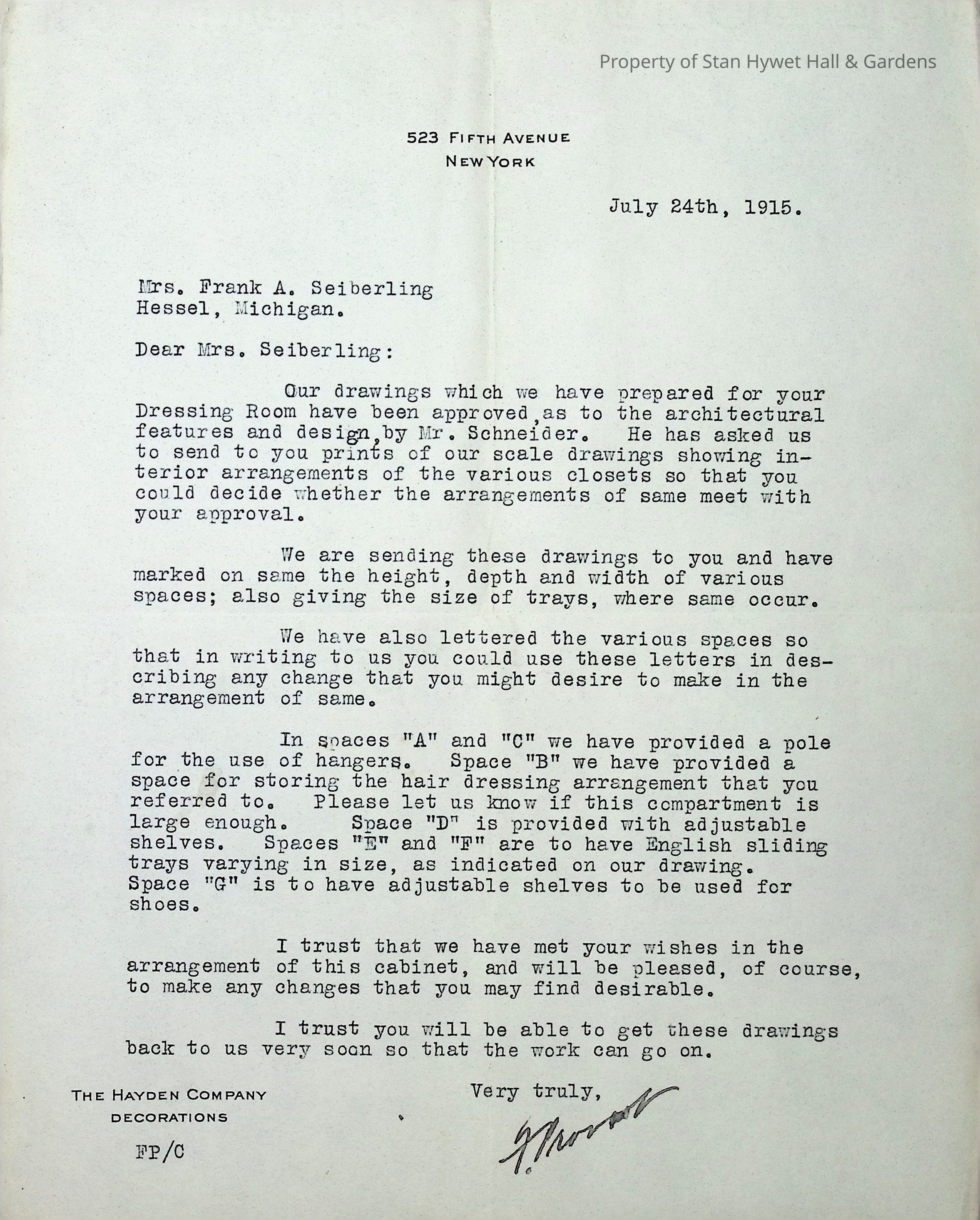 Typewritten letter from F. Provost(?) of The Hayden Company to Mrs. Frank A. Seiberling advising her that drawings for the design of her dressing room have been approved by architect Charles S. Schneider and are being sent to her for approval. Written on The Hayden Company letterhead and signed in pen.Subject
