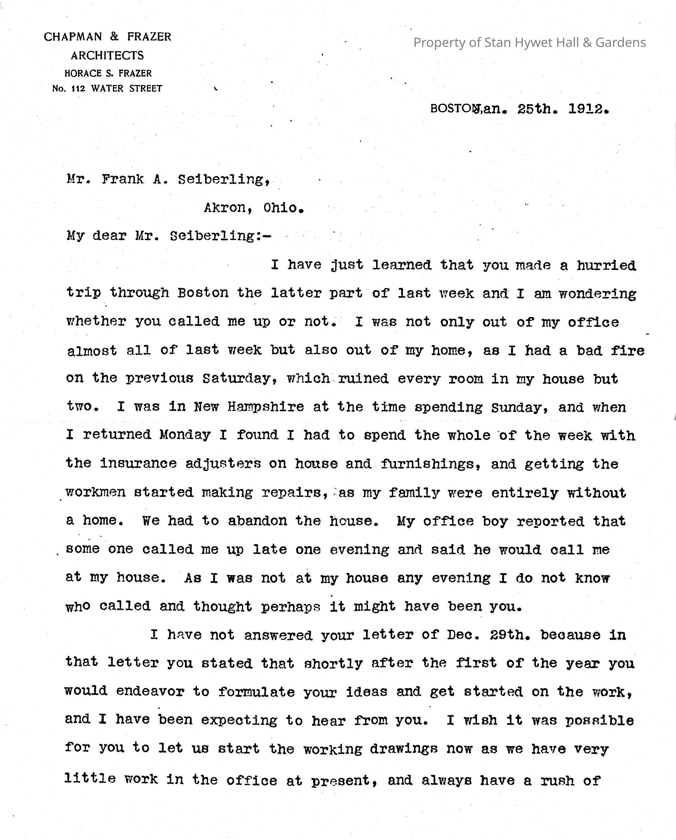 Typewritten letter on Chapman & Frazer Architects letterhead, written to Mr. Frank A. Seiberling in Akron, Ohio and dated January 25th, 1912, regarding drawings for the construction of Stan Hywet Hall. Horace S. Frazer, after explaining the loss of his own home by fire, implores Frank to allow him to get started on the drawings for his house soon before the mad rush of spring is upon them and everyone wants their drawings done. He mentions that Frank mentioned he could do with a smaller den by Mr. Frazer points out that the change would impact the size of the boys room above it.Subject