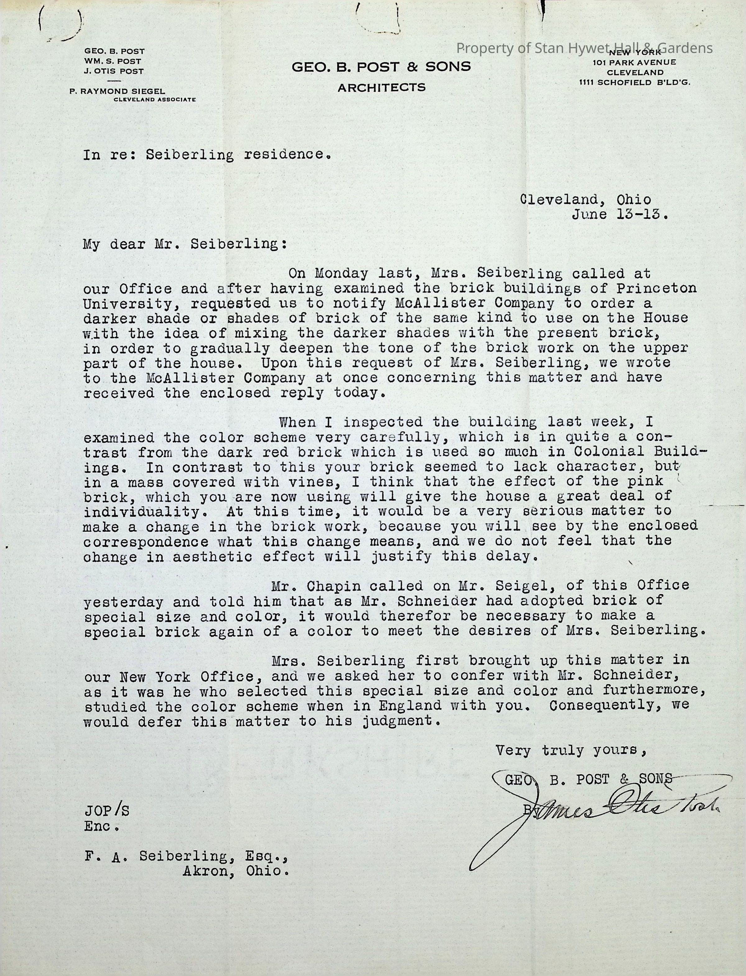 Typewritten letter from Geo. B. Post & Sons to F.A. Seiberling regarding the change in brick color requested by Gertrude, inspired by the bricks used at Princeton University, advising of the issues involved with changing the brick color at this point. Written on Geo. B. Post & Sons letterhead and signed by James Otis Post.Subject
