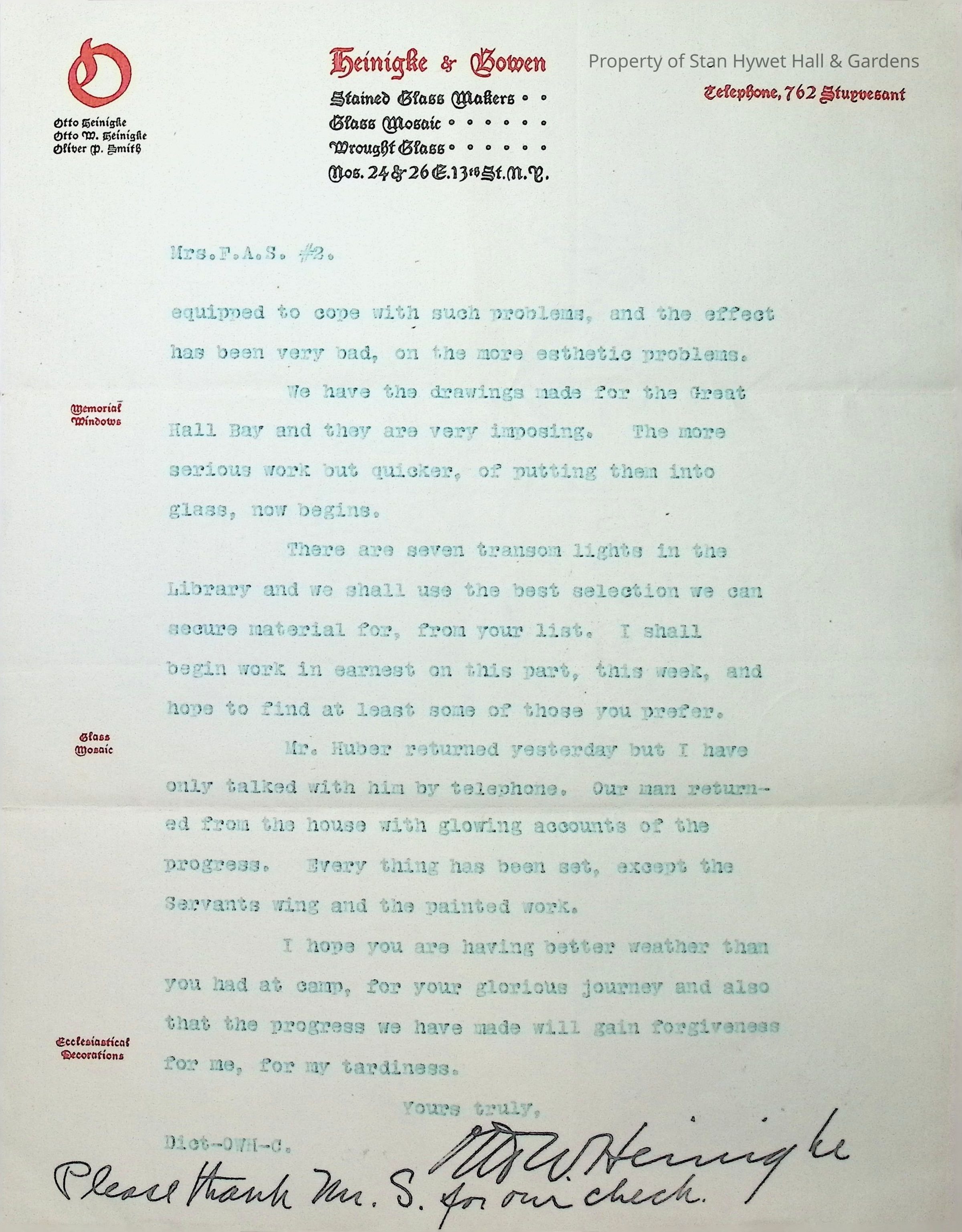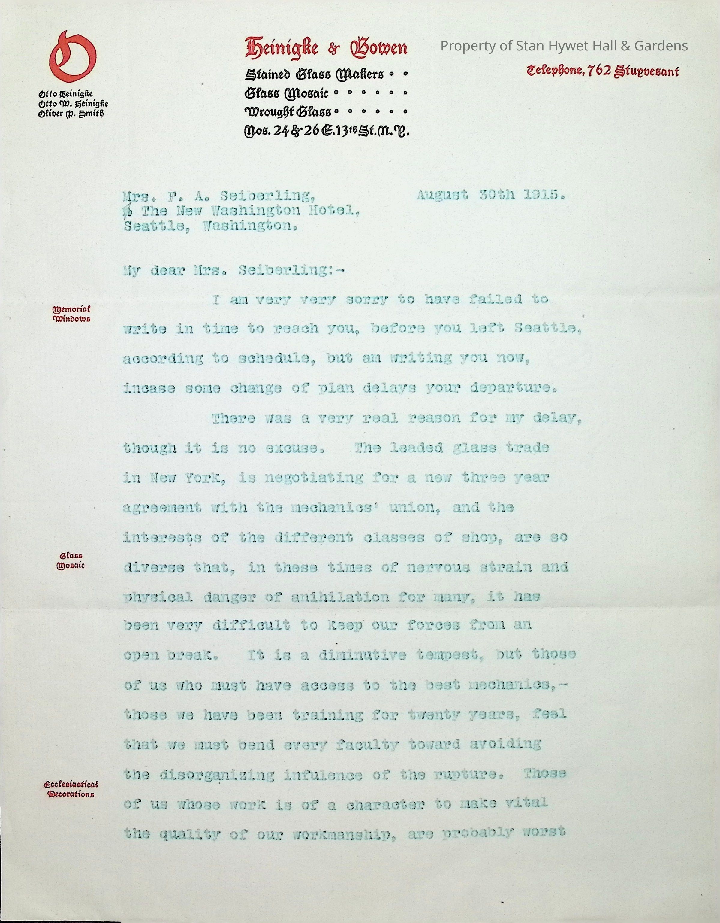 Typewritten letter on Heinigke & Bowen letterhead, written to Mrs. F.A. Seiberling in Seattle, Washington and dated August 30th, 1915 regarding updates on the construction of Stan Hywet Hall, specifically the stained & leaded glass windows of the "Great Hall bay" and the transom windows in the Library. He mentions delays caused by the mechanics union negotiations in New York impacting the leaded glass trade. It ends with a handwritten note to "Please thank Mr. S. for our check."Subject