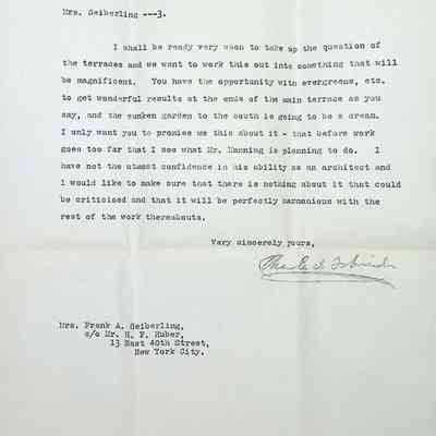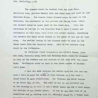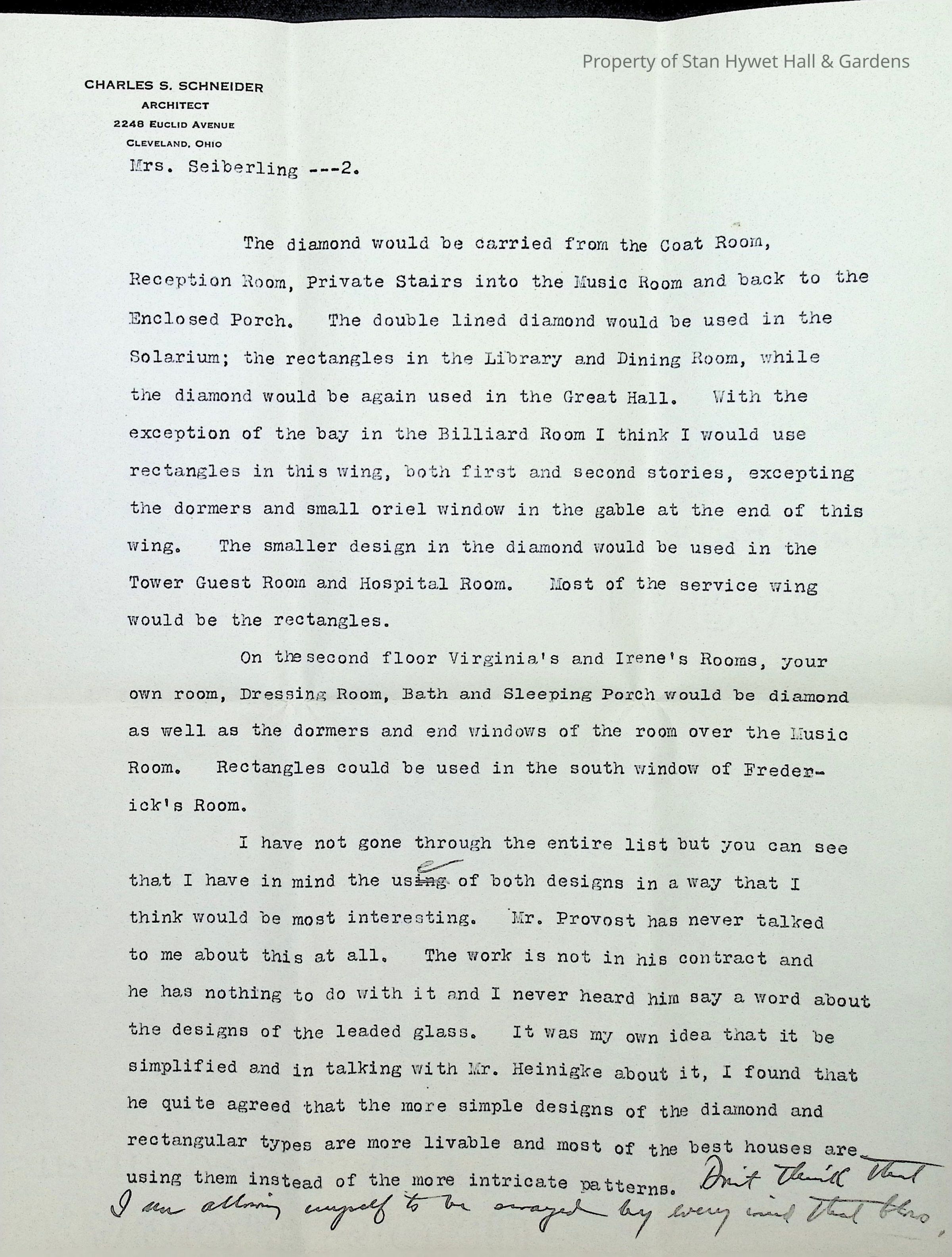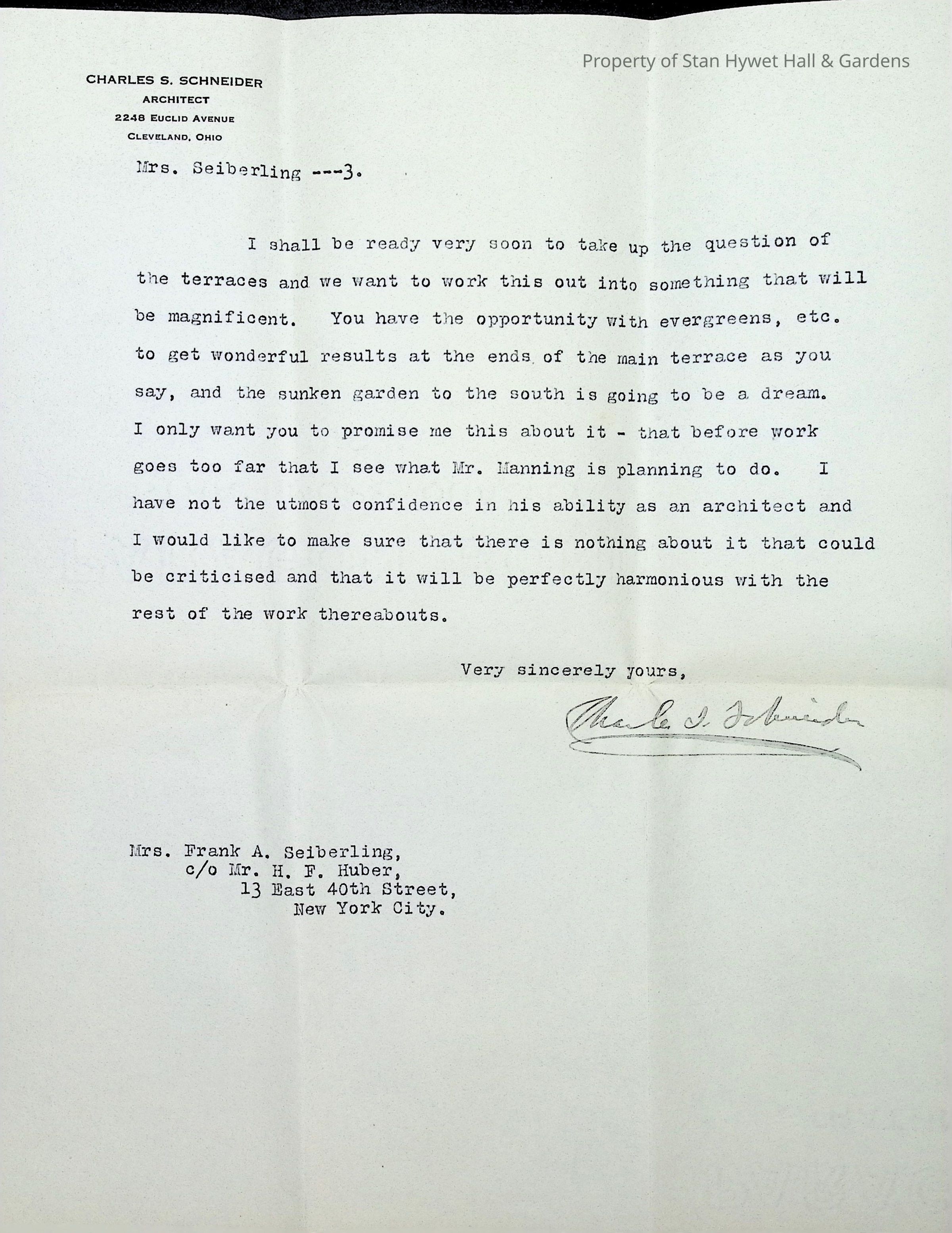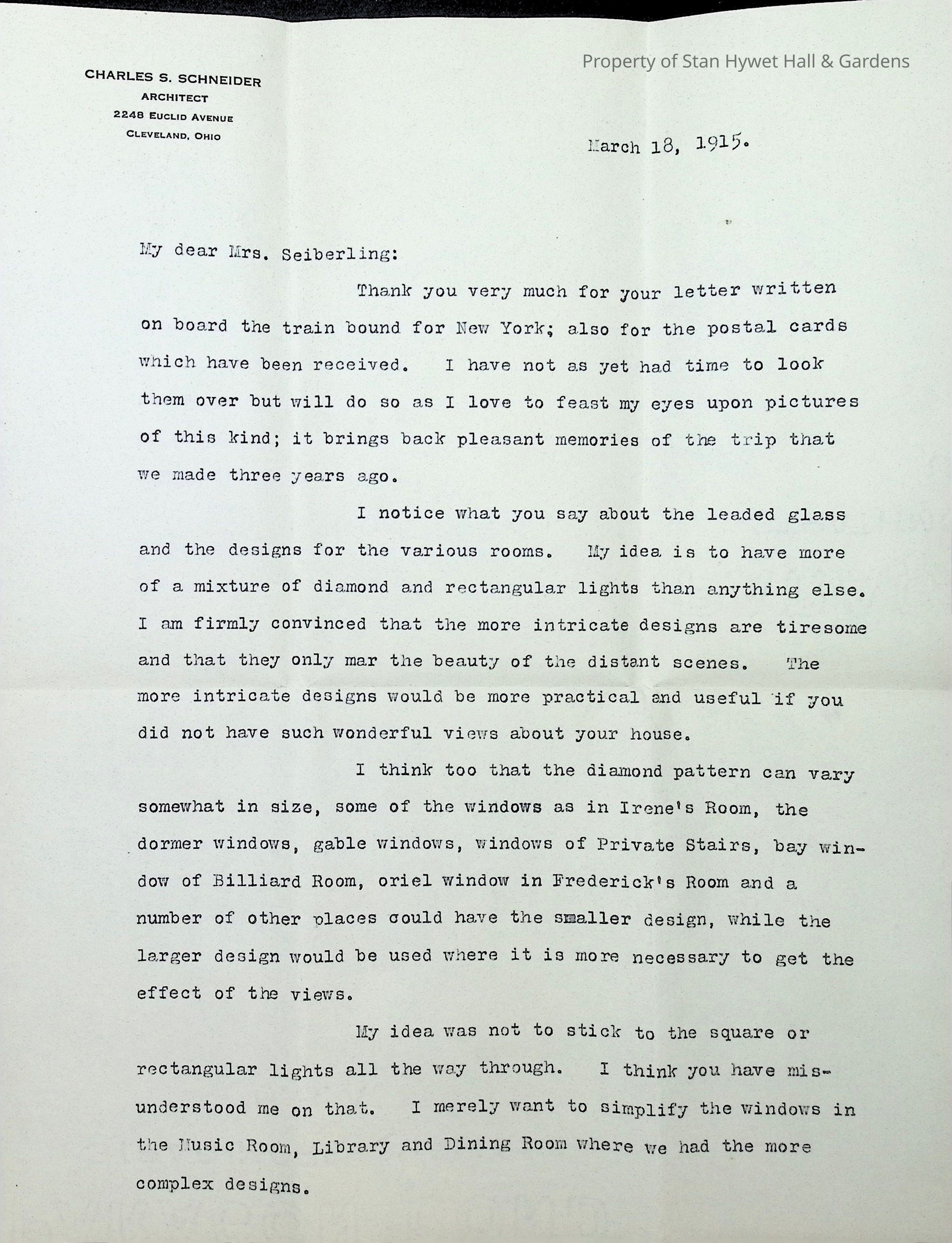 Typewritten letter on Charles S. Schneider letterhead, written to Mrs. Frank A. Seiberling c/o Mr. H.F. Huber in New York City and dated March 18, 1915 regarding design plans of the size and shape of the leaded windows throughout the house. He ends with a note that he would like to see Manning's plans for the English Garden and the West Terrace before he goes too far stating he has no confidence in his ability as an architect.Subject