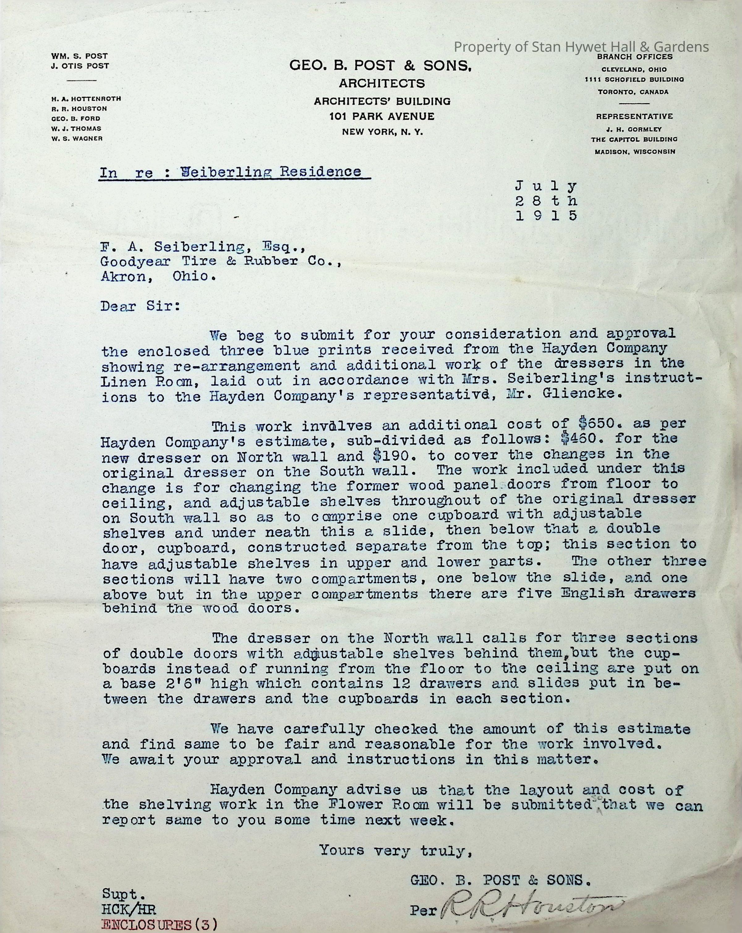 Typewritten letter from Geo. B. Post & Sons to F.A. Seiberling, Esq. requesting approval of changes to the Linen Room cupboards requested by Mrs. Seiberling which will cost an addition $650. Basically changing cupboards on both sides from full floor to ceiling cupboards to split cupboards with slides between. Lower cupboards on the north side to be changed to drawers. Written on Geo. B. Post & Sons letterhead and signed in pen R.R. Houston.Subject