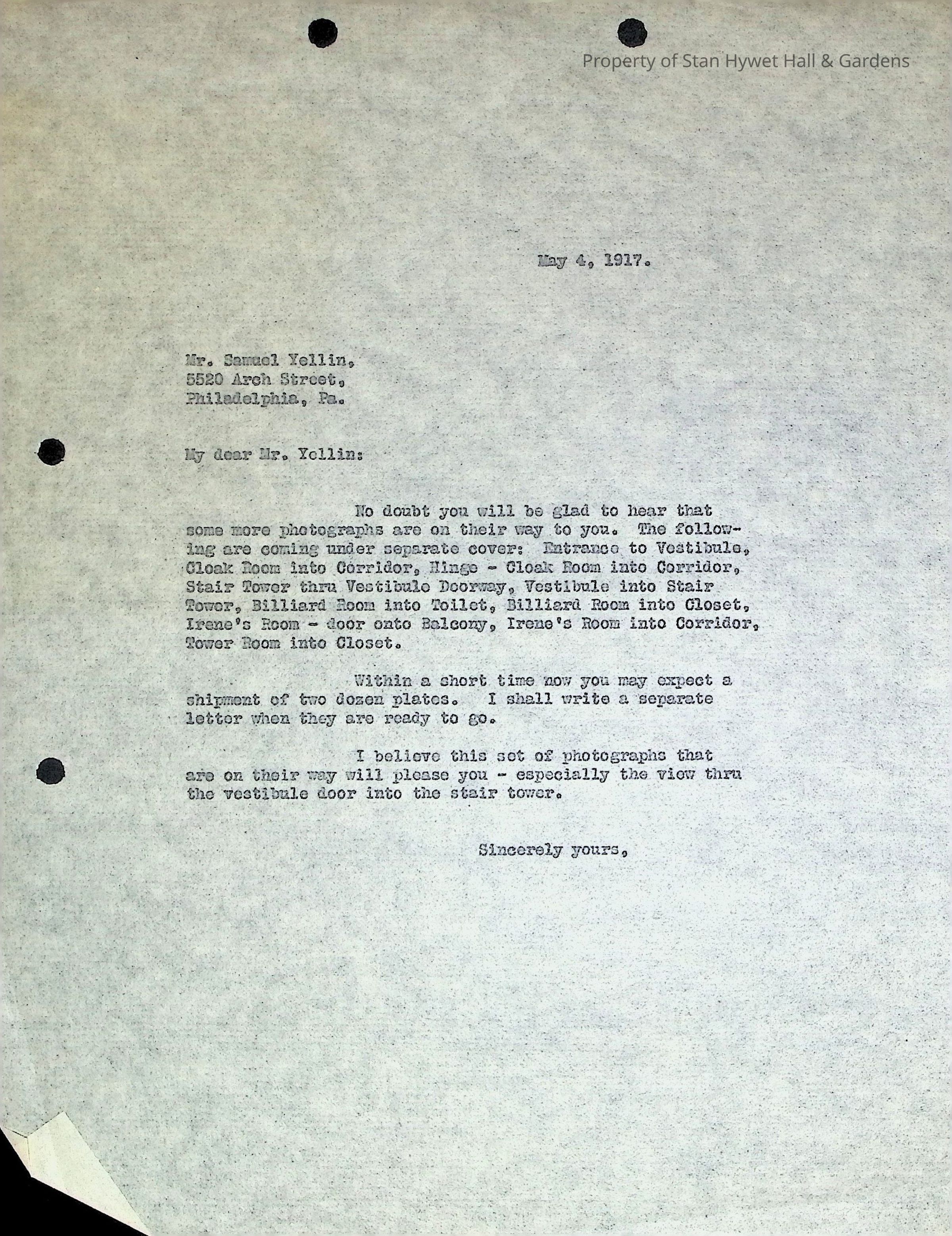Typewritten letter from Willard Seiberling to Samuel Yellin stating that photographs are being sent "under separate cover". Willard also states that 2 dozen plates will be sent soon. Letter is on plain paper and is not signed.Subject