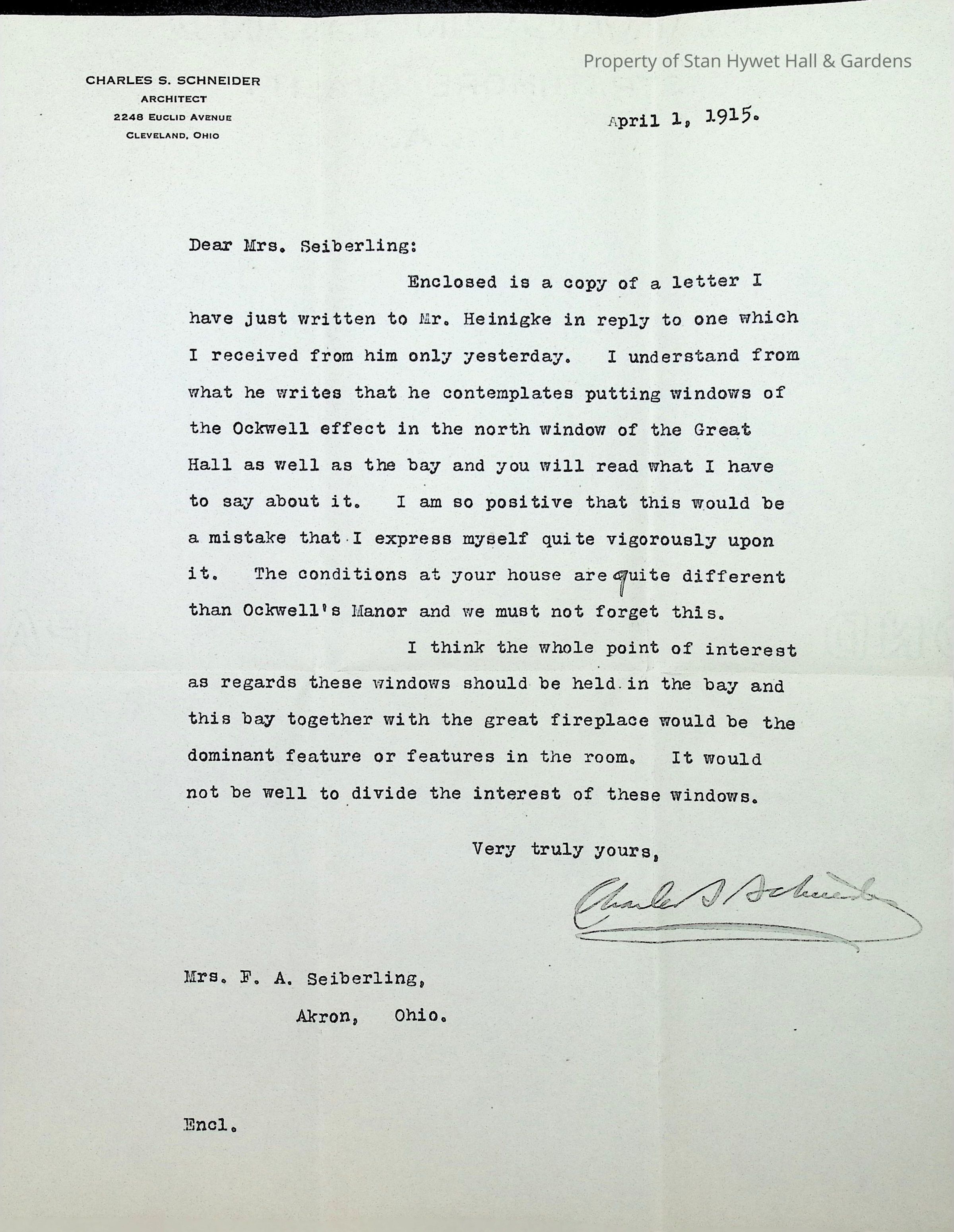 Typewritten letter from architect Charles S. Schneider to Gertrude Seiberling in reference to a letter written to Mr. Heinigke stating his opinion on the decision of putting the "Ockwell effect" windows on both the north and south side of the Great Hall being a mistake. He feels that the focus should be on the bay windows and the fireplace. Written on Schneider's letterhead and signed in pencil.Subject