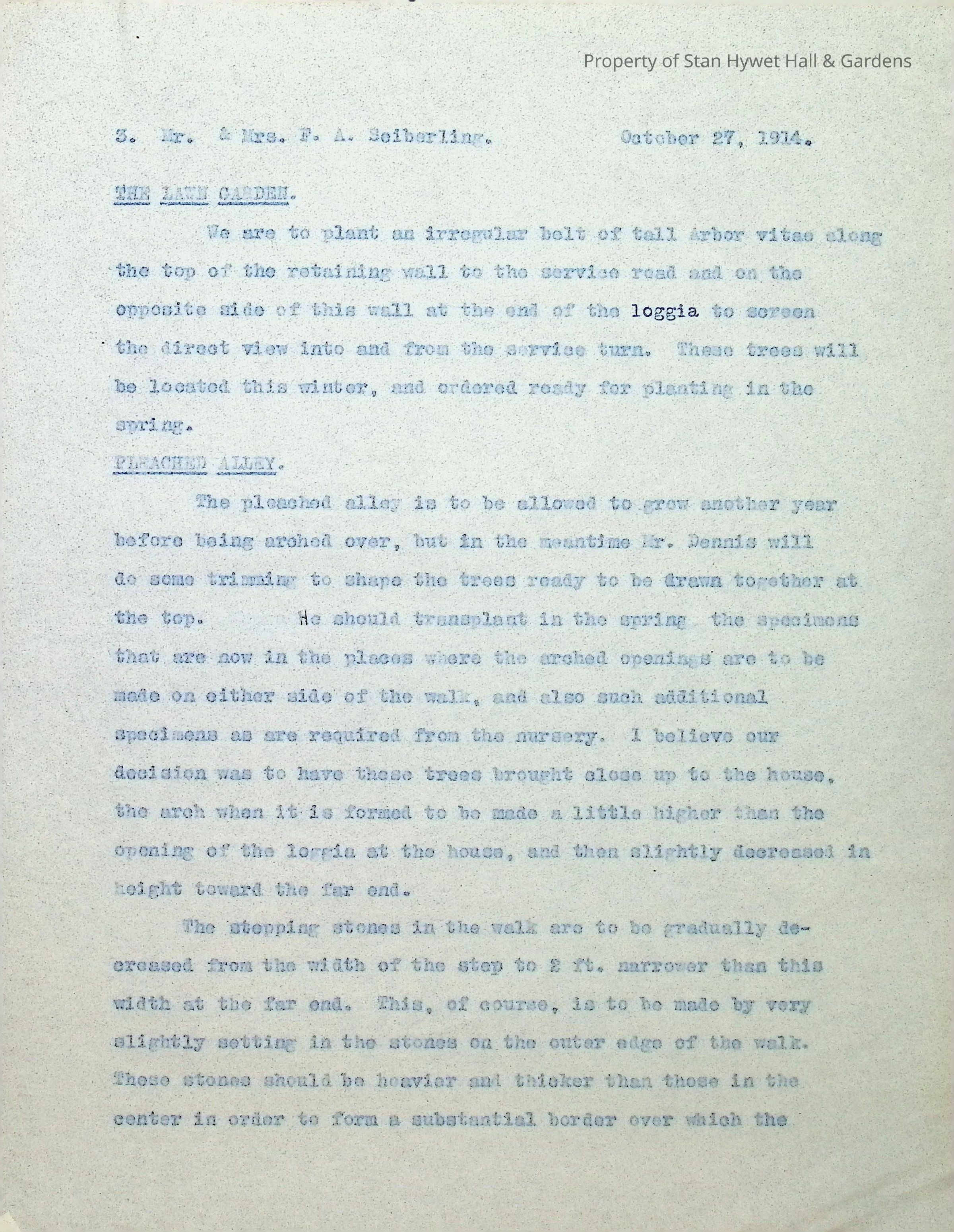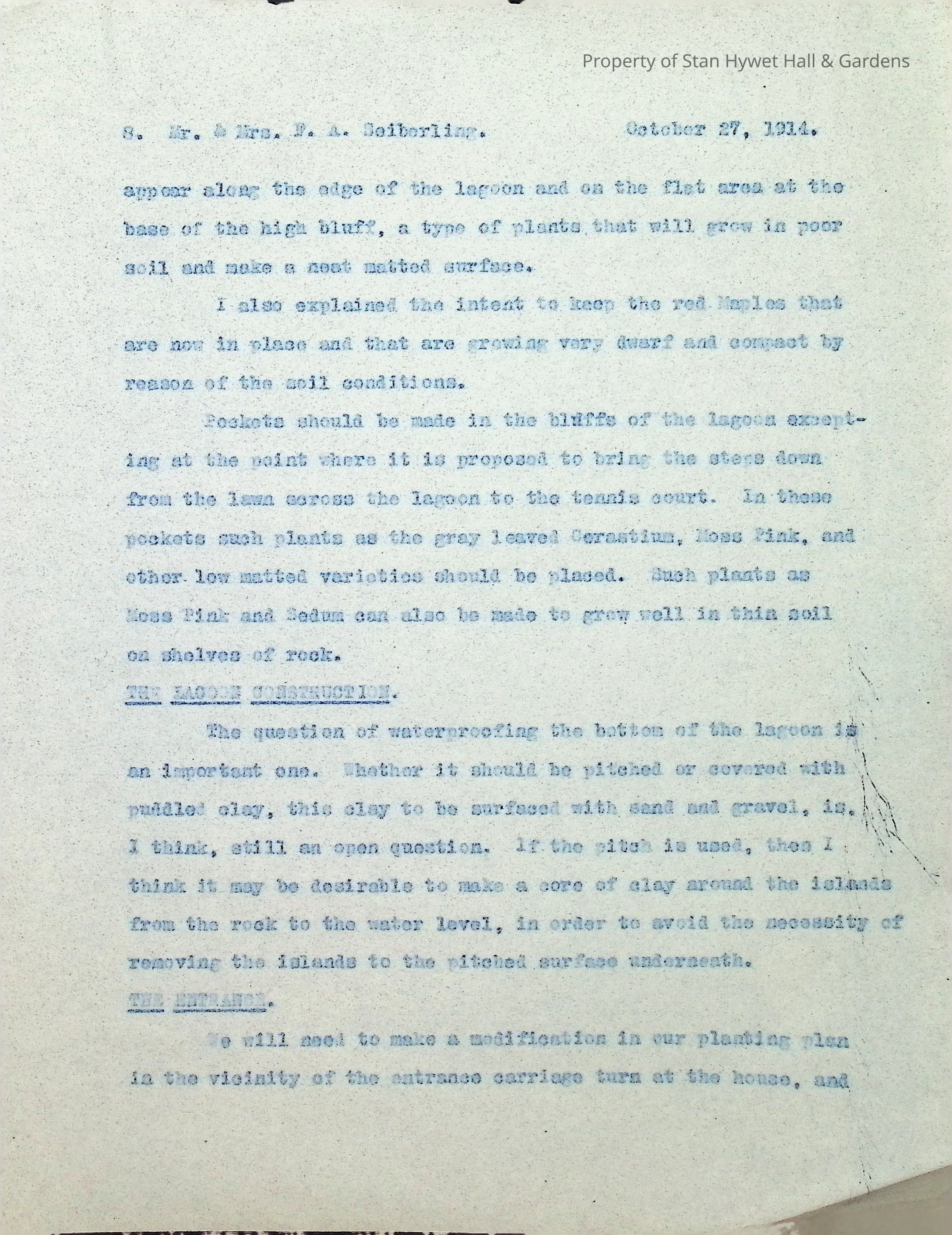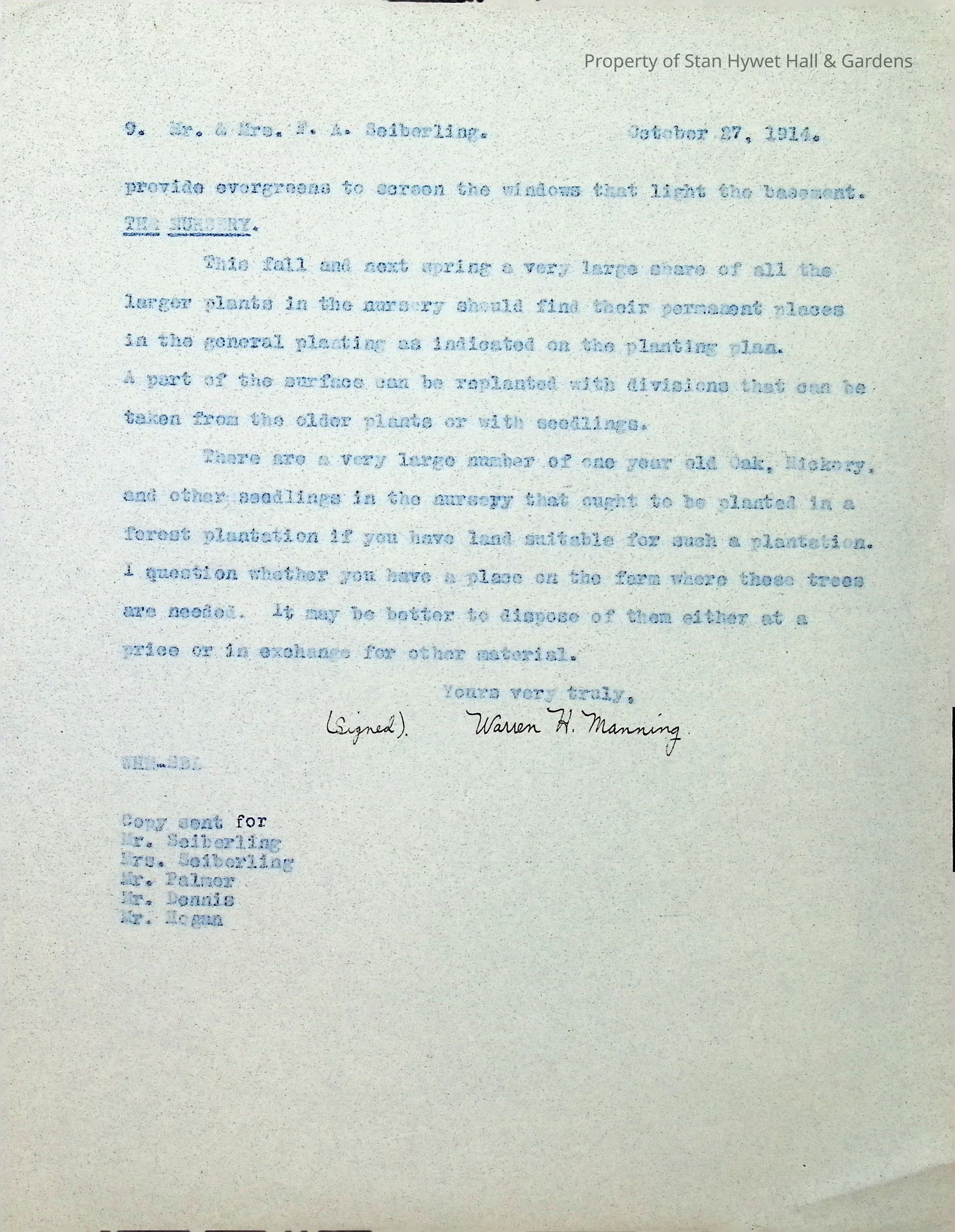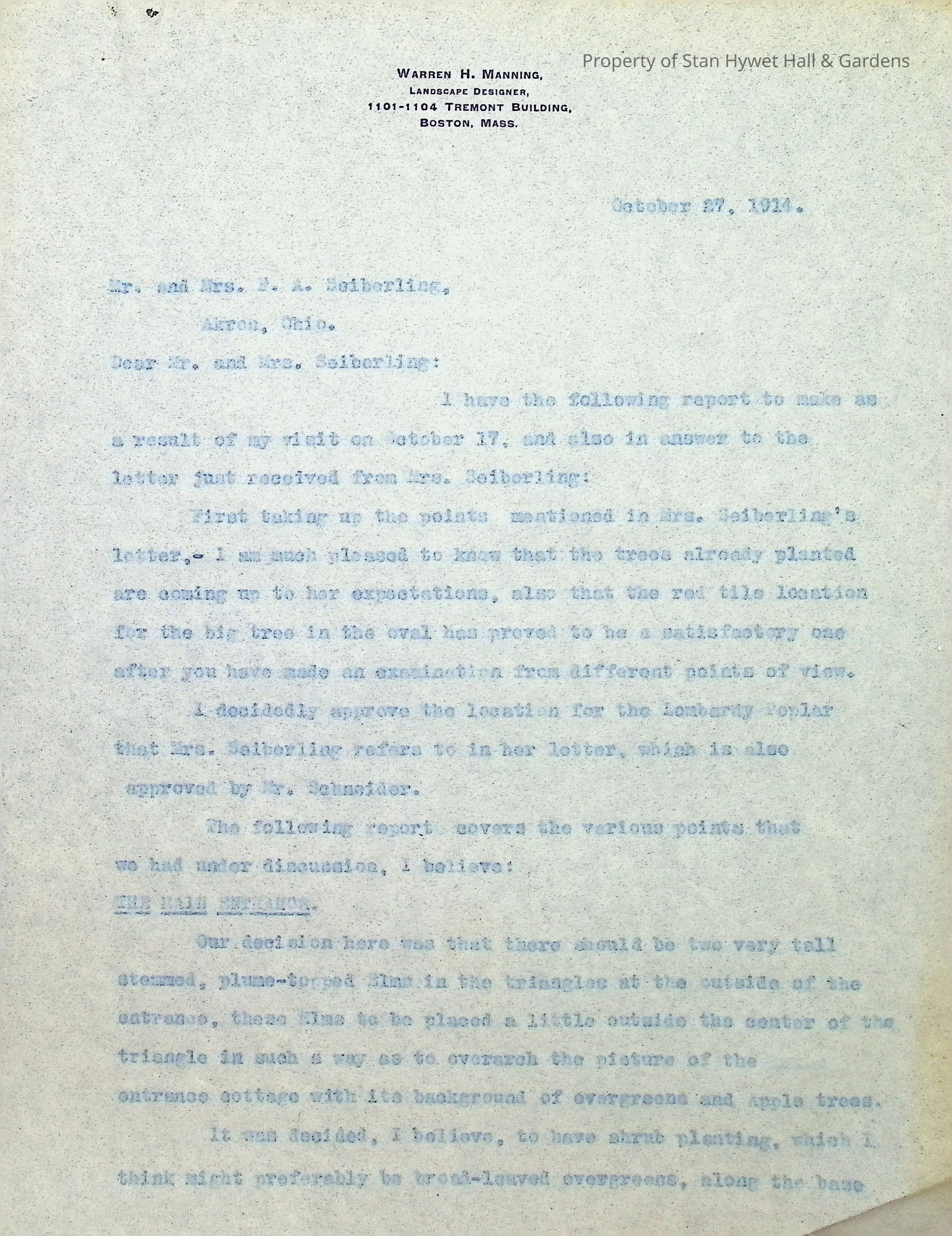Carbon copy of a typewritten letter on Warren H. Manning letterhead, written to Mr. and Mrs. F.A. Seiberling, Akron, Ohio and dated October 27th, 1914 regarding updates on the plantings around the property, specifically the approval of the trees already planted. He also discusses the trees and plantings at the entrance gate and around the wall, the garage, "the lawn garden", "pleached alley" (likely the birch tree allee), "flower garden" referencing the movement of plants temporarily stored here to their permanent locations, "the rose garden", "the Sycamore vista", "the English garden", "the Japanese garden", "the terrace", "railroad banks", "the loggia", "the service drive", "the lagoon". "lagoon construction", "the entrance", and "the nursery." It is noted at the bottom that copies were sent to Mr. Seiberling, Mrs. Seiberling, Mr. Palmer, Mr. Dennis, and Mr. Hogan.Subject