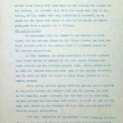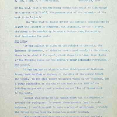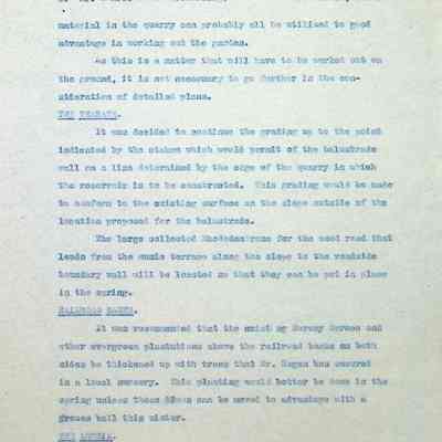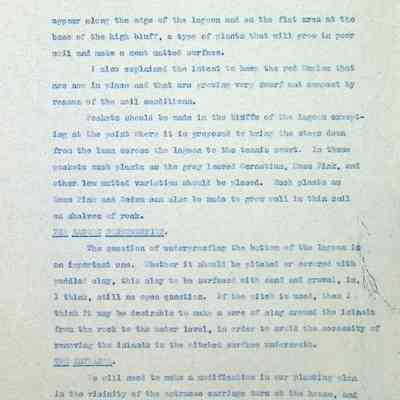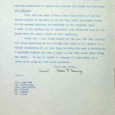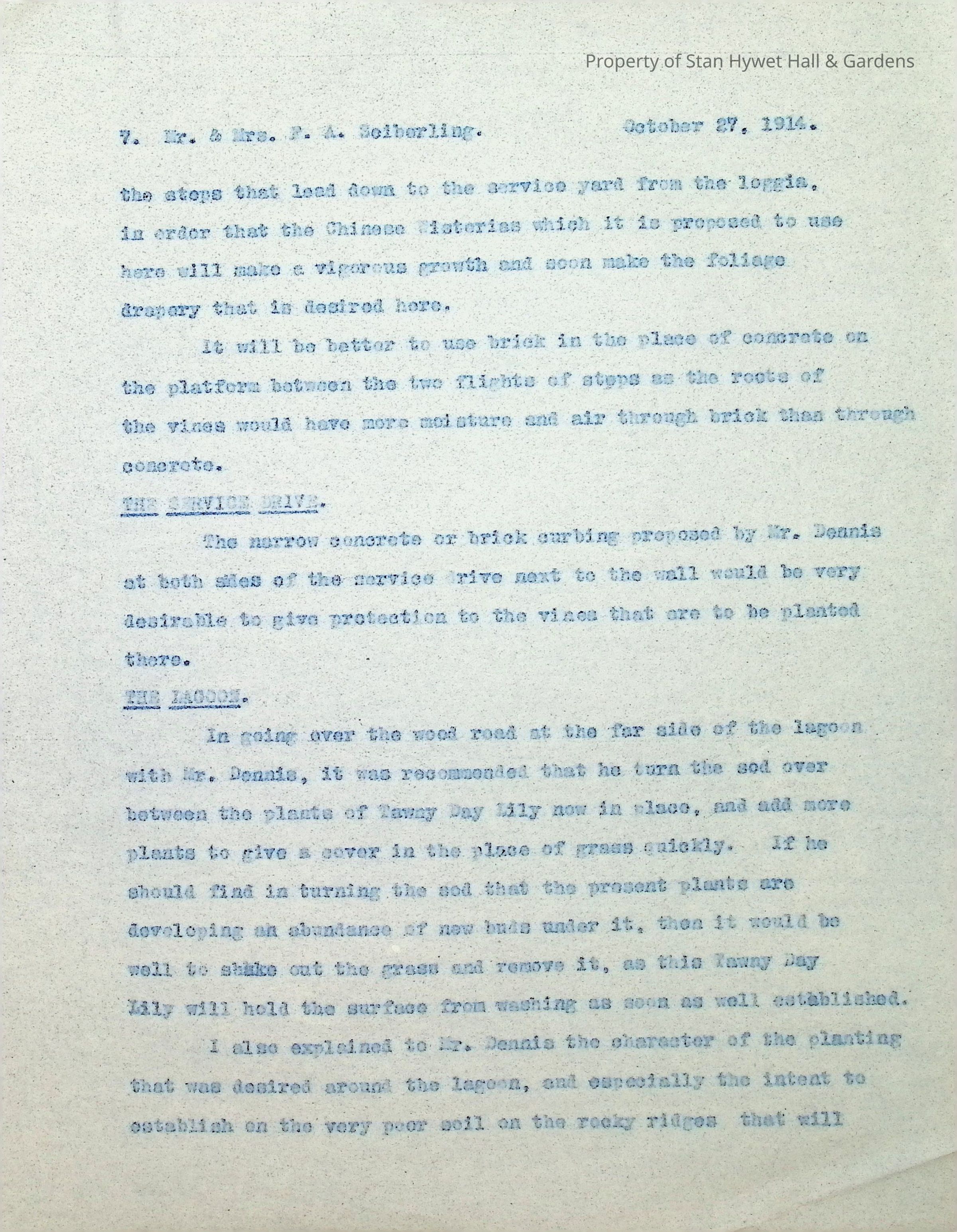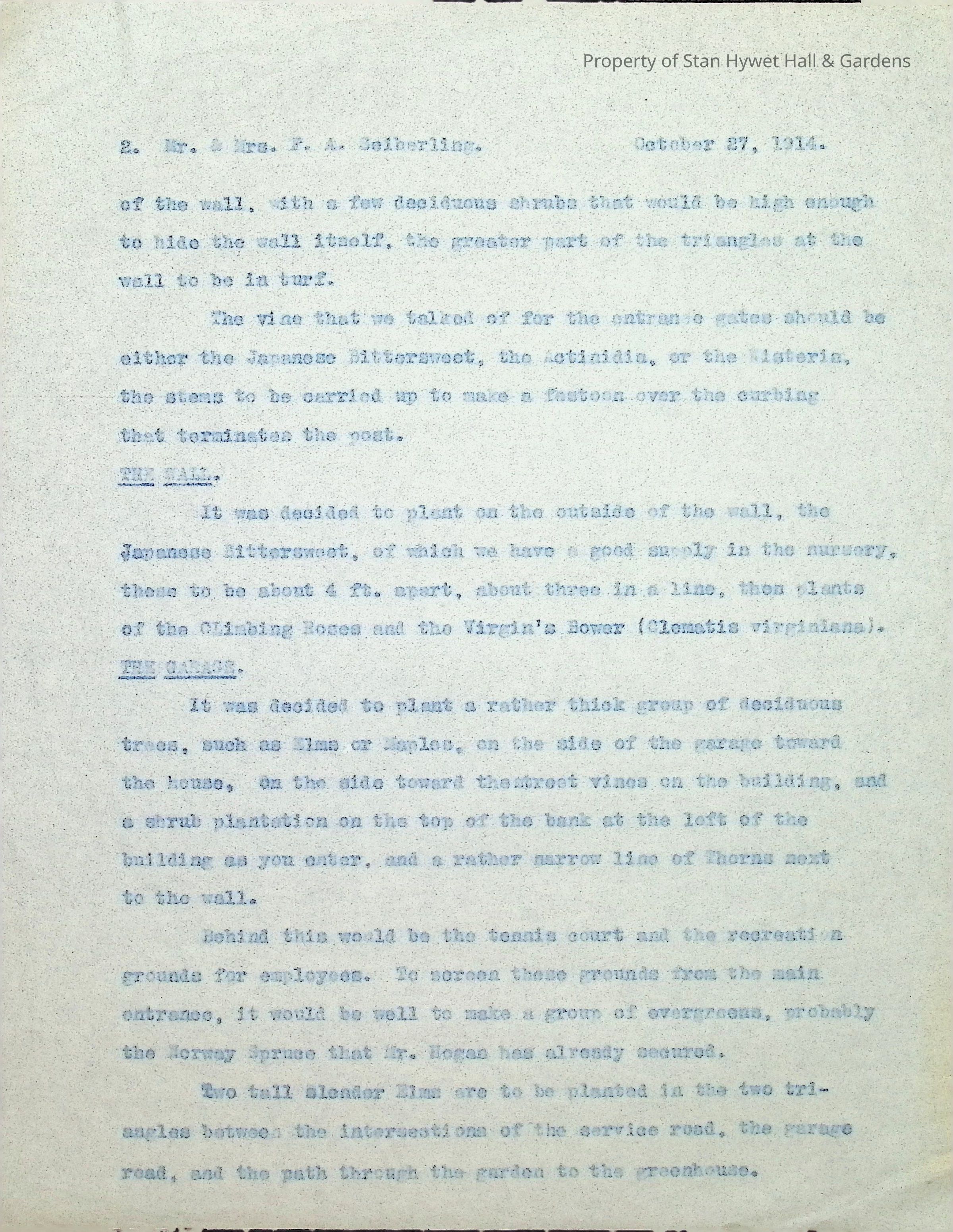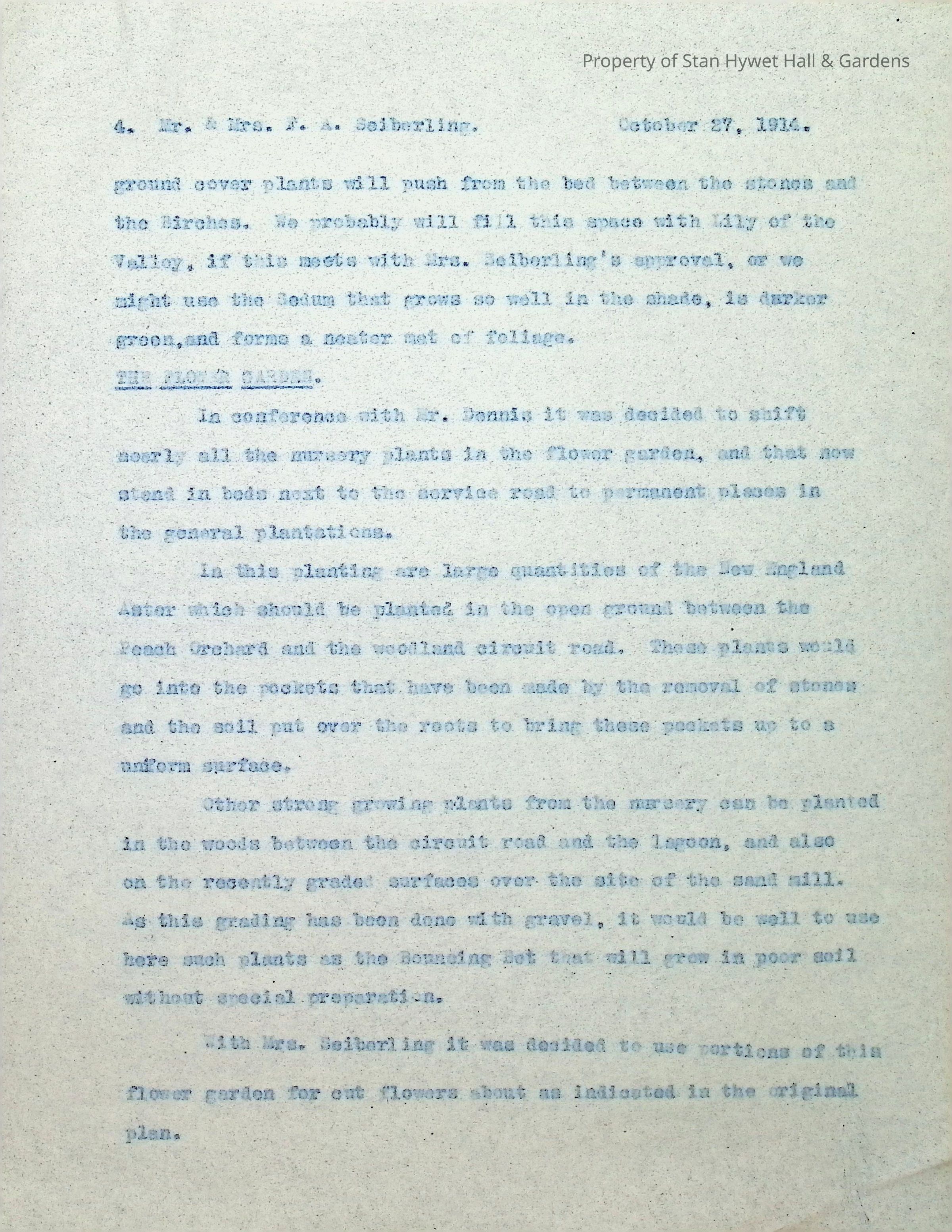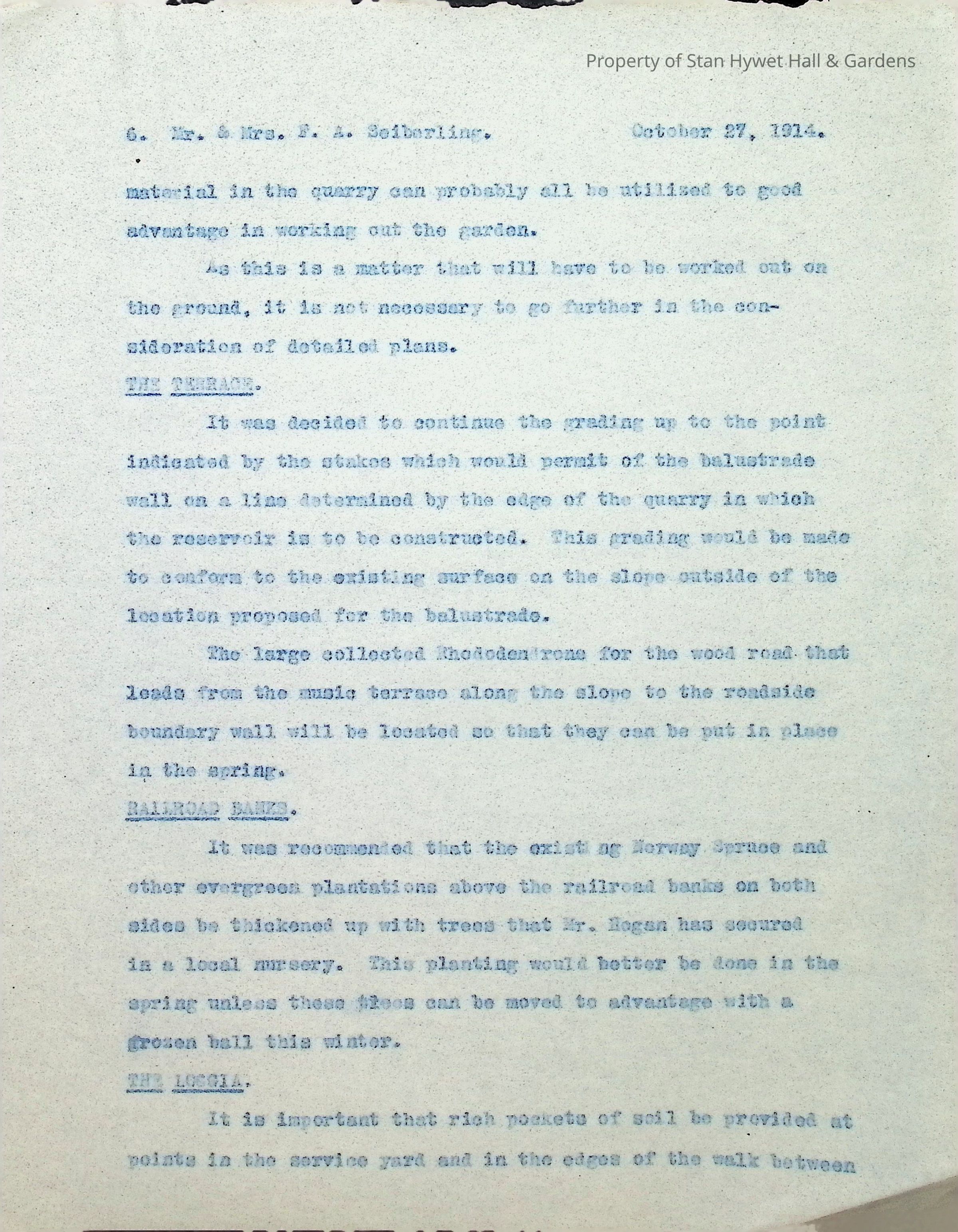 Carbon copy of a typewritten letter on Warren H. Manning letterhead, written to Mr. and Mrs. F.A. Seiberling, Akron, Ohio and dated October 27th, 1914 regarding updates on the plantings around the property, specifically the approval of the trees already planted. He also discusses the trees and plantings at the entrance gate and around the wall, the garage, "the lawn garden", "pleached alley" (likely the birch tree allee), "flower garden" referencing the movement of plants temporarily stored here to their permanent locations, "the rose garden", "the Sycamore vista", "the English garden", "the Japanese garden", "the terrace", "railroad banks", "the loggia", "the service drive", "the lagoon". "lagoon construction", "the entrance", and "the nursery." It is noted at the bottom that copies were sent to Mr. Seiberling, Mrs. Seiberling, Mr. Palmer, Mr. Dennis, and Mr. Hogan.Subject