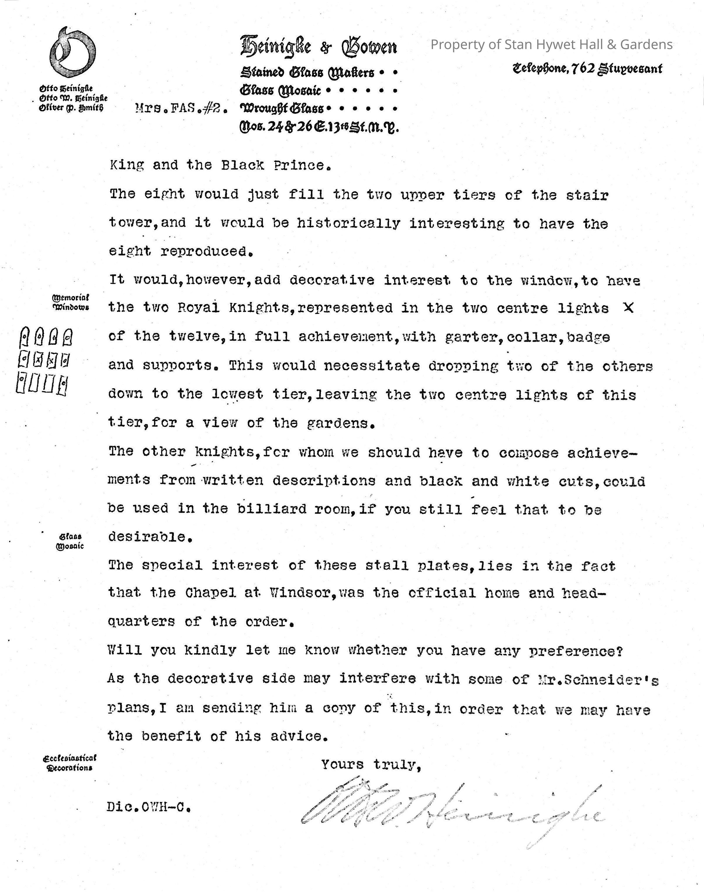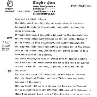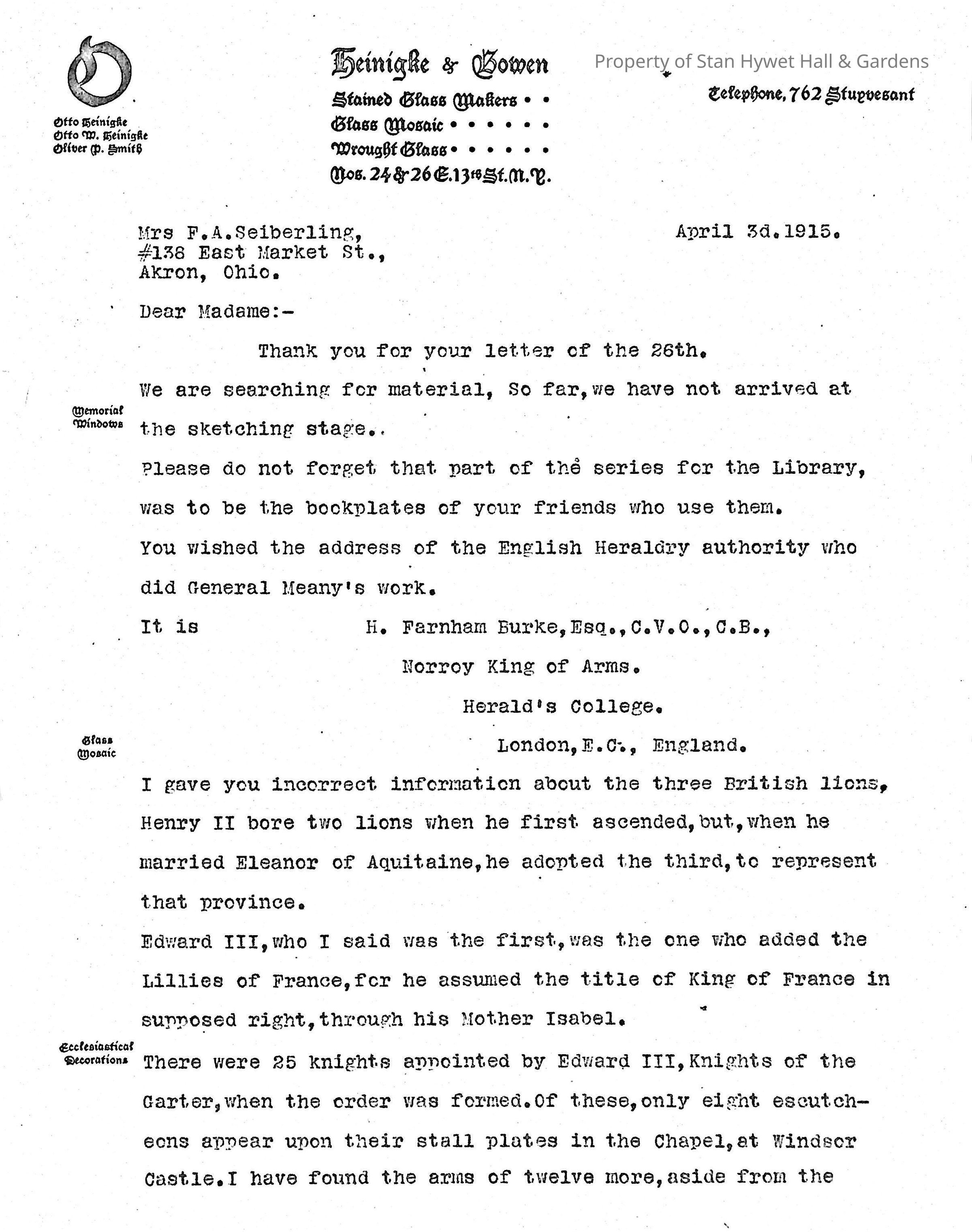 Typewritten letter on Heinigke & Bowen letterhead, written to Mrs. F.A. Seiberling in Akron, Ohio and dated April 3d, 1915 regarding the design and the history of the heraldry and escutcheons used for the windows in the tower and their placements.Subject