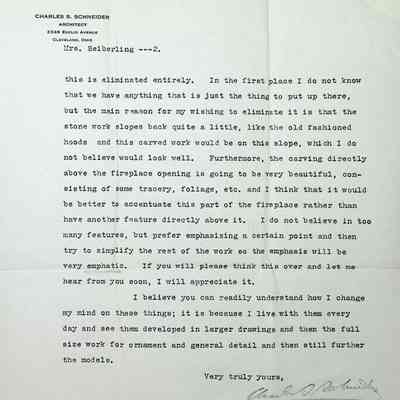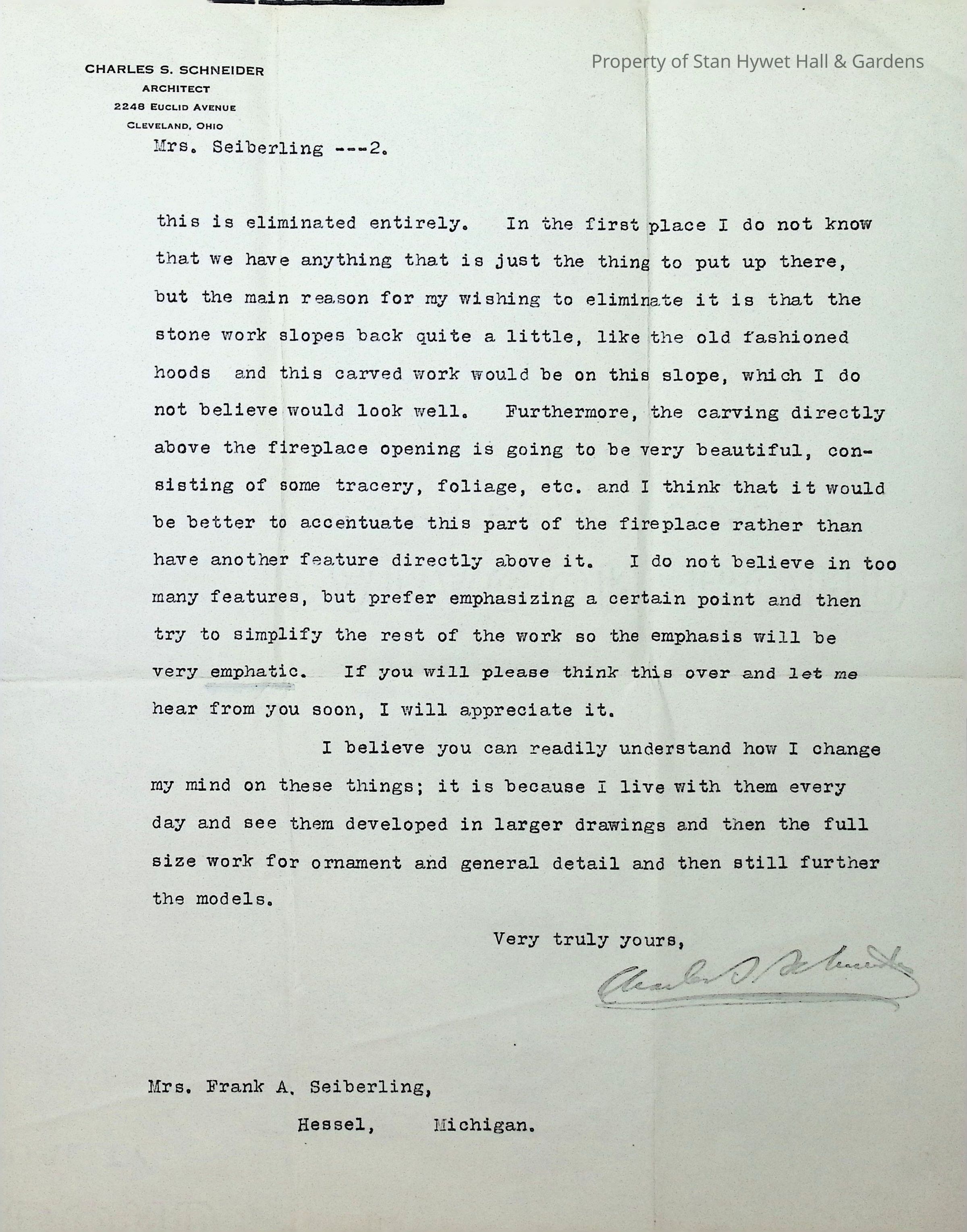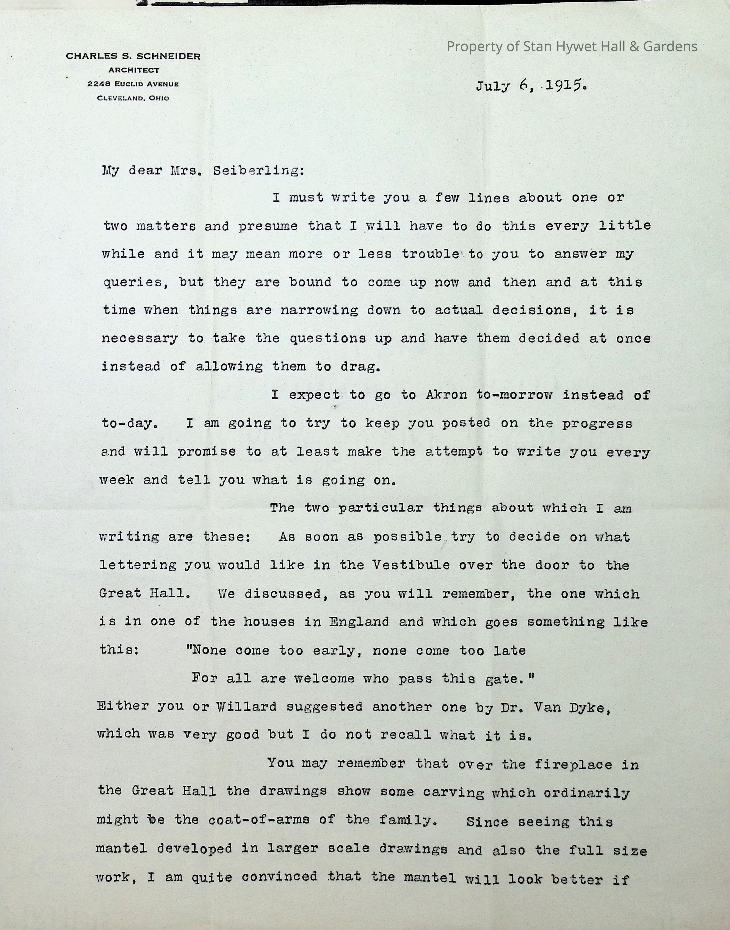 Typewritten letter on Charles S. Schneider letterhead, written to Mrs. Frank A. Seiberling, Hessel, Mich. and dated July 6, 1915 regarding lettering for the message above the vestibule doorway and fireplace drawings in the Great Hall.Subject