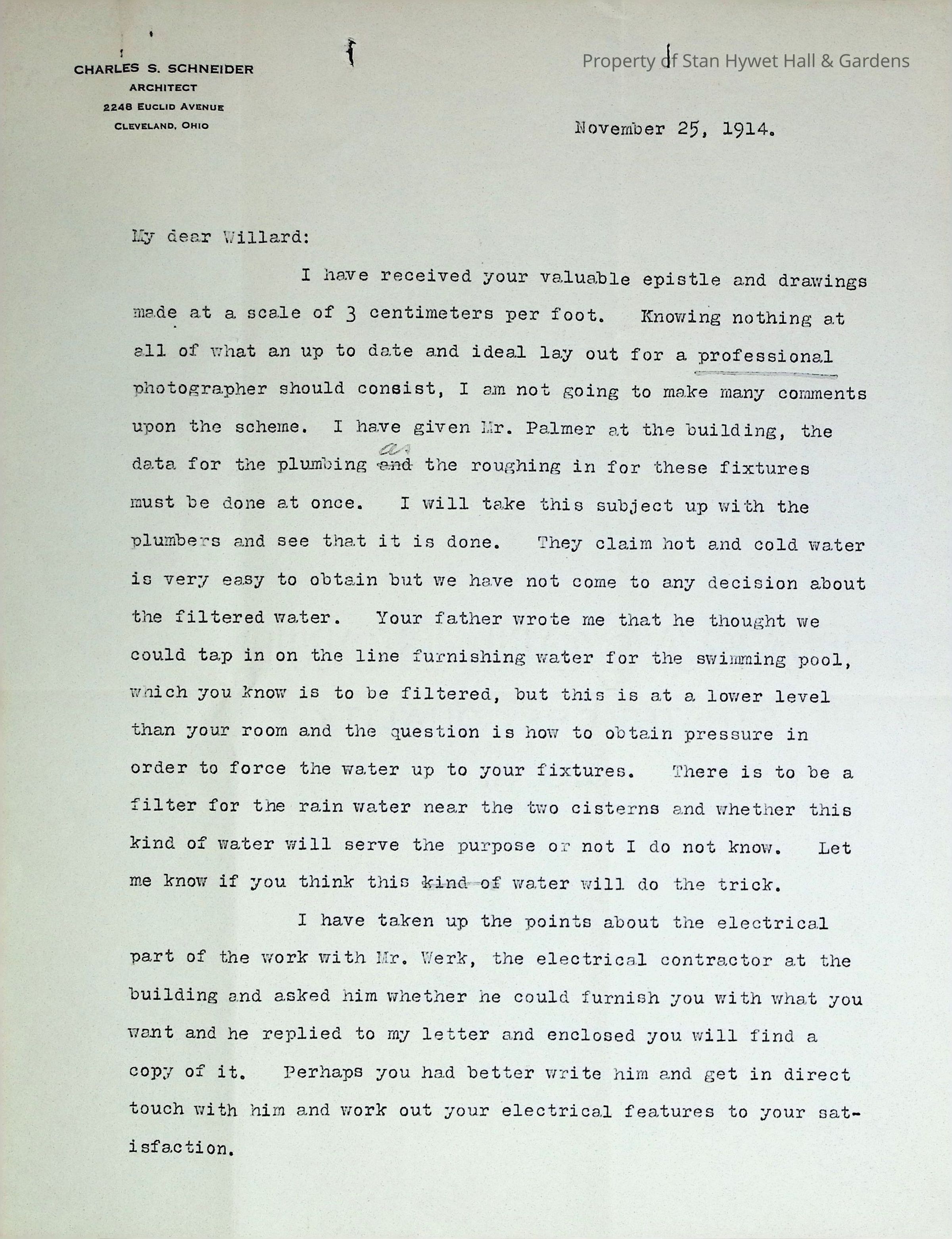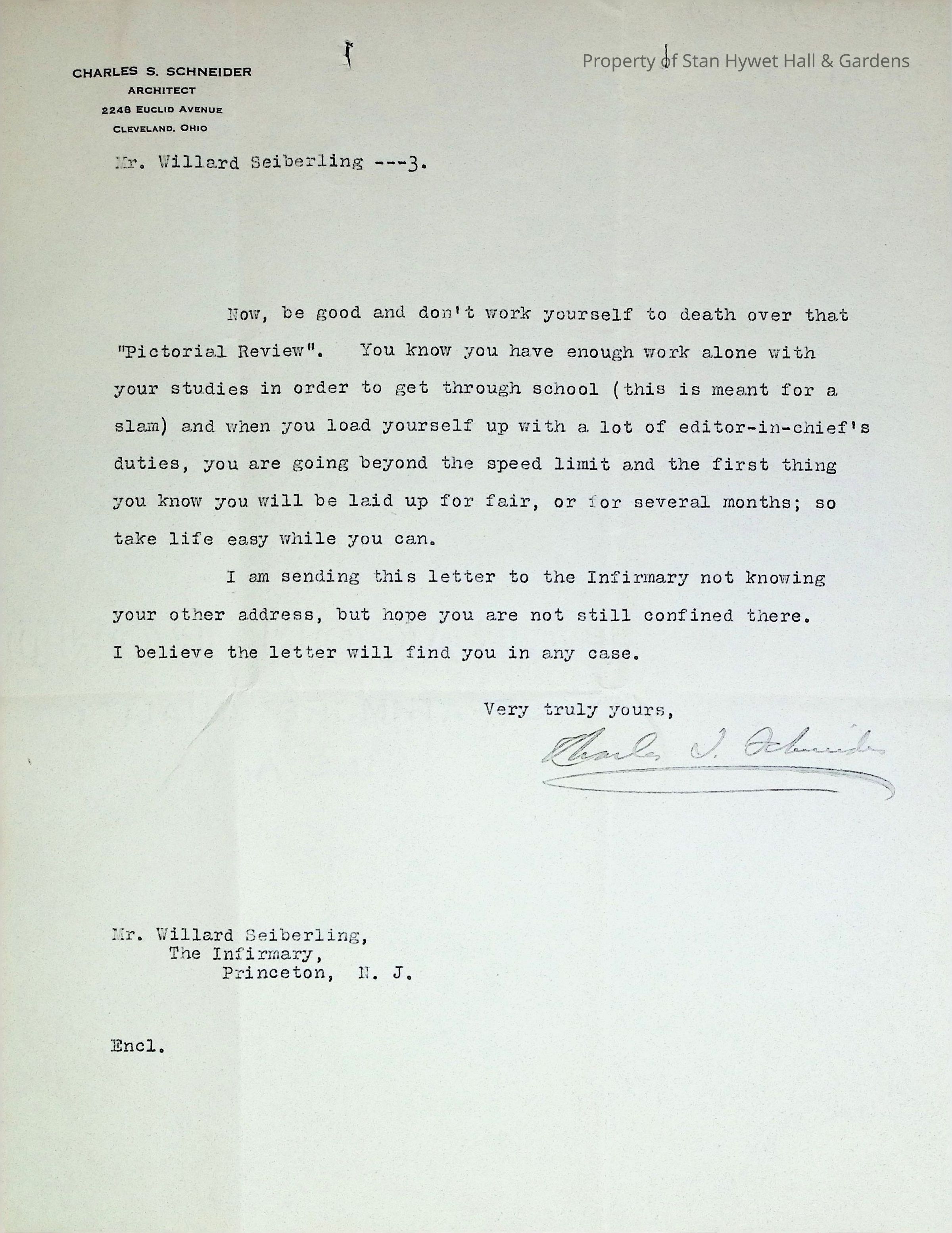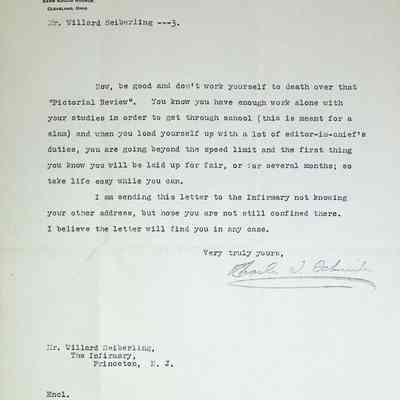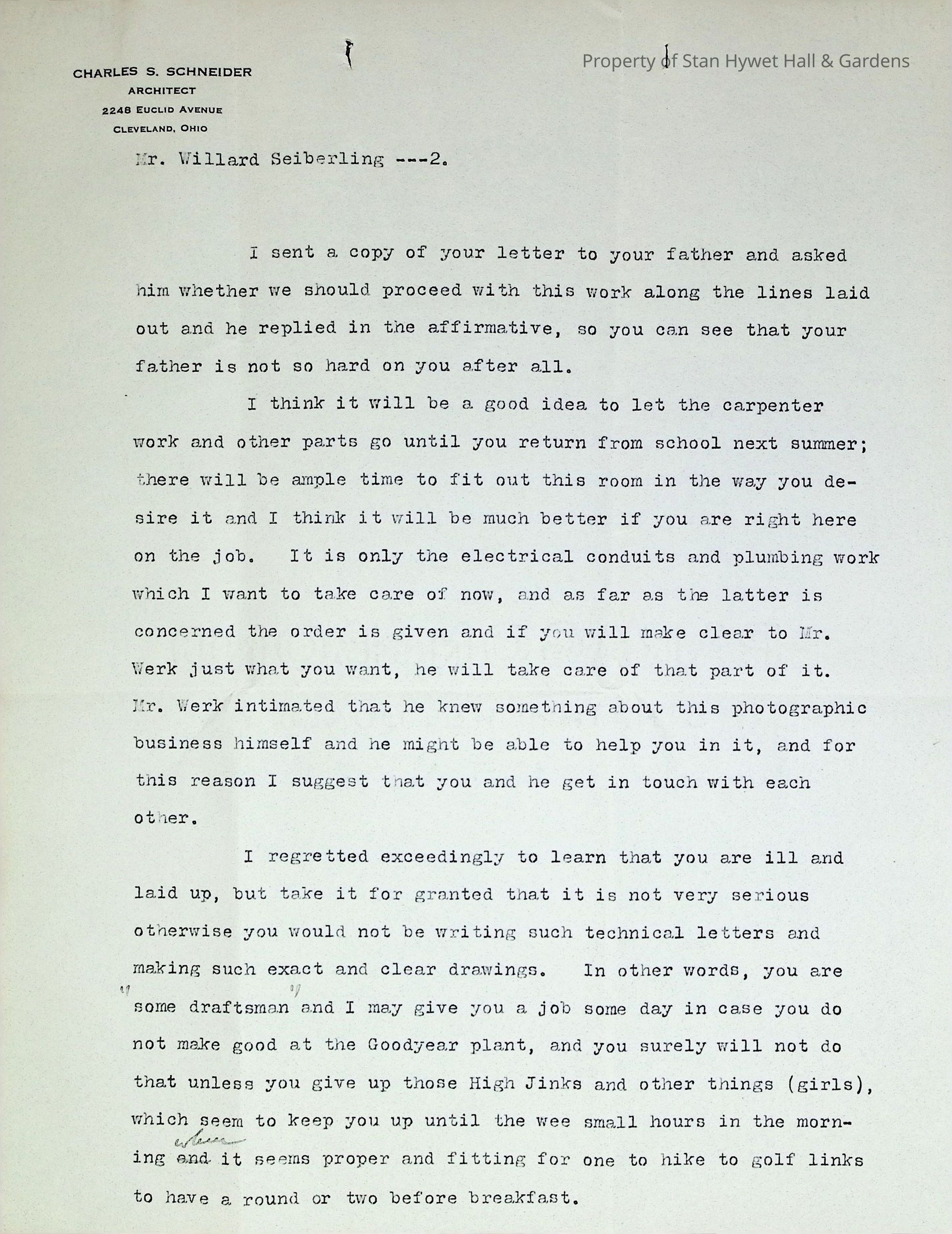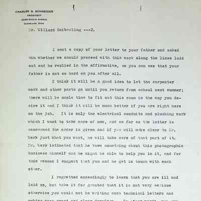 Typewritten letter from Charles S. Schneider to Willard Seiberling regarding the specifications of the requested Darkroom stating that they will concentrate on the plumbing and electrical and let Willard handle the details of carpenter work when he is home from school. He goes on to mention that Willard has been ill and jokingly talks about the "High Jinks" he's been up to and not to work to hard on the Princeton Pictorial Review.Subject