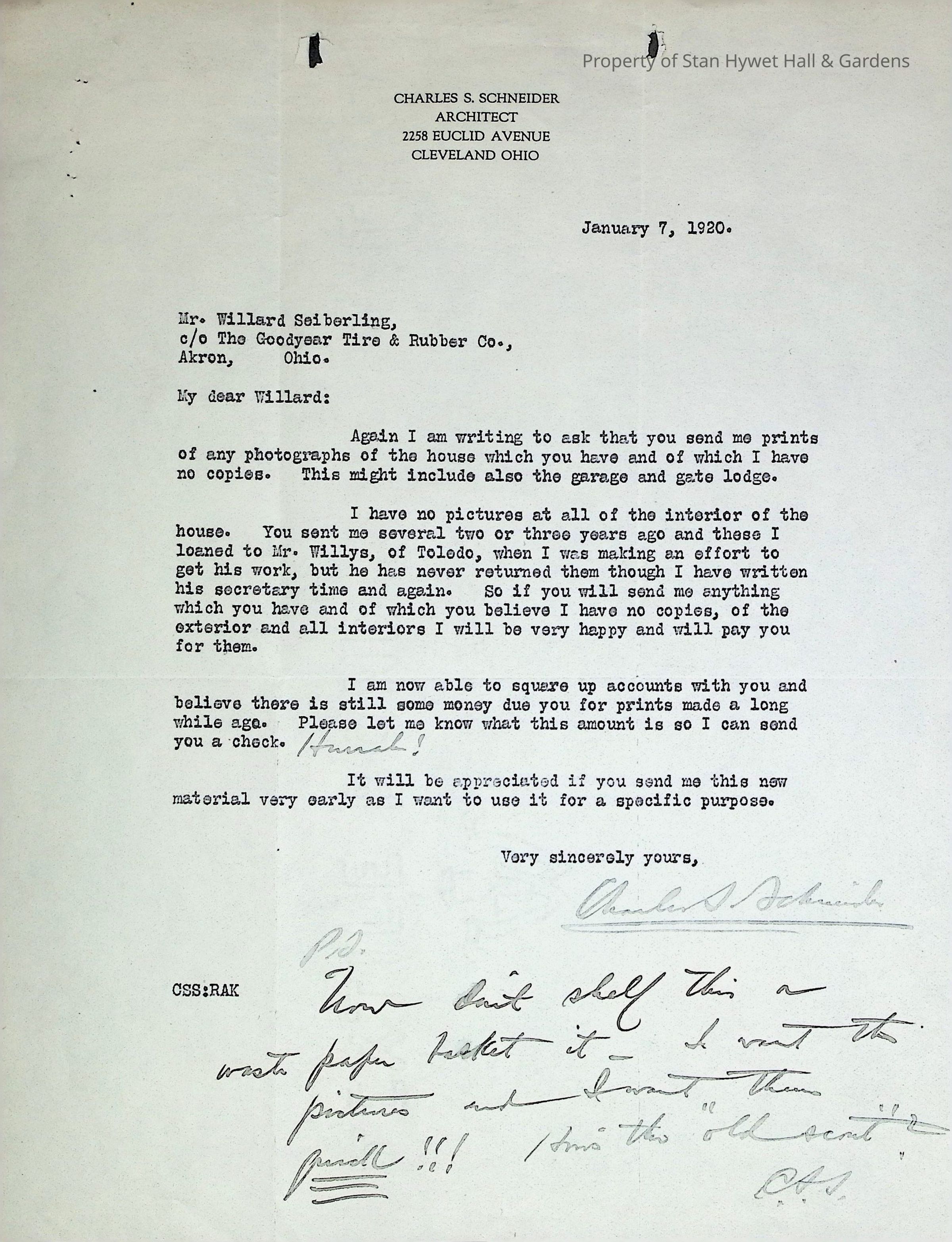 Typewritten letter from Charles S. Schneider to Willard Seiberling requesting photographs including "the garage and gate lodge" and interiors, offering payment for the prints. Written on Charles S. Schneider letterhead and signed in pencil. There is also a handwritten post script. "P.S. Now don't shelf this or waste paper basket it - I want these pictures and I want them quick!!! How's that "old scout" ? C.S.S."Subject