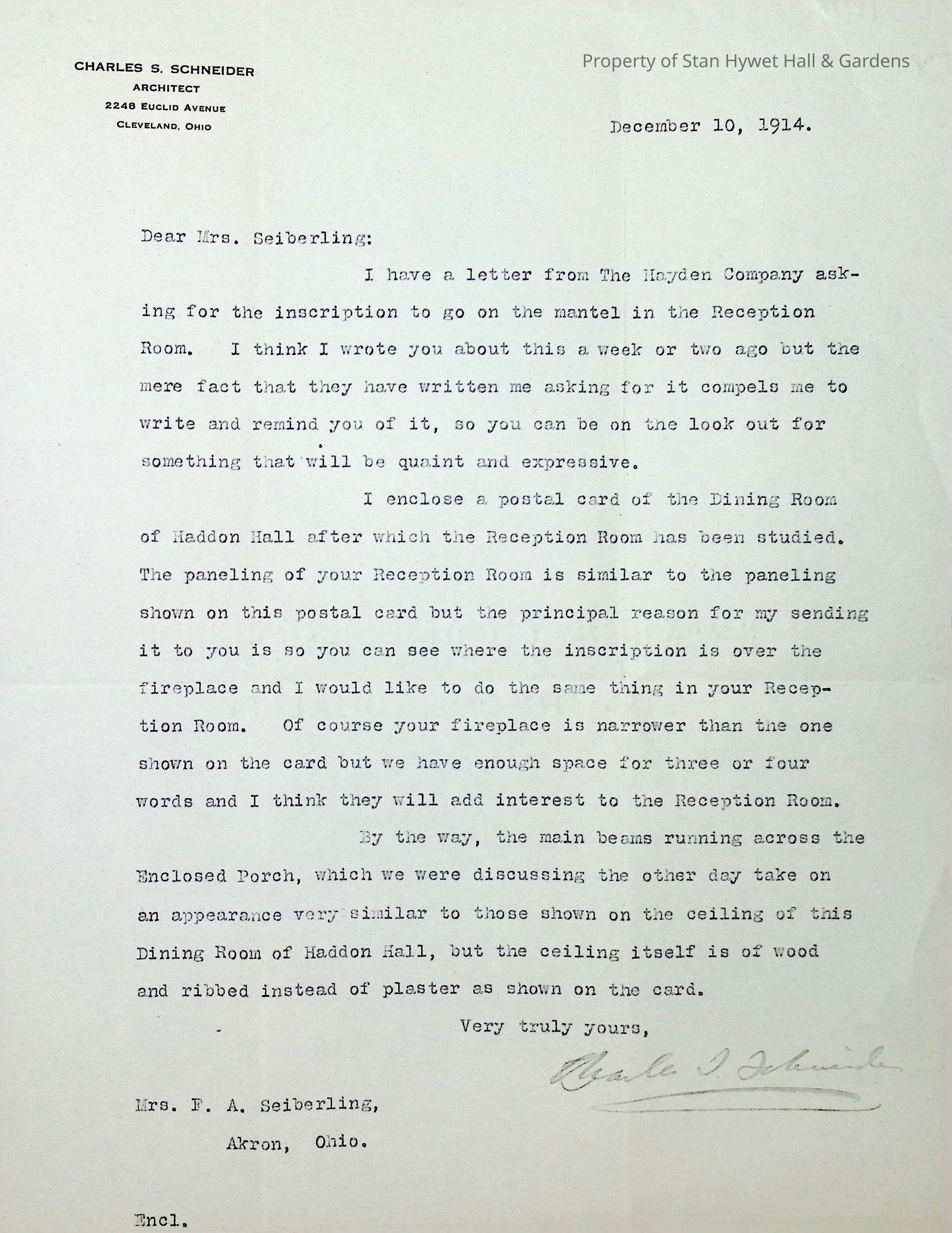 Typed letter from architect Charles S. Schneider to Gertrude Seiberling requesting the inscription to go on the mantel of the Reception Room. The letter indicates a post card of the Dining Room at Haddon Hall was included as it was the inspiration for the design of the Reception Room. It also mentions the beams in the "Enclosed Porch" (West Porch) resemble those in the Haddon Hall Dining Room. Written on Schneider's letterhead and signed in pencil.Subject