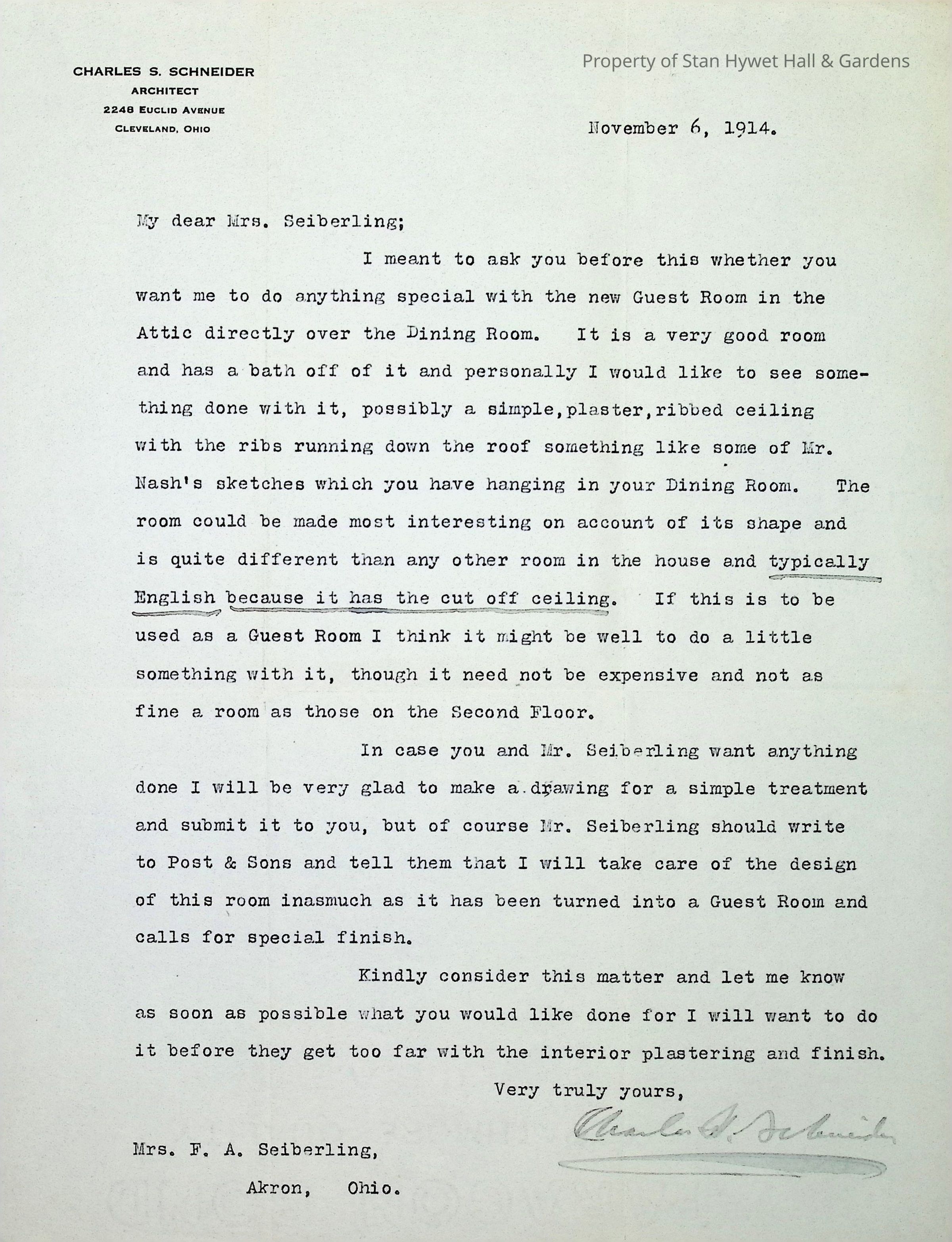 Typewritten letter from architect Charles S. Schneider to Gertrude Seiberling requesting how the ceiling in the "new Guest Room in the Attic directly over the Dining Room" should be finished and advising Mr. Seiberling to advise Post & Sons that this room is now under his purview since it was changed from a service area to a guest room. Written on Schneider's letterhead and signed in pencil.Subject