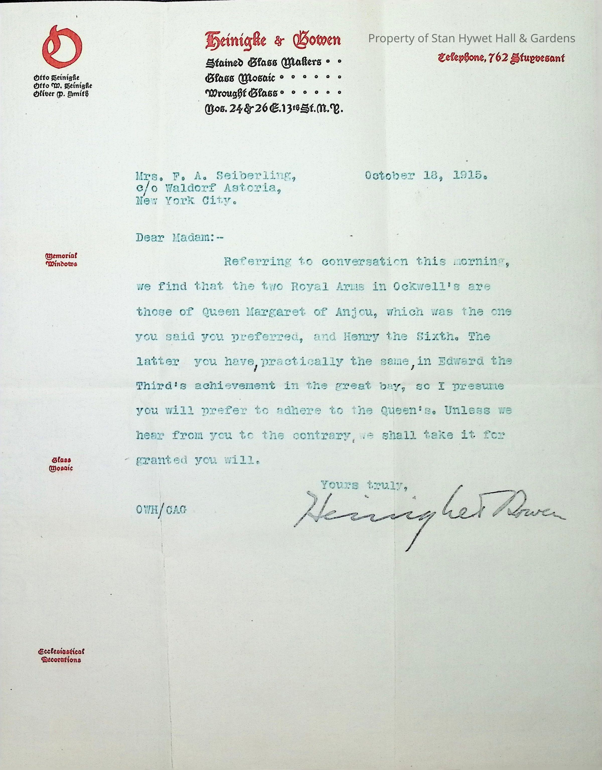 Typewritten letter from Heinigke & Bowen to Mrs. F. A. Seiberling confirming the use of the Royal Arms of Queen Margaret of Anjou over that of Henry the Sixth in the tower windows. Written on Heinigke & Bower letterhead and signed in pencil.Subject