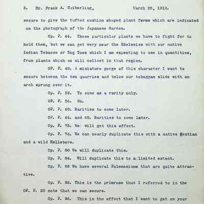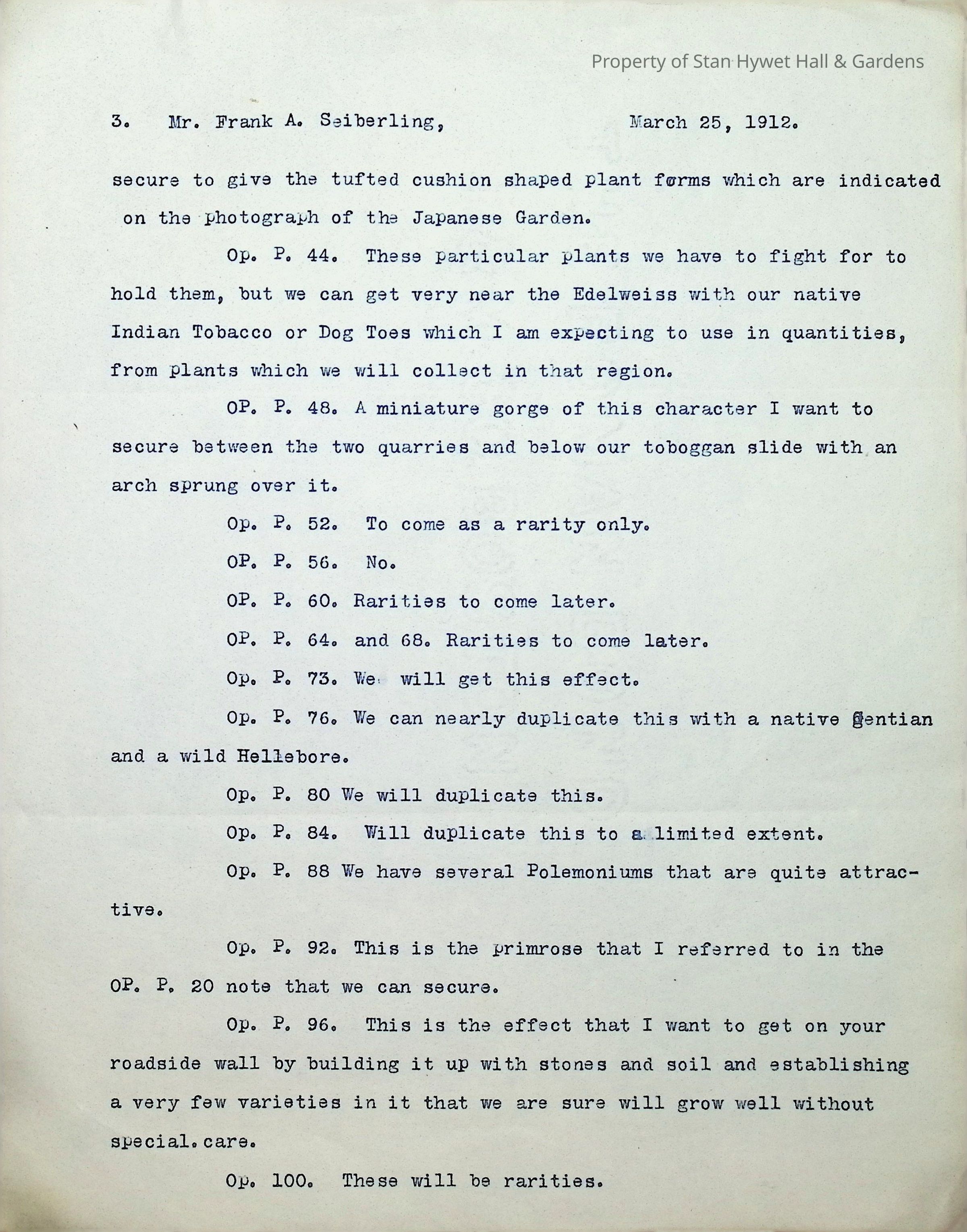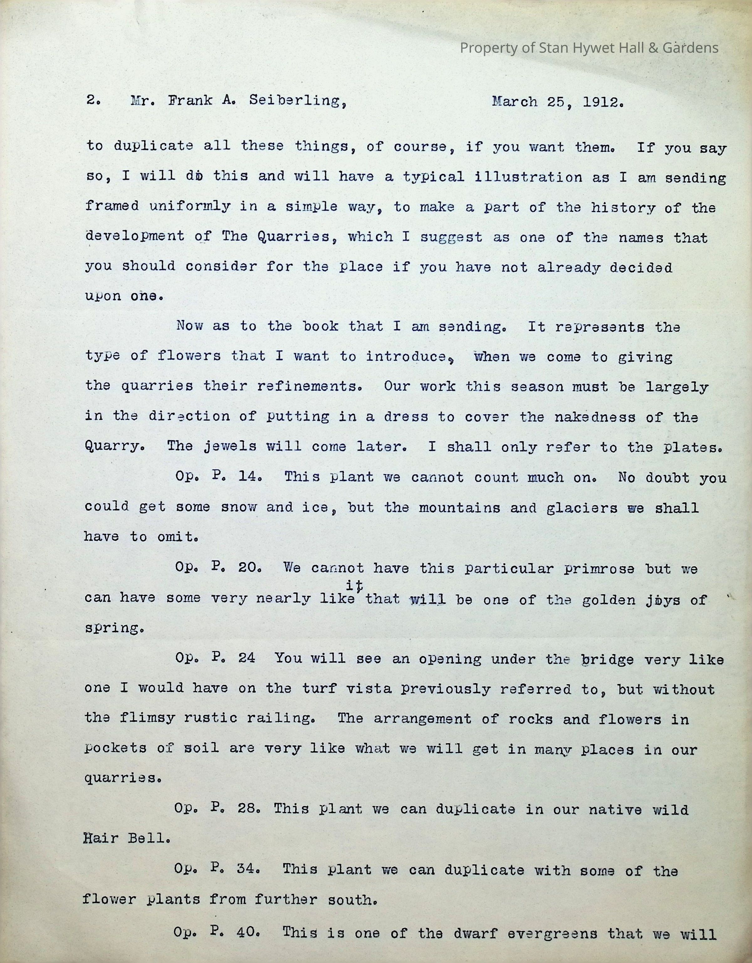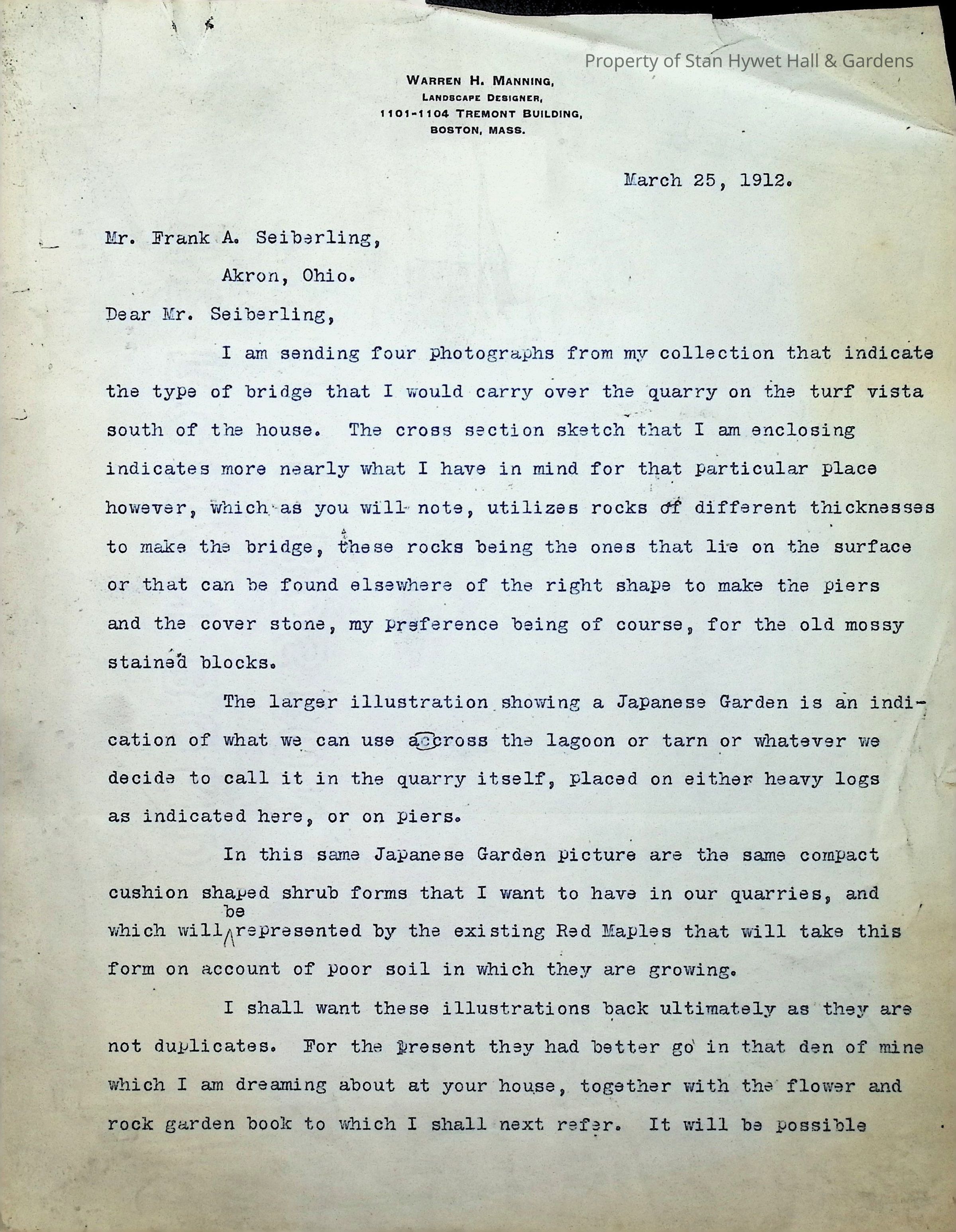 Typewritten letter on Warren H. Manning letterhead, written to Mr. Frank A. Seiberling in Seattle, Washington and dated March 25th, 1912 regarding updates on the construction of Stan Hywet Hall, specifically the type of bridge he has in mind for the "quarry on the turf vista south of the house." This is likely in the Dell. He includes a drawing of the Japanese Garden. He states that these are original drawings which have no copies and he jokingly mentions putting them into his den that he is dreaming of having at the house. He mentions that he is having all of his drawings "framed uniformly in a simple way" to document the development of the quarries. He uses almost 5 pages to reference plants from a book he has included, describing how each could be incorporated into the design.Subject