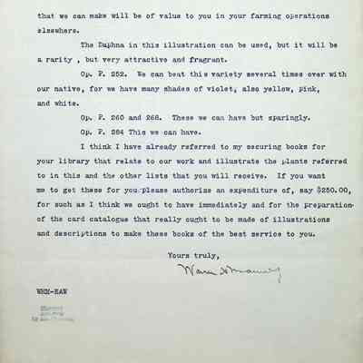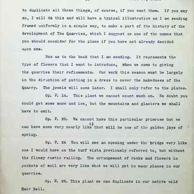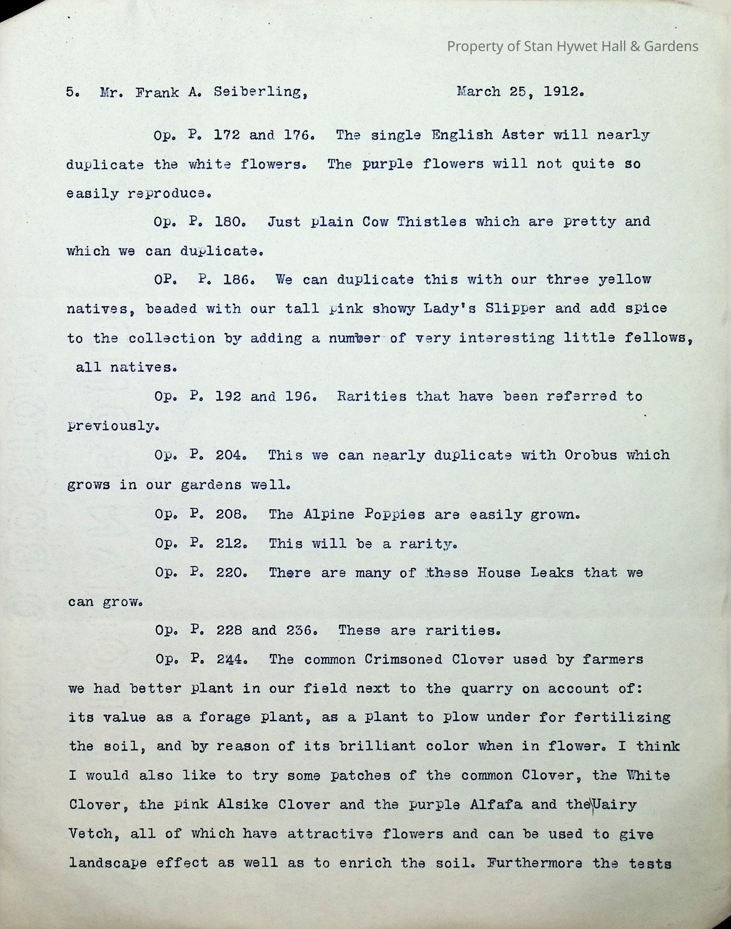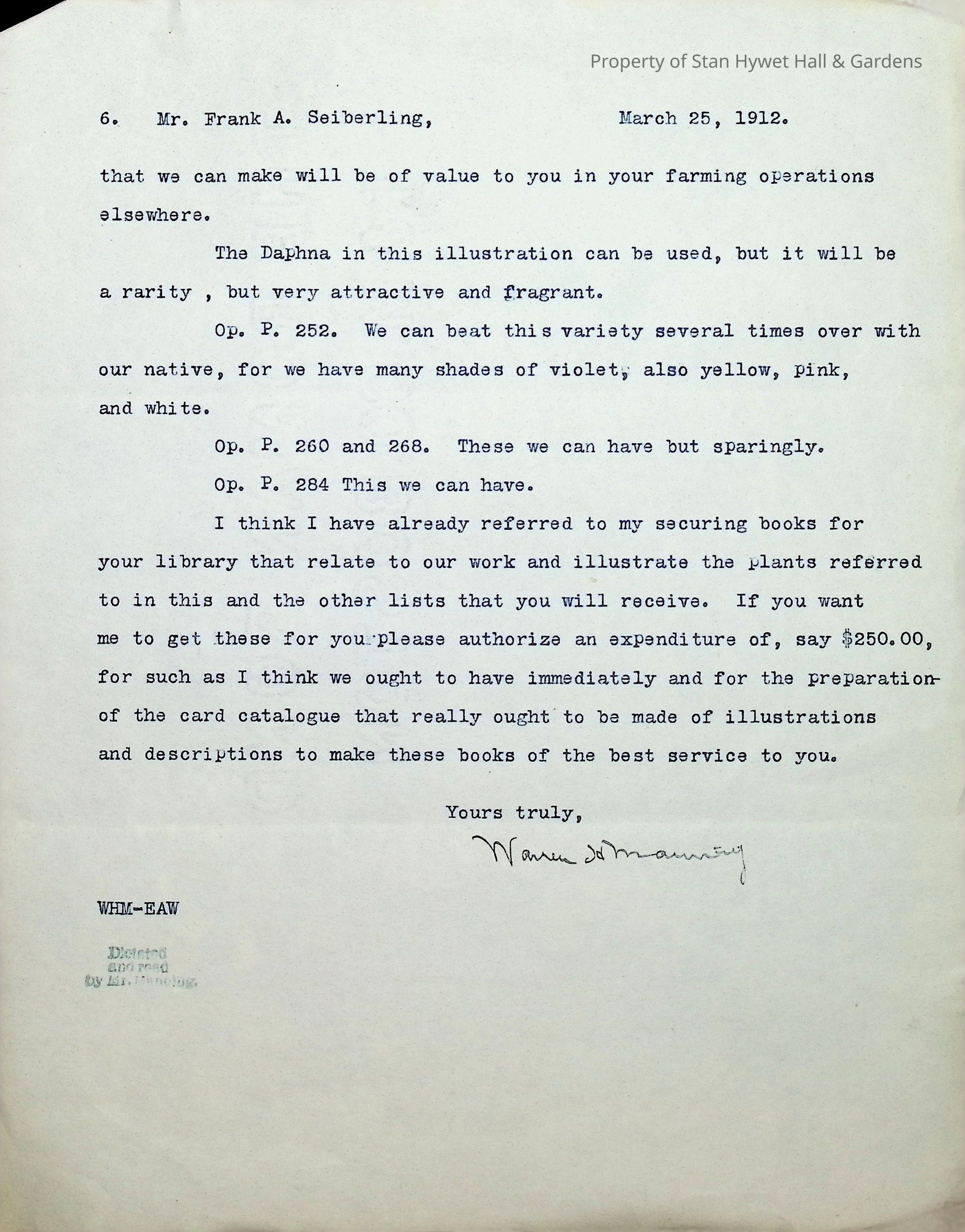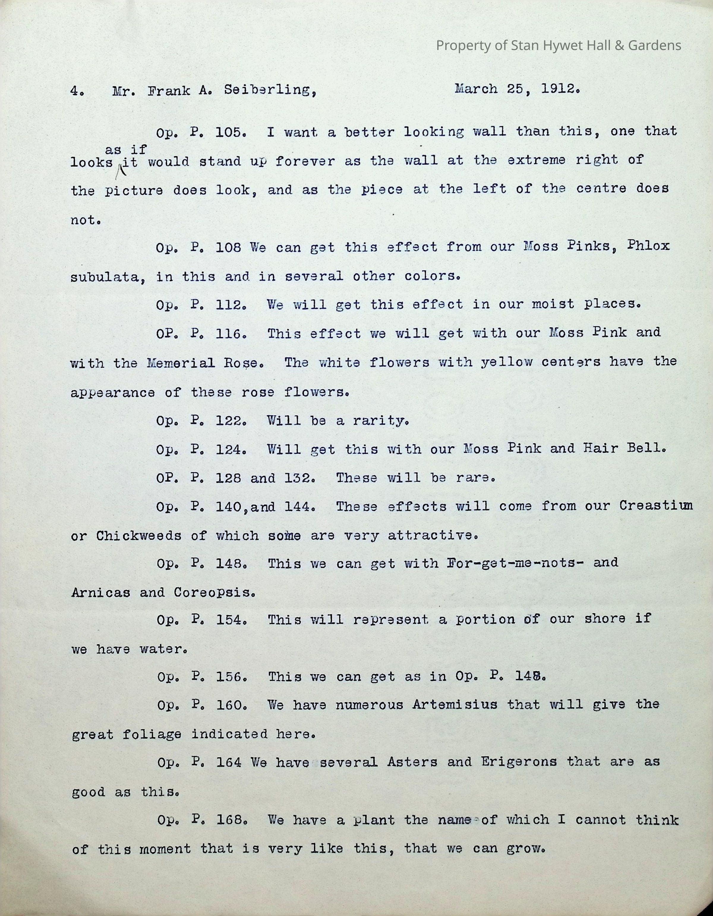 Typewritten letter on Warren H. Manning letterhead, written to Mr. Frank A. Seiberling in Seattle, Washington and dated March 25th, 1912 regarding updates on the construction of Stan Hywet Hall, specifically the type of bridge he has in mind for the "quarry on the turf vista south of the house." This is likely in the Dell. He includes a drawing of the Japanese Garden. He states that these are original drawings which have no copies and he jokingly mentions putting them into his den that he is dreaming of having at the house. He mentions that he is having all of his drawings "framed uniformly in a simple way" to document the development of the quarries. He uses almost 5 pages to reference plants from a book he has included, describing how each could be incorporated into the design.Subject