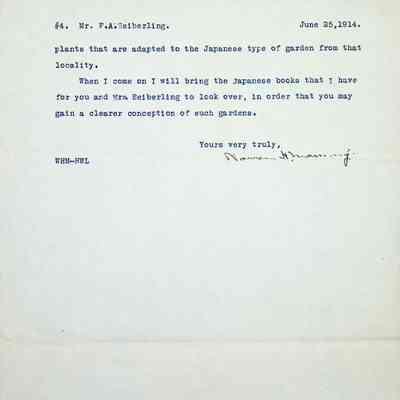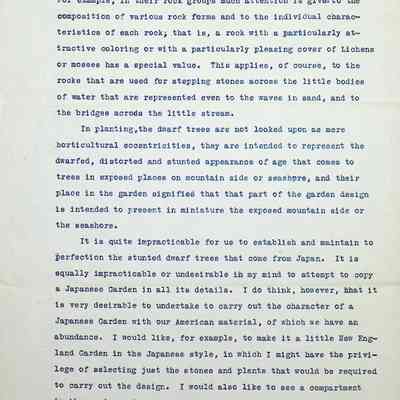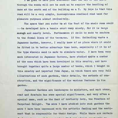 Typewritten 4 page letter on Warren H. Manning letterhead, from Warren Manning to F.A. Seiberling in response to a previous lettering regarding the placement of the gardens in relationship to the house. He specifically mentions the "drive through the woods" at the south end intended to be for pleasure use only. He speaks of the west side of the Music Room being the perfect location for tennis courts and that it is also the best location for the Japanese Garden. He goes into great detail on the specific characteristics of Japanese gardens and the importance of the dwarf species that must be used. The letter is signed in black ink.Subject